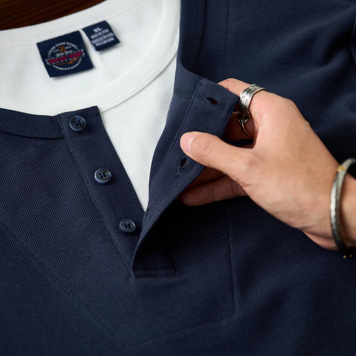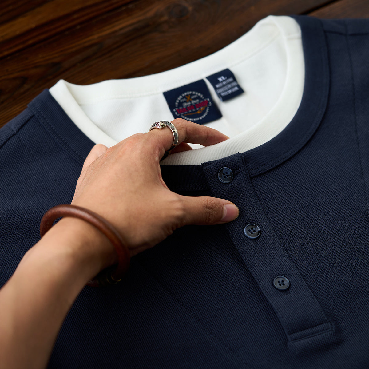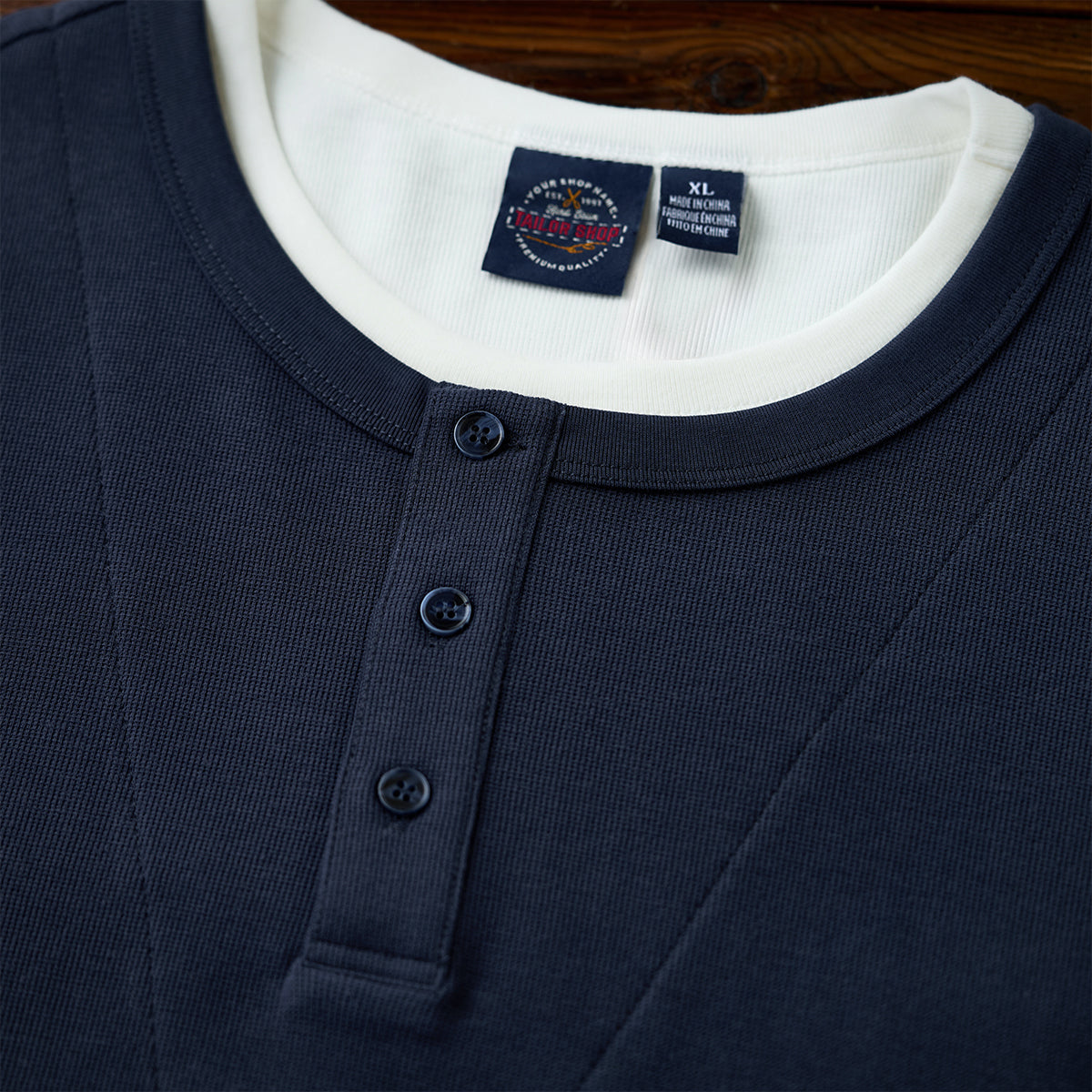 이너 레이어드 느낌의 헨리넥 티셔츠. 3버튼 여밈으로 세련되고 깔끔한 스타일을 완성합니다.