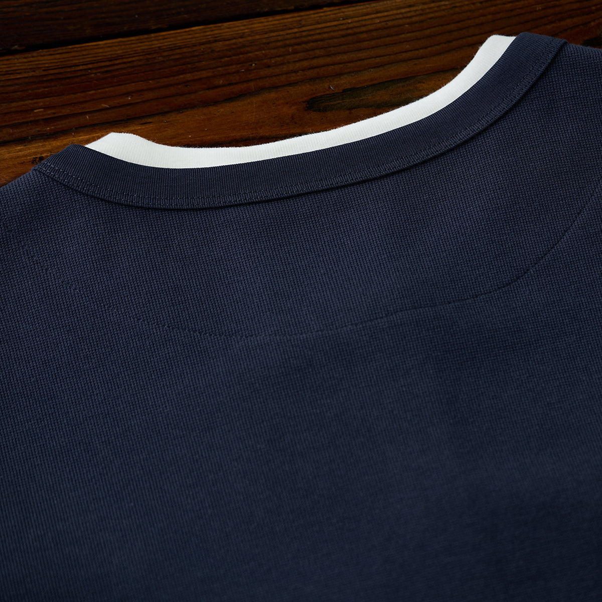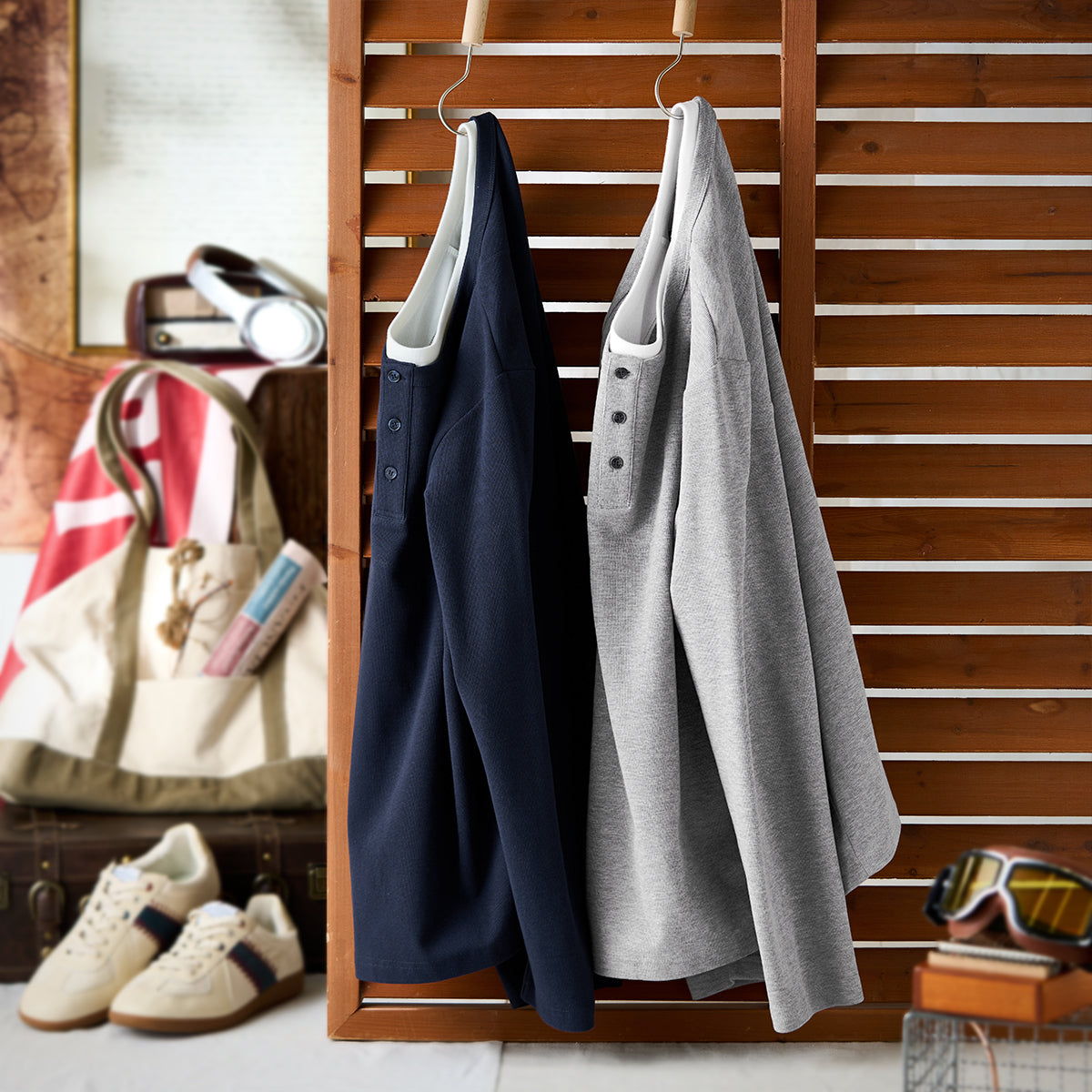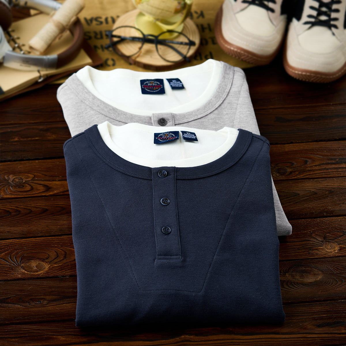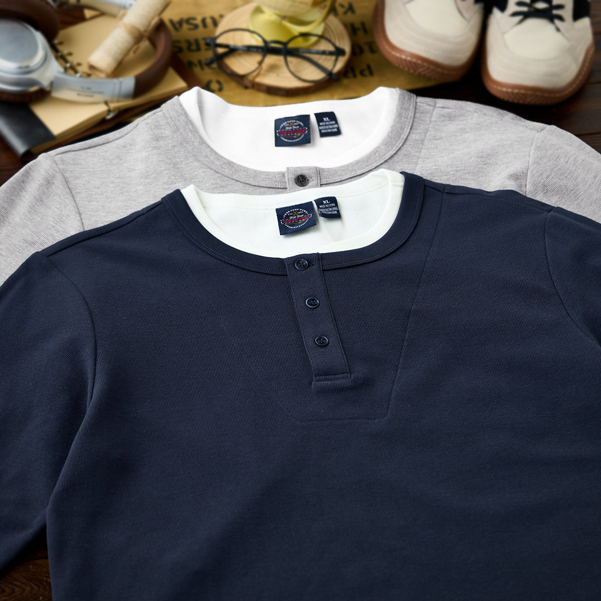 이너 레이어드 느낌의 헨리넥 티셔츠. 3버튼 여밈으로 세련되고 깔끔한 스타일을 완성합니다.