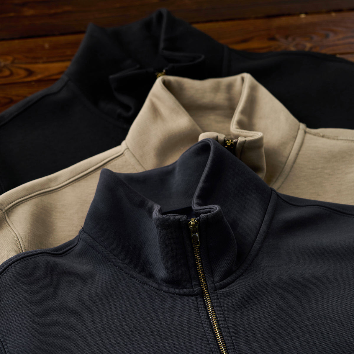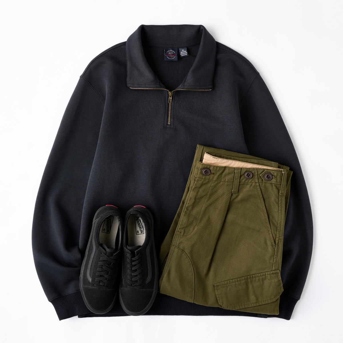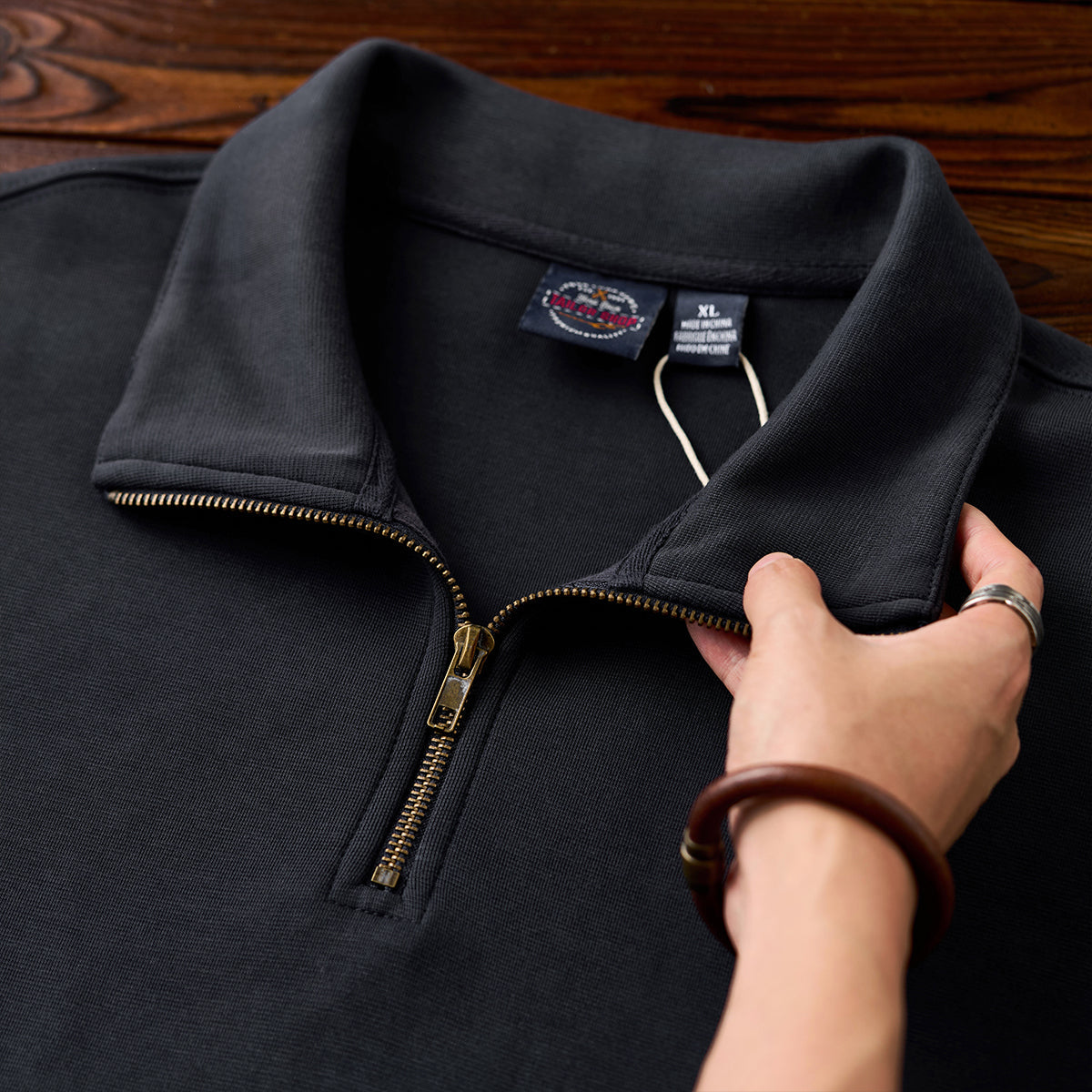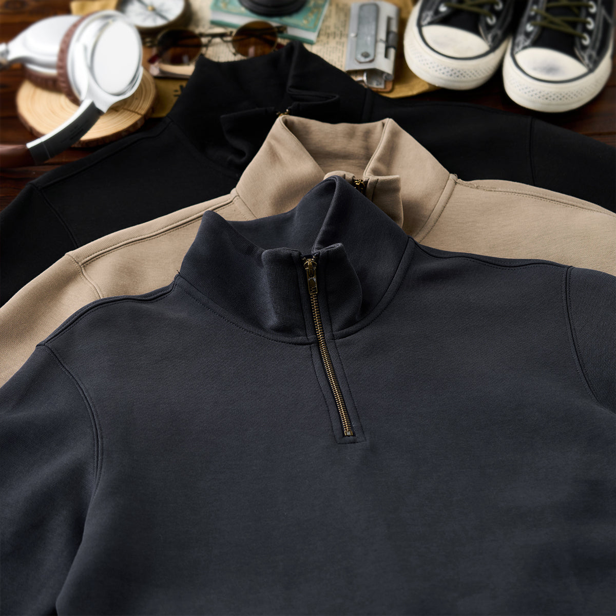 앤티크 브론즈 하프집업 디테일이 돋보이는 풀오버 스웨트. 심플하면서도 빈티지 감성을 살린 디자인입니다.