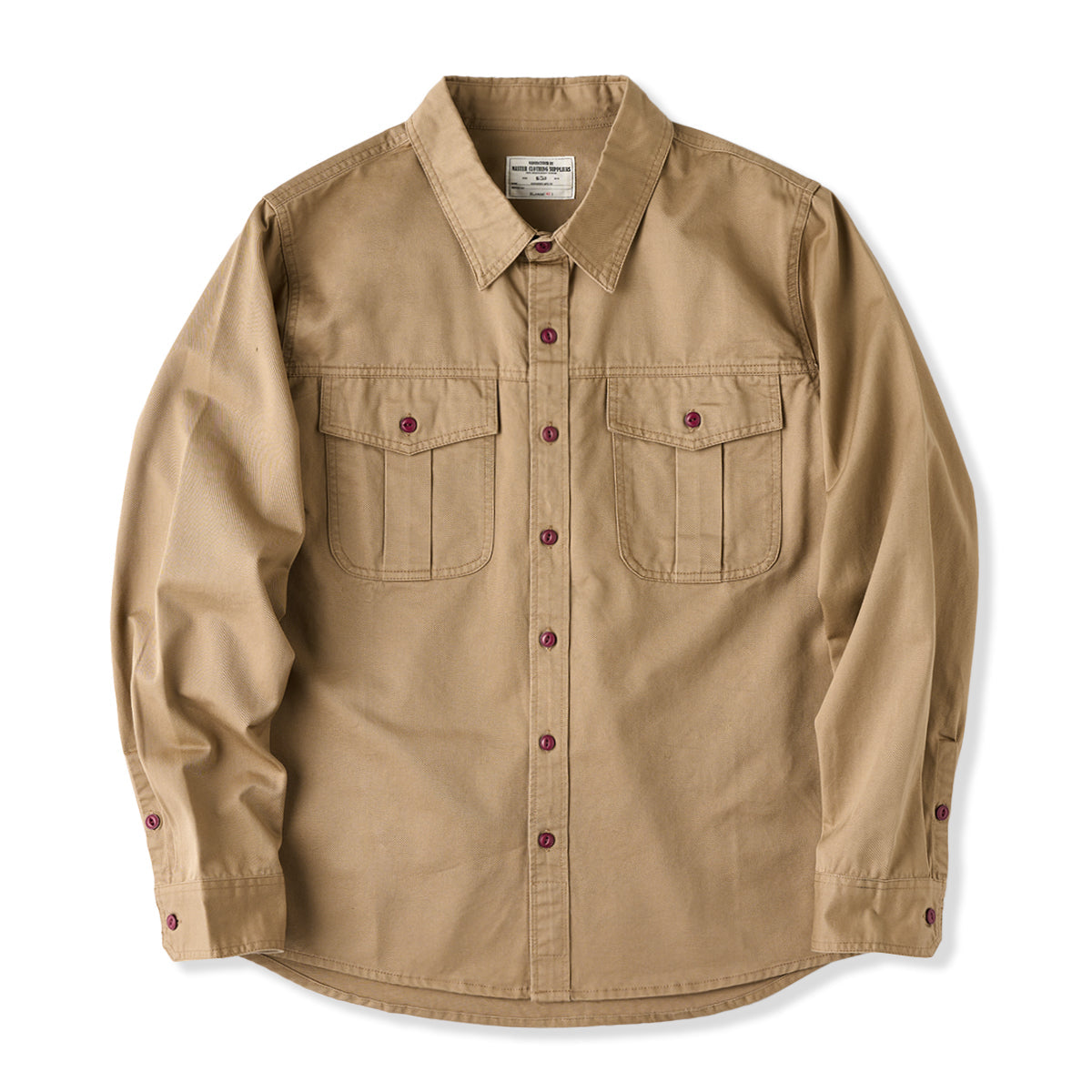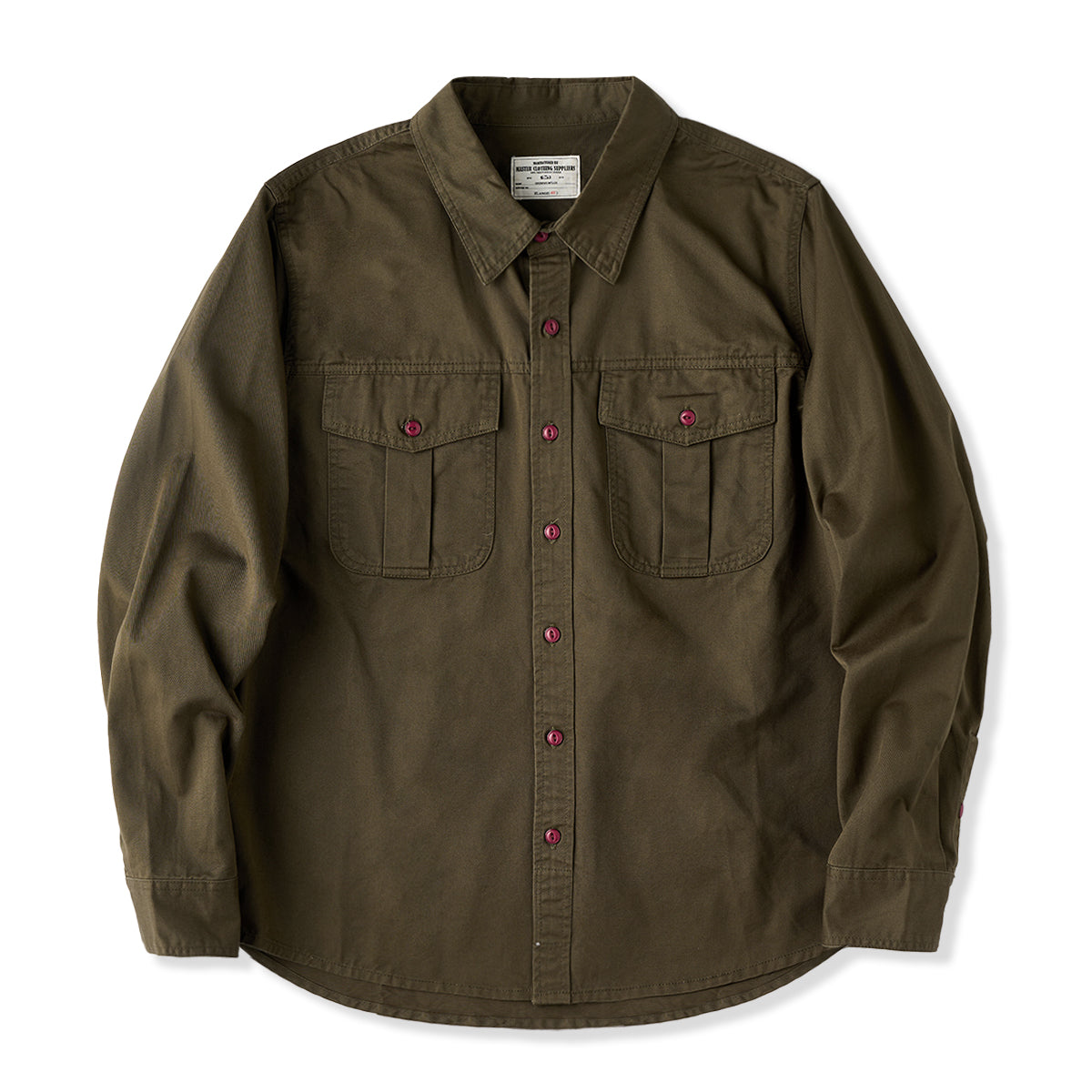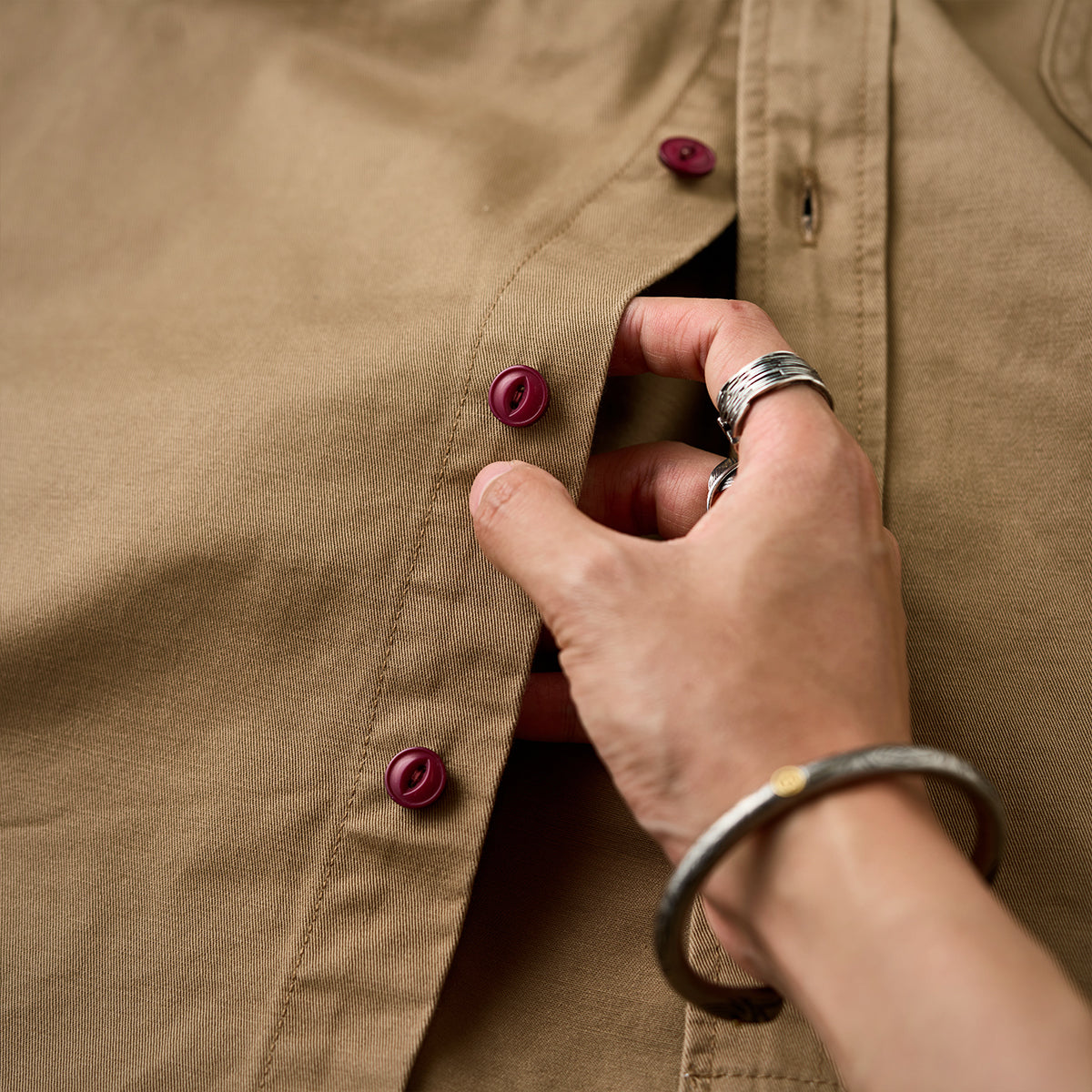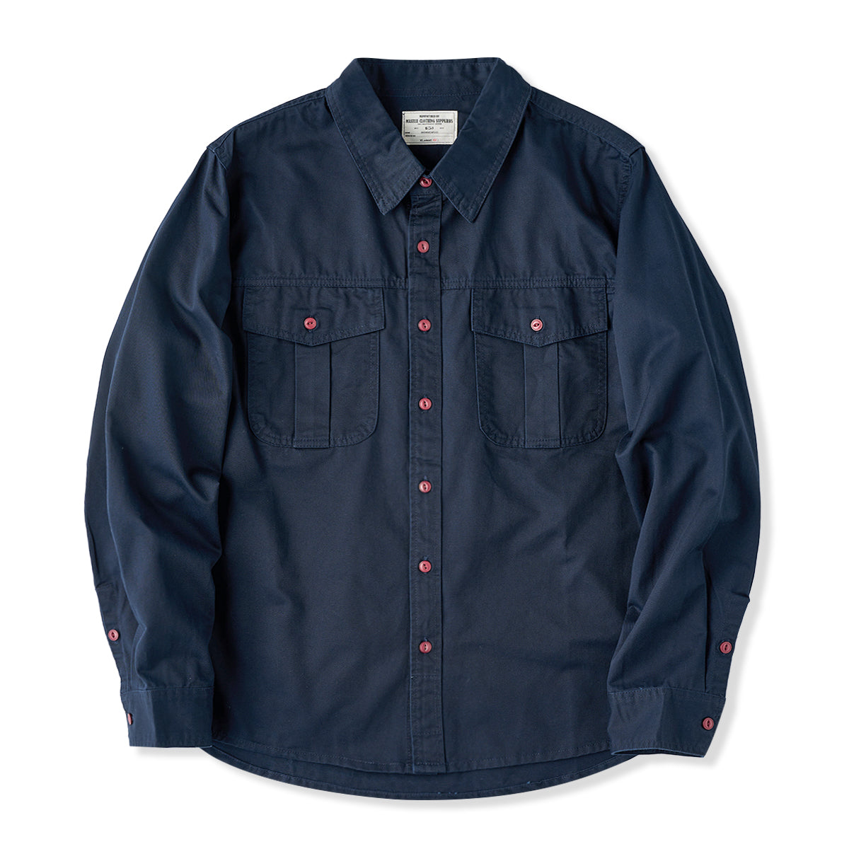 다크 레드 버튼과 플랩 포켓, 세로 스티치 디테일로 심플하면서도 개성과 실용성을 살린 워크 셔츠입니다.