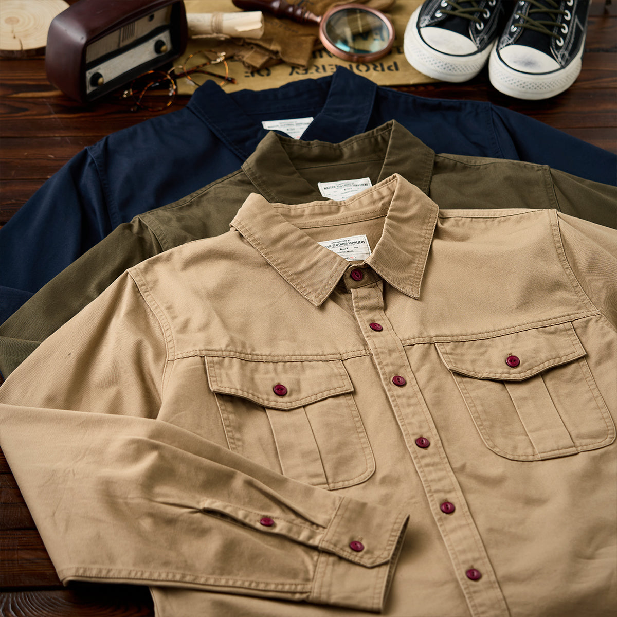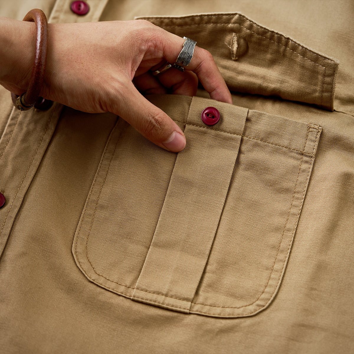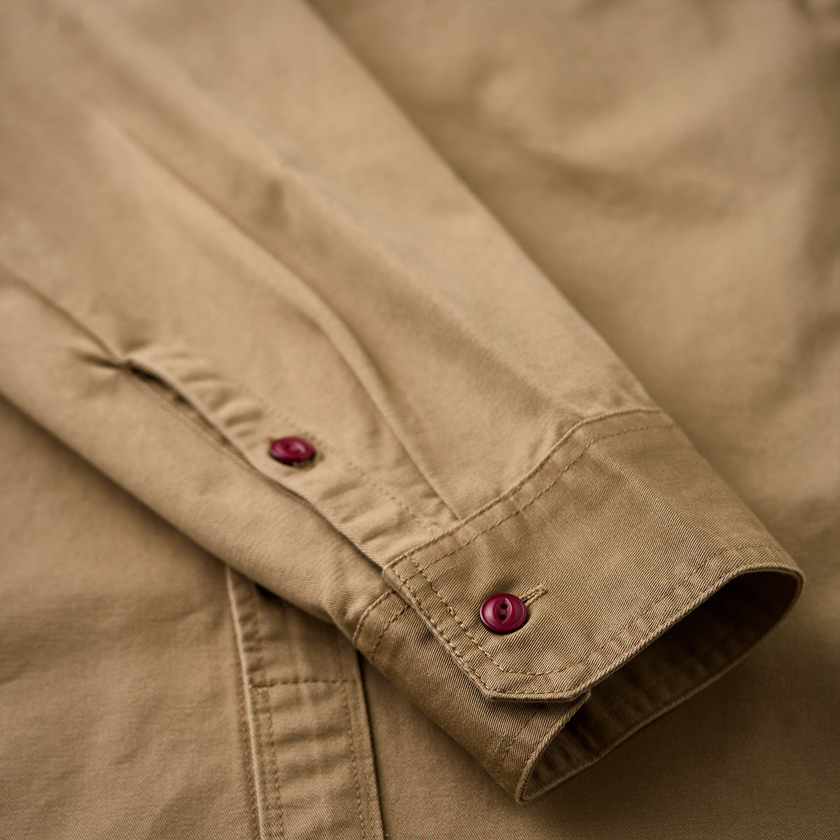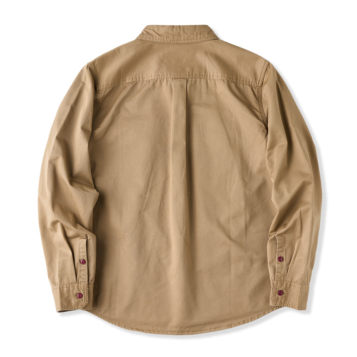 다크 레드 버튼과 플랩 포켓, 세로 스티치 디테일로 심플하면서도 개성과 실용성을 살린 워크 셔츠입니다.