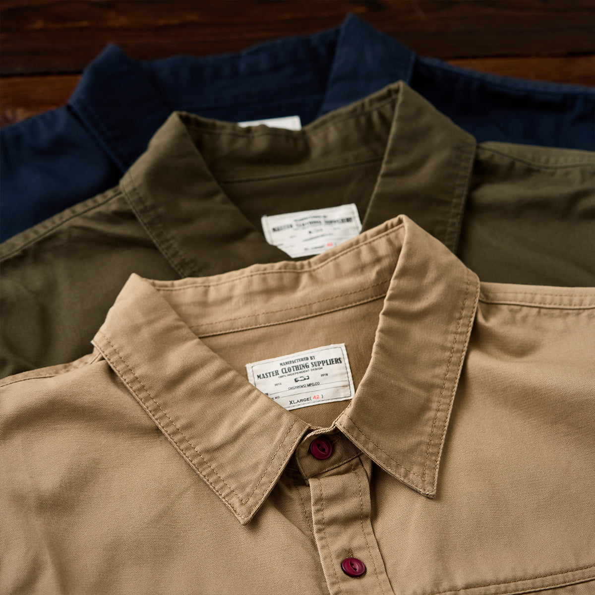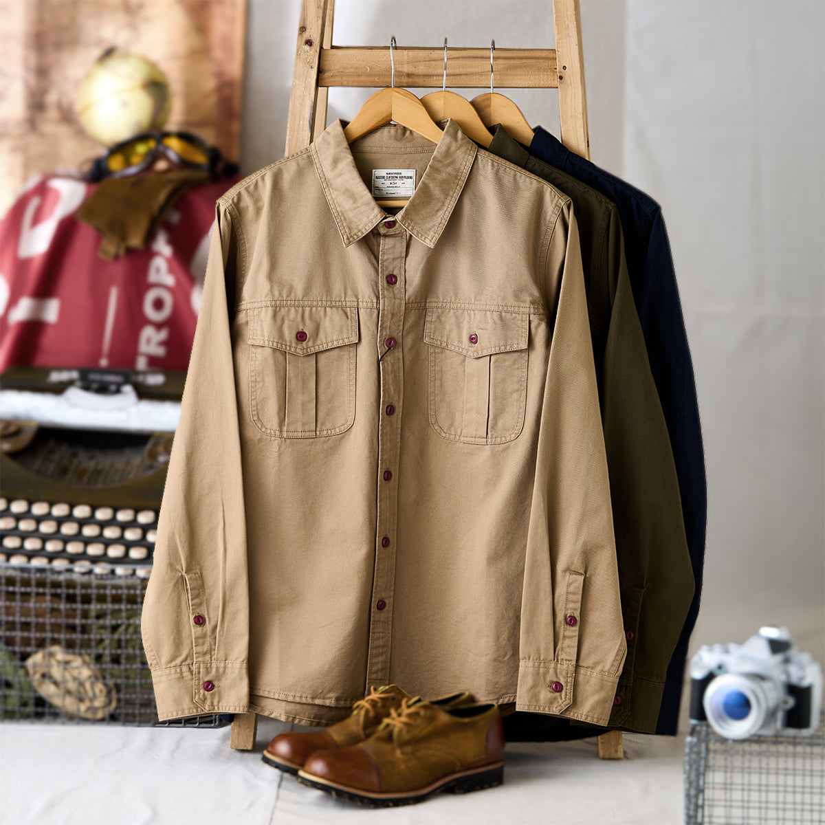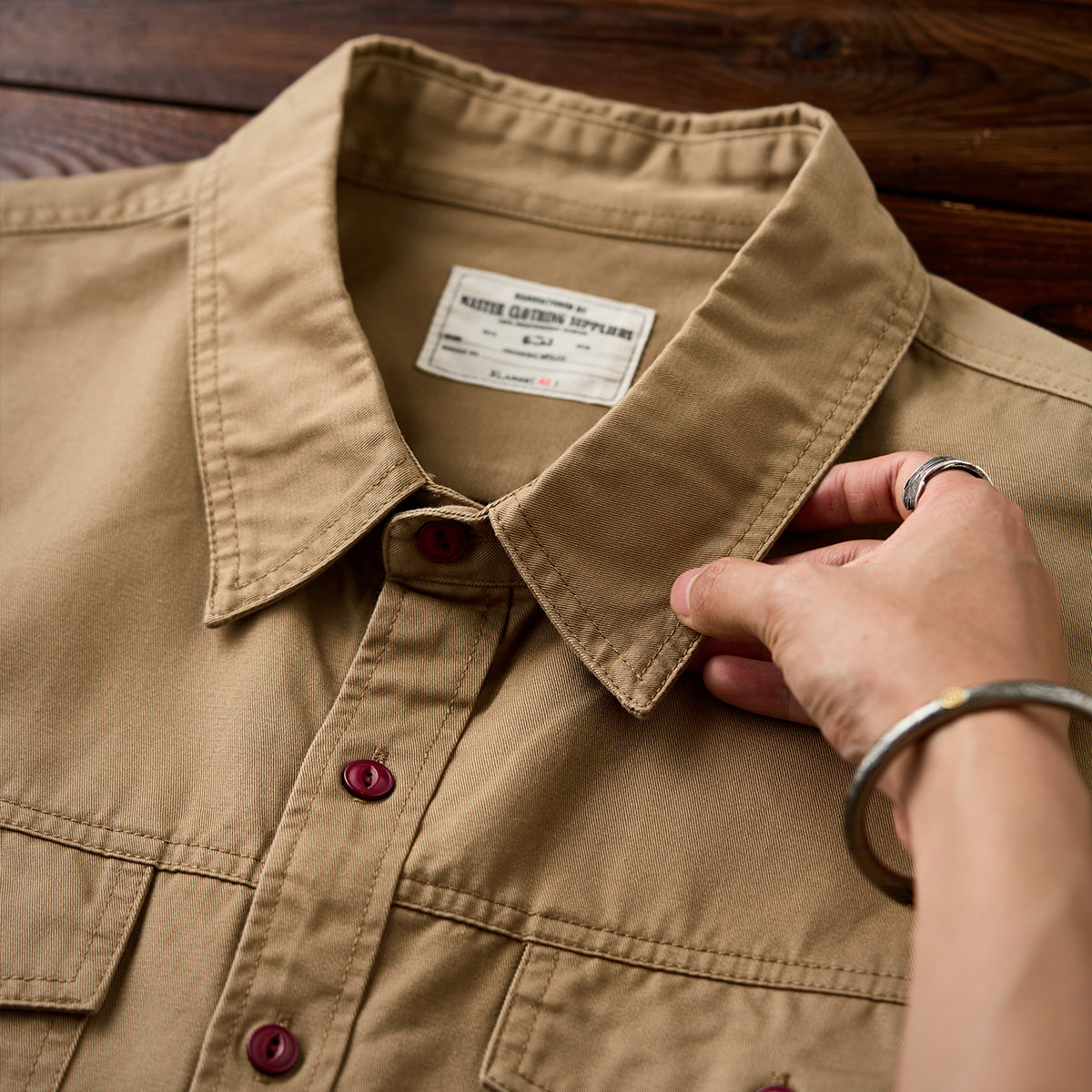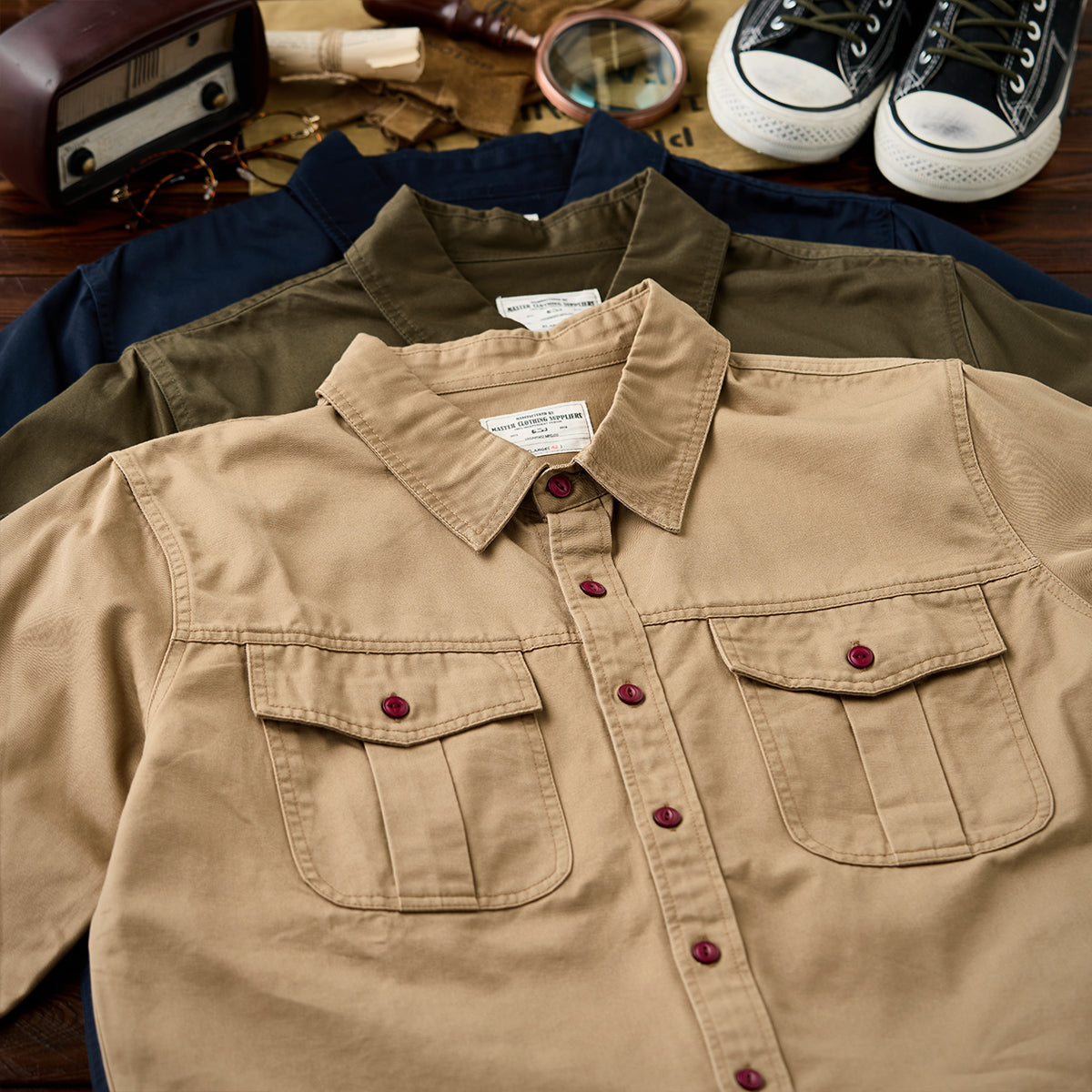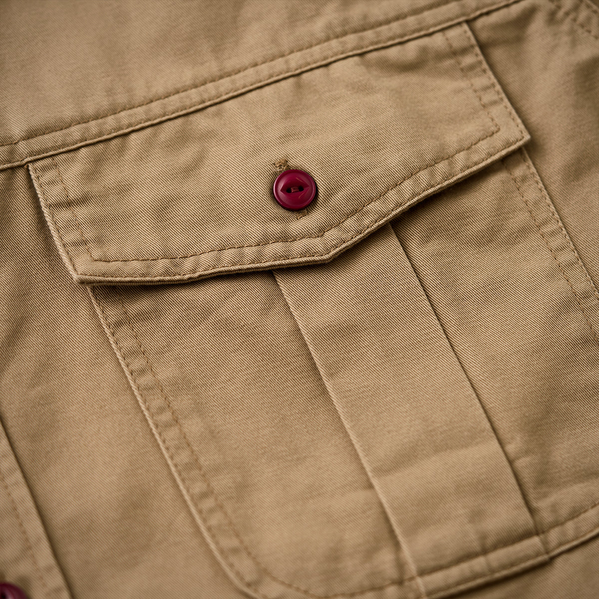 다크 레드 버튼과 플랩 포켓, 세로 스티치 디테일로 심플하면서도 개성과 실용성을 살린 워크 셔츠입니다.