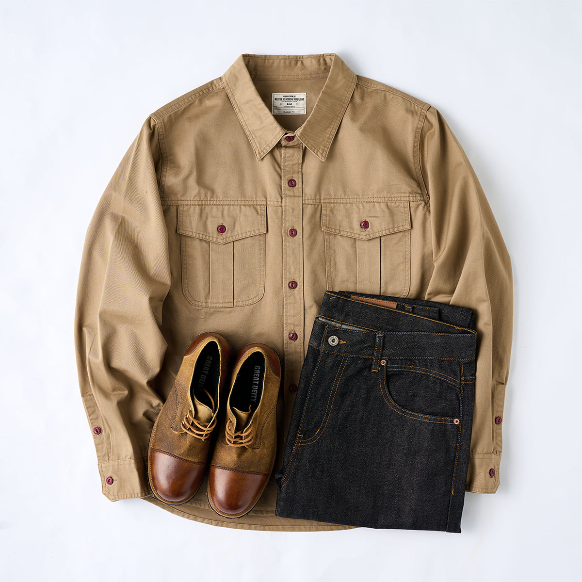청바지나 치노 팬츠와 매치하면 캐주얼하게 스타일링할 수 있으며, 가죽 신발이나 부츠와 함께하면 워크웨어 특유의 통일감 있는 룩을 완성할 수 있습니다.