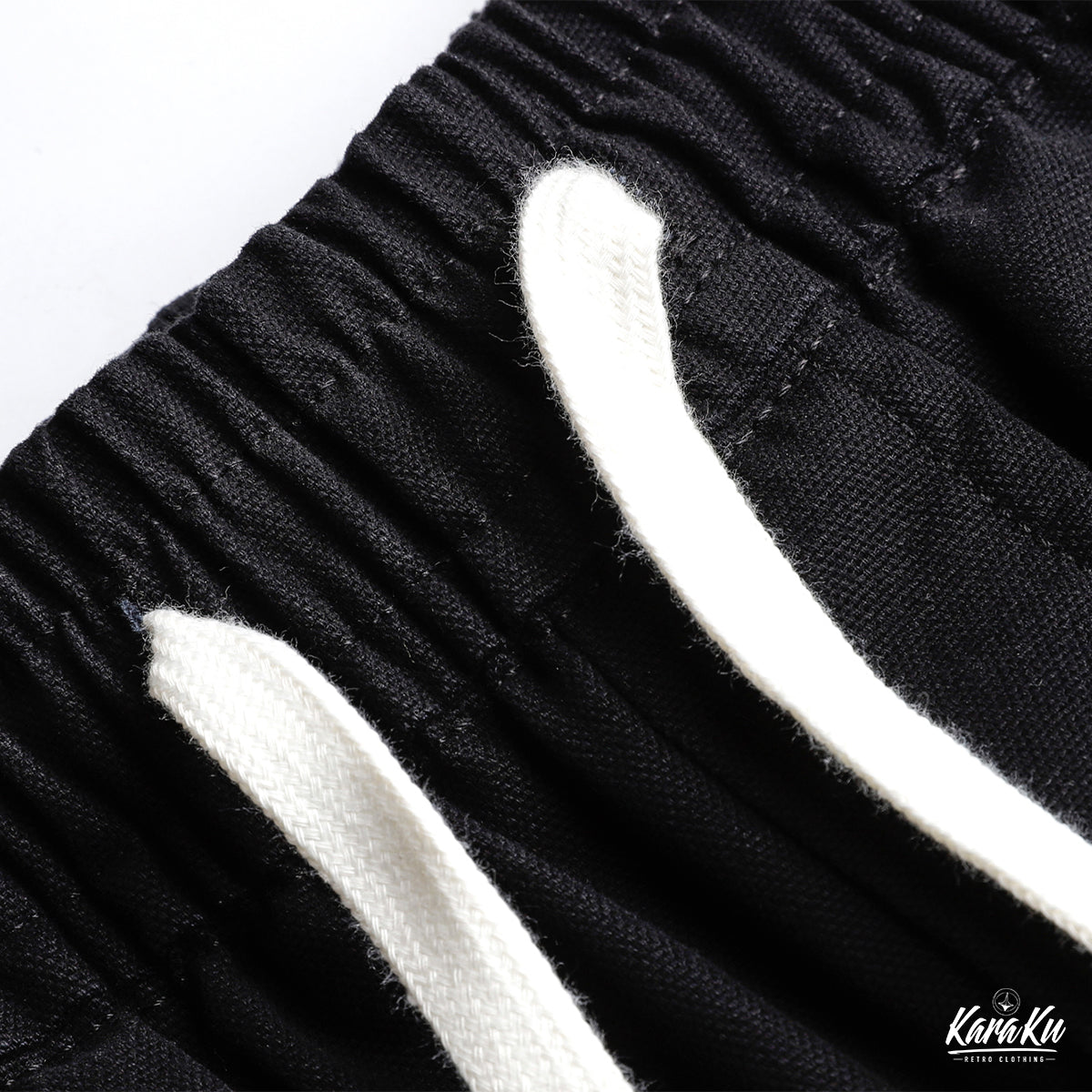 허리는 밴딩으로 되어 있어 벨트 없이도 편안하게 착용할 수 있으며, 드로우 코드가 부착되어 있어 조절이 용이합니다.