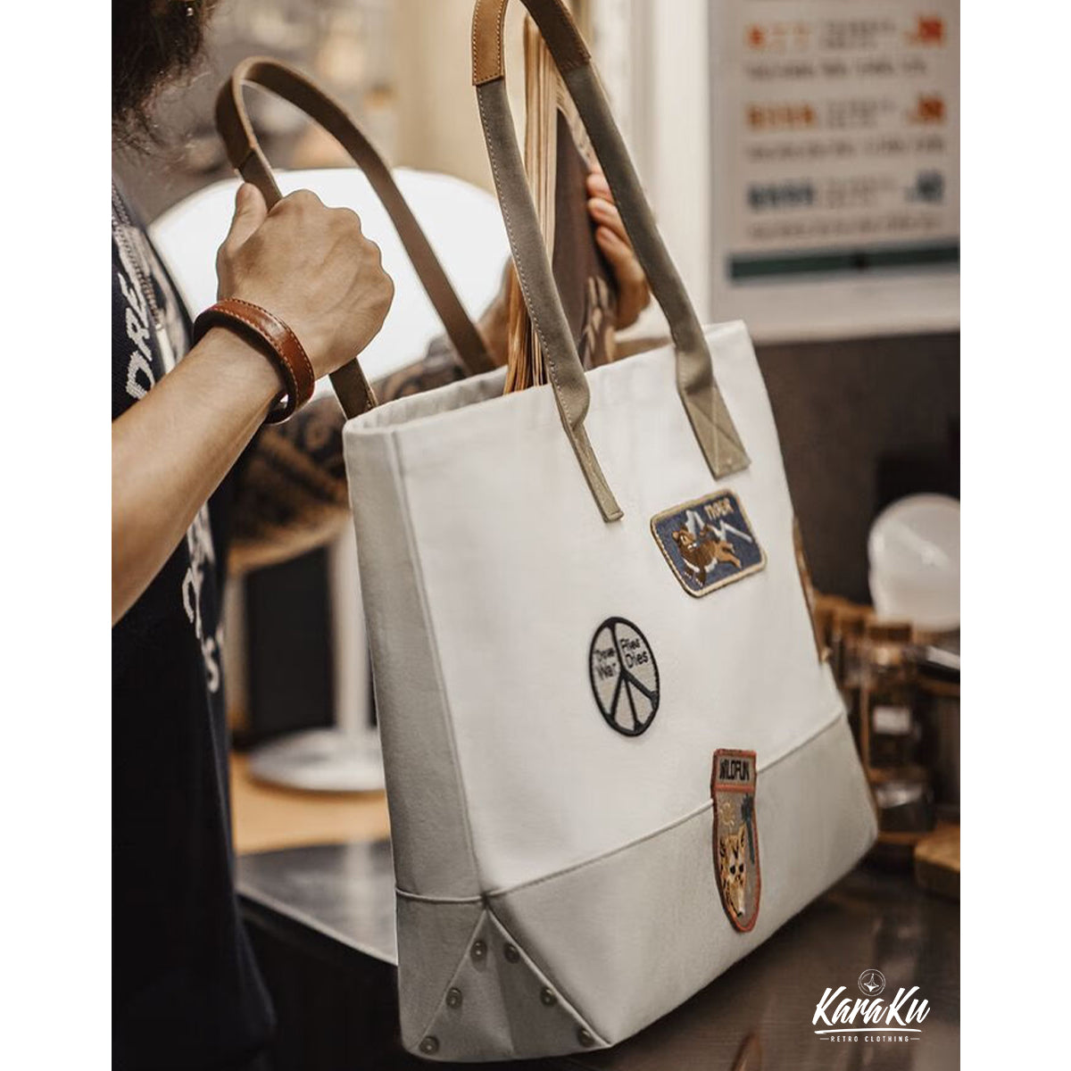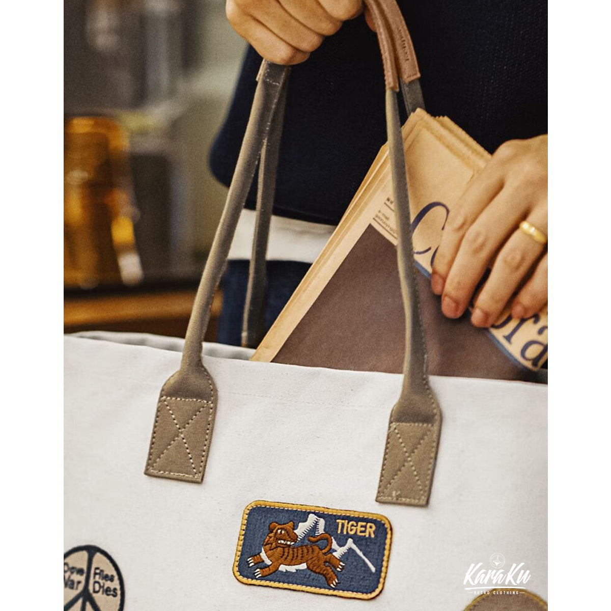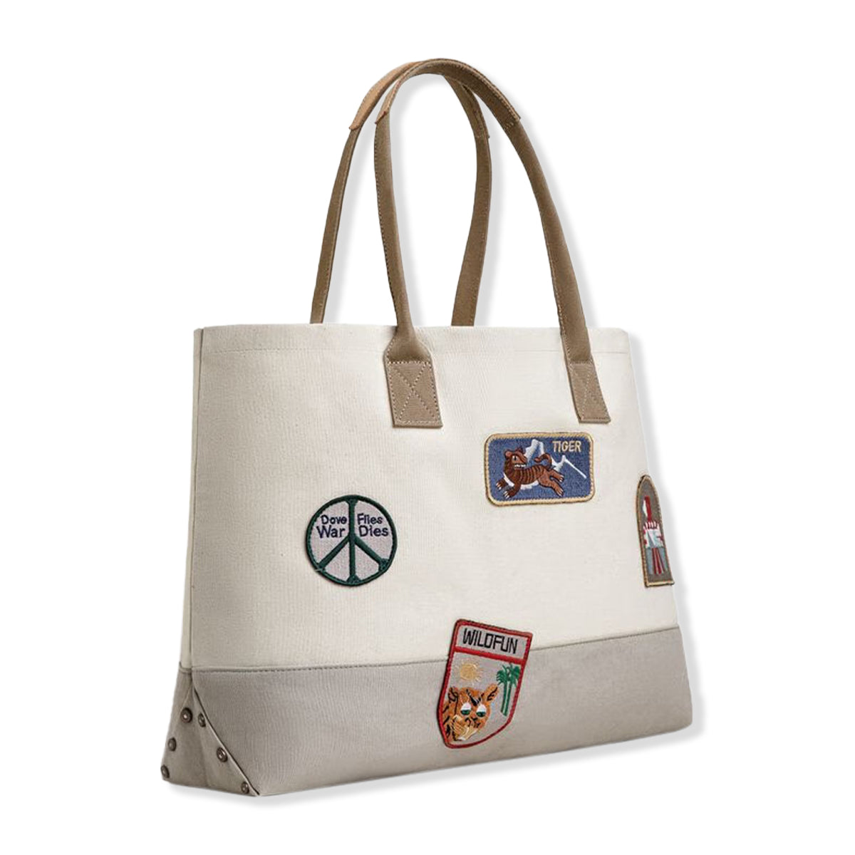 빈티지한 자수 와펜과 바이컬러 디자인이 돋보이는 실용적인 캔버스 토트백이며 넉넉한 수납력과 편안한 착용감으로 데일리로 활용하기 좋습니다.