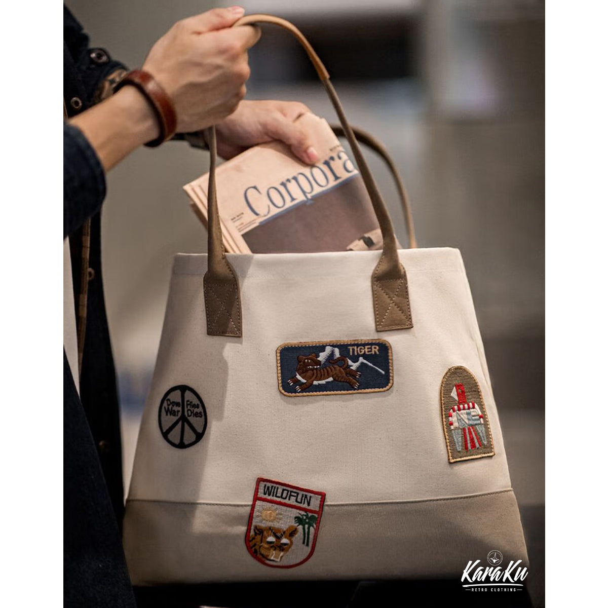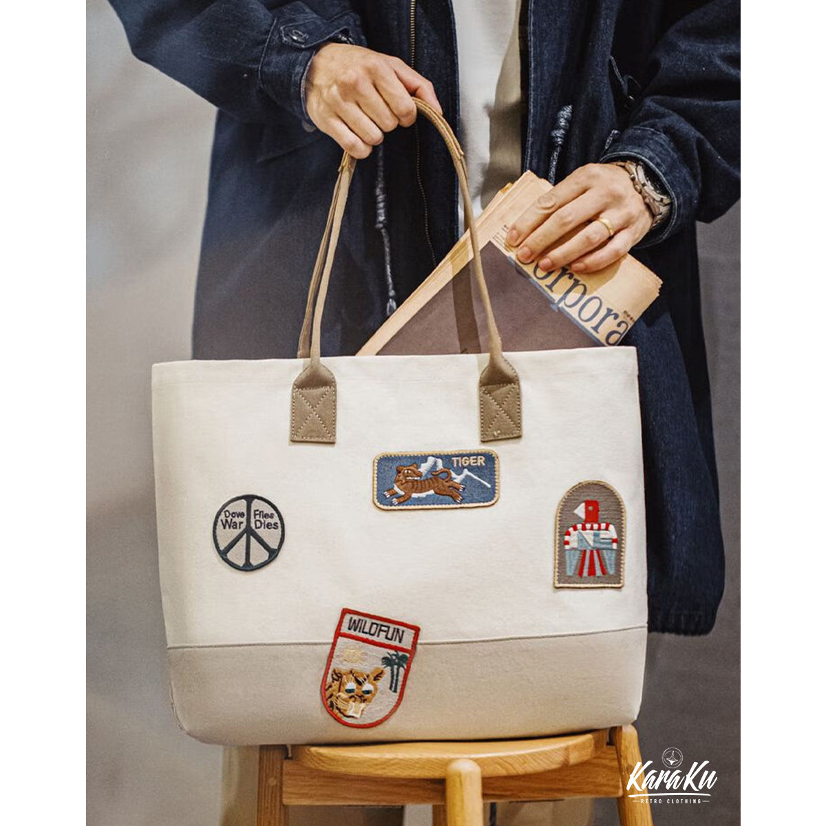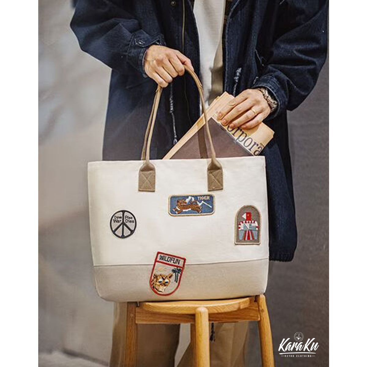 복고풍 자수 와펜 바이컬러 캔버스 토트백