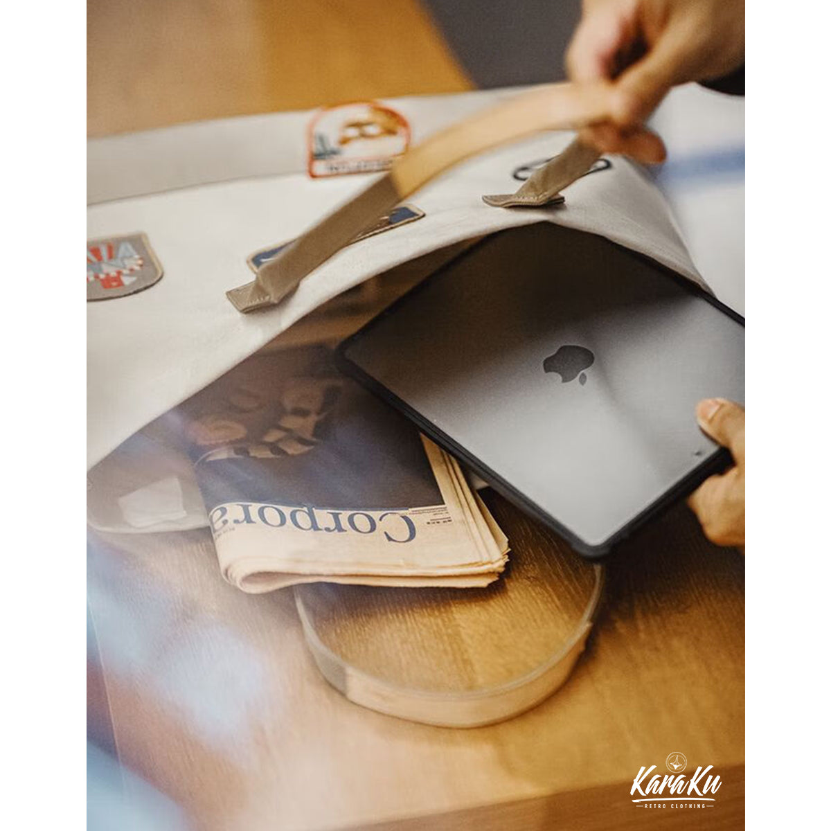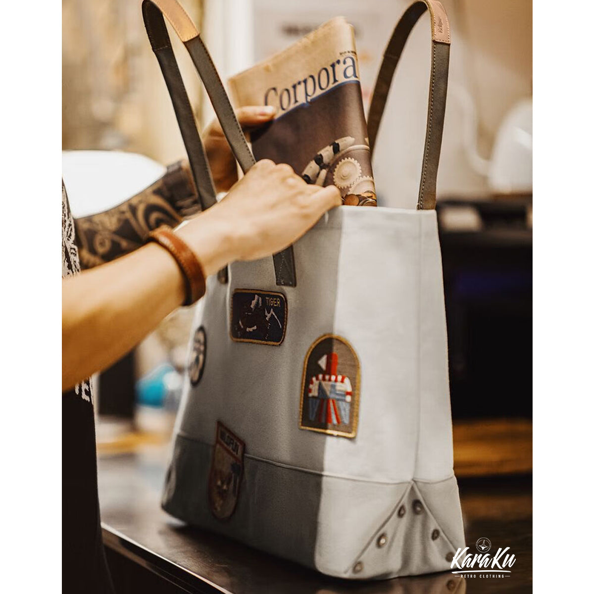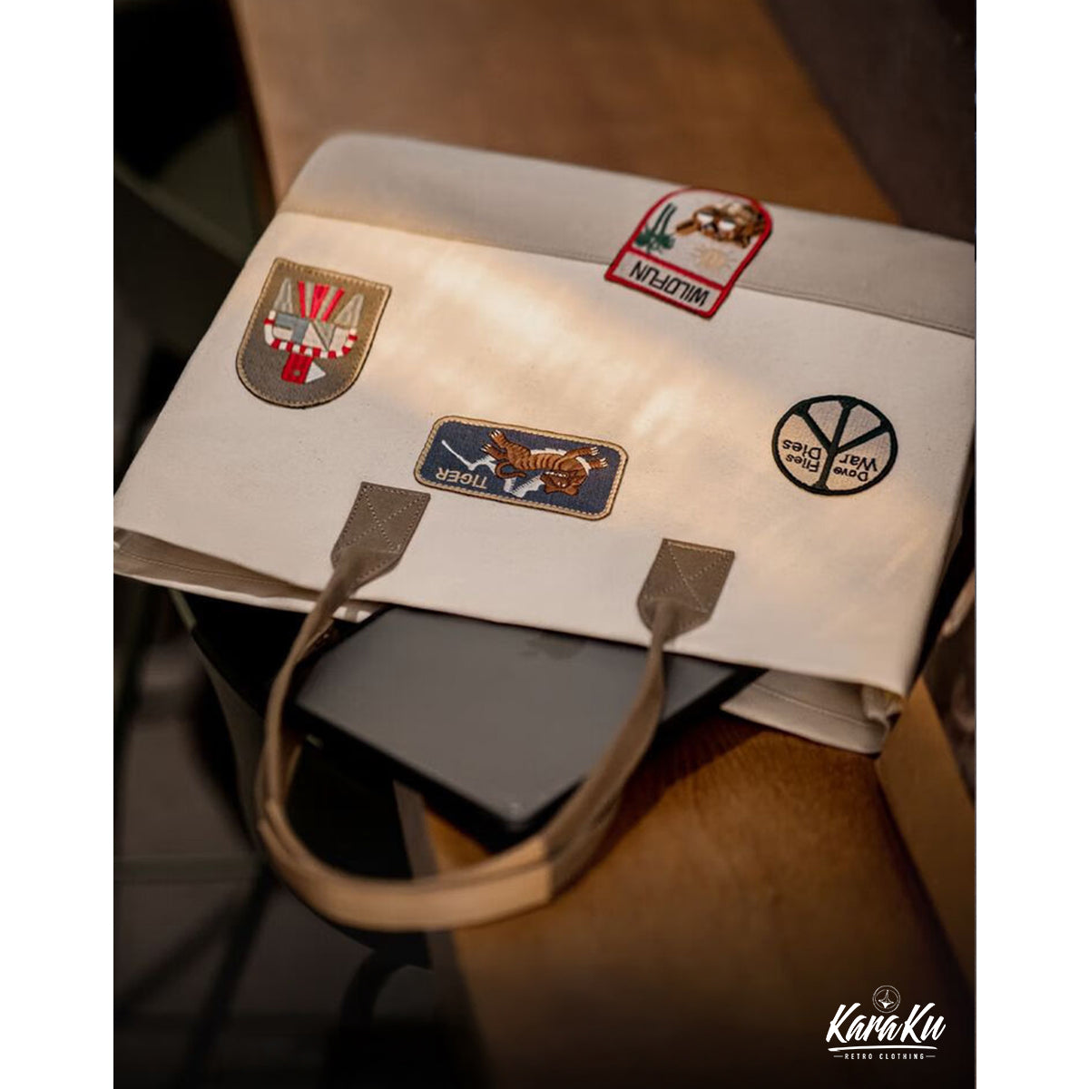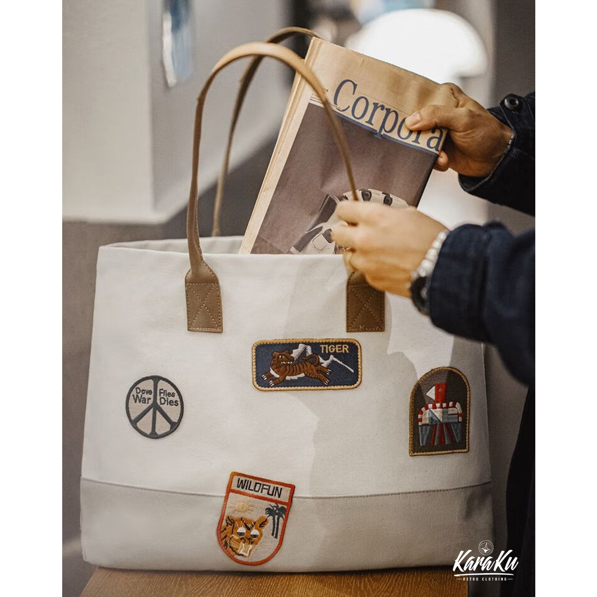 복고풍 자수 와펜 바이컬러 캔버스 토트백