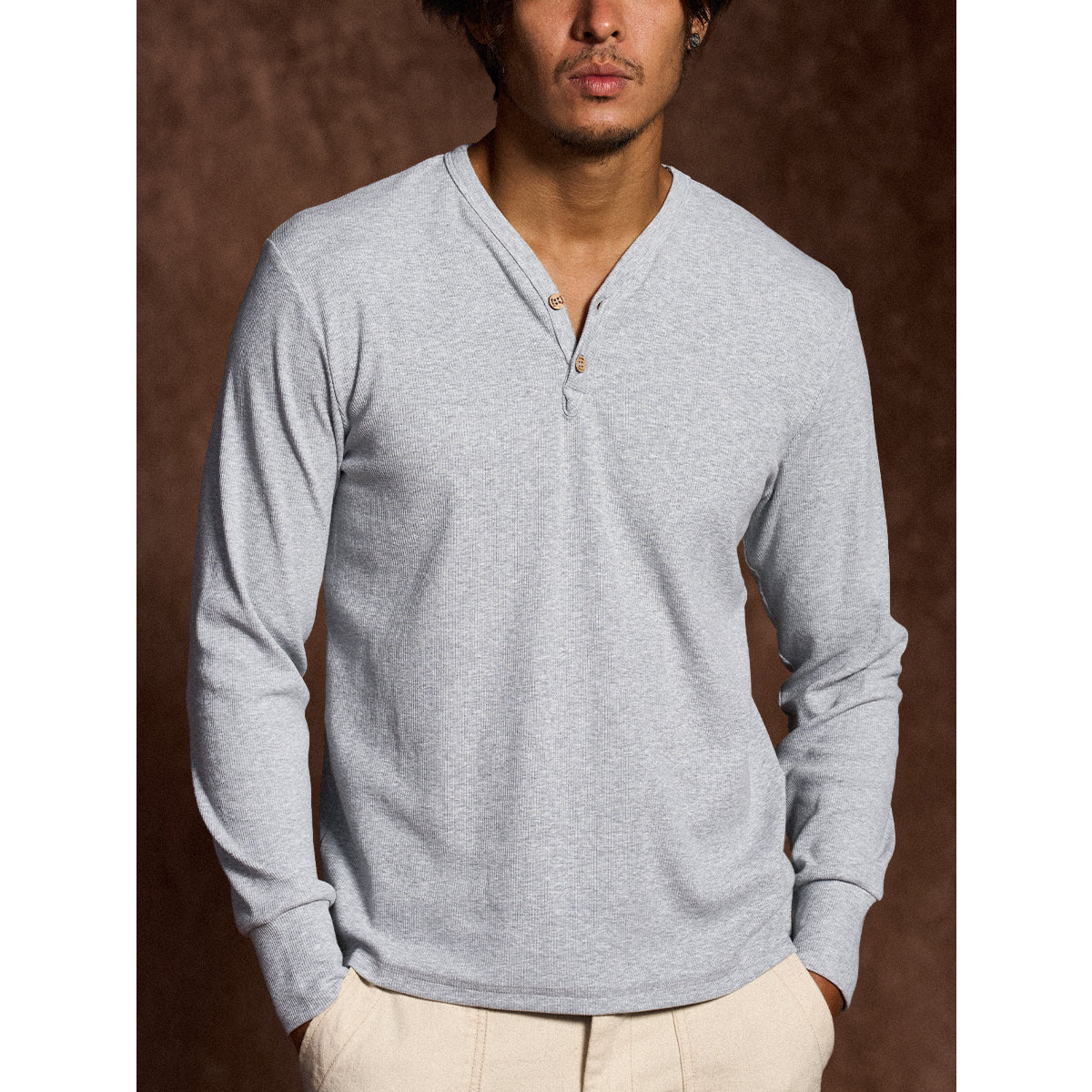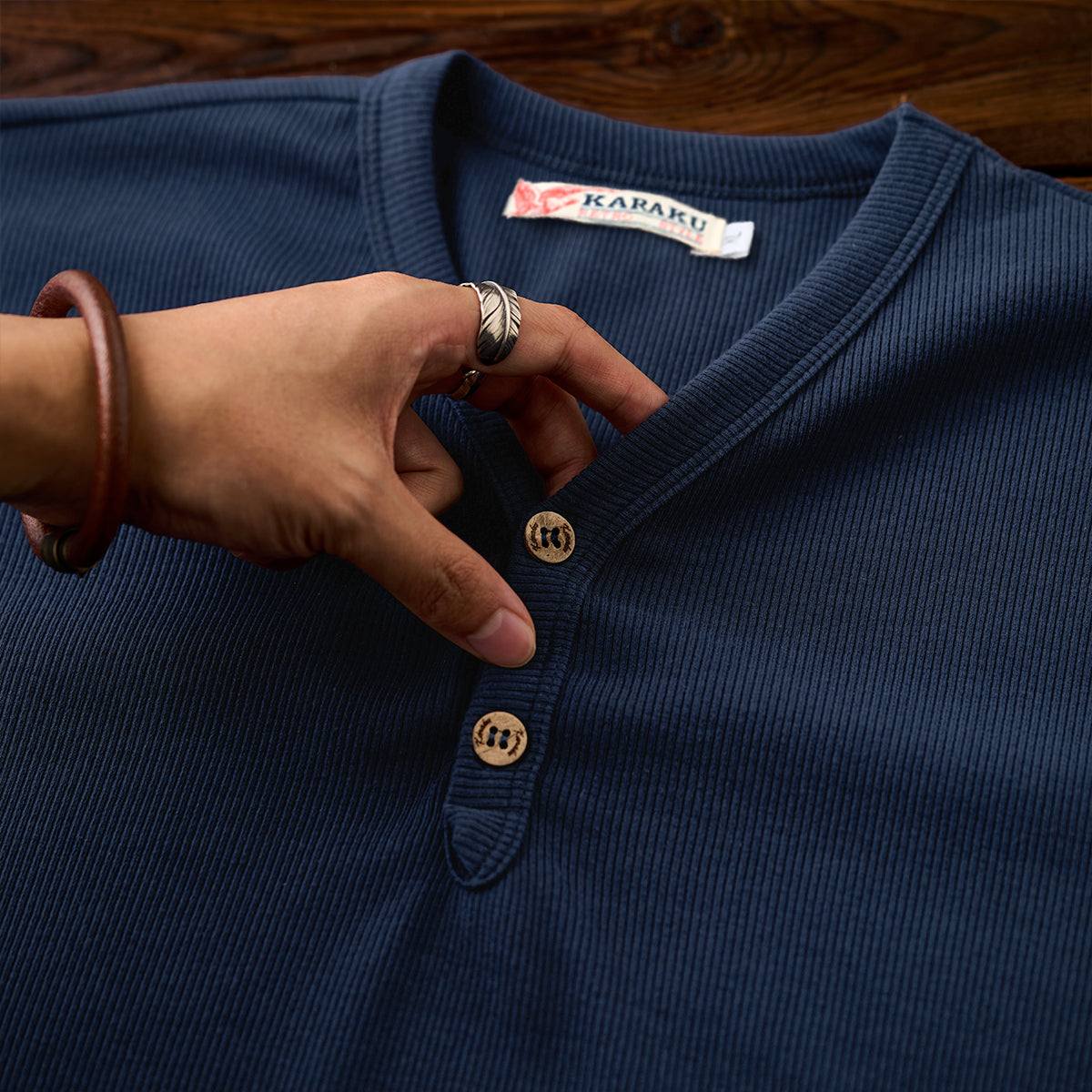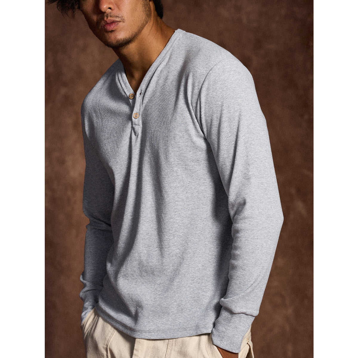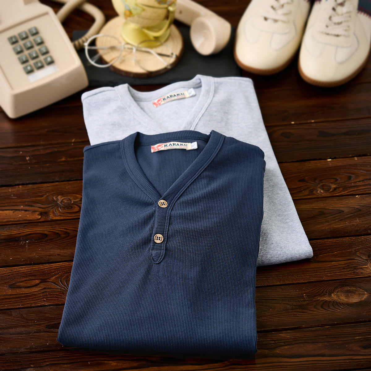 헨리넥과 단추 여밈 디테일이 모던하고 세련된 단색 티셔츠로, 심플하면서도 고급스러운 느낌을 줍니다.