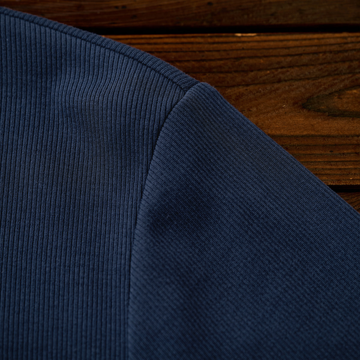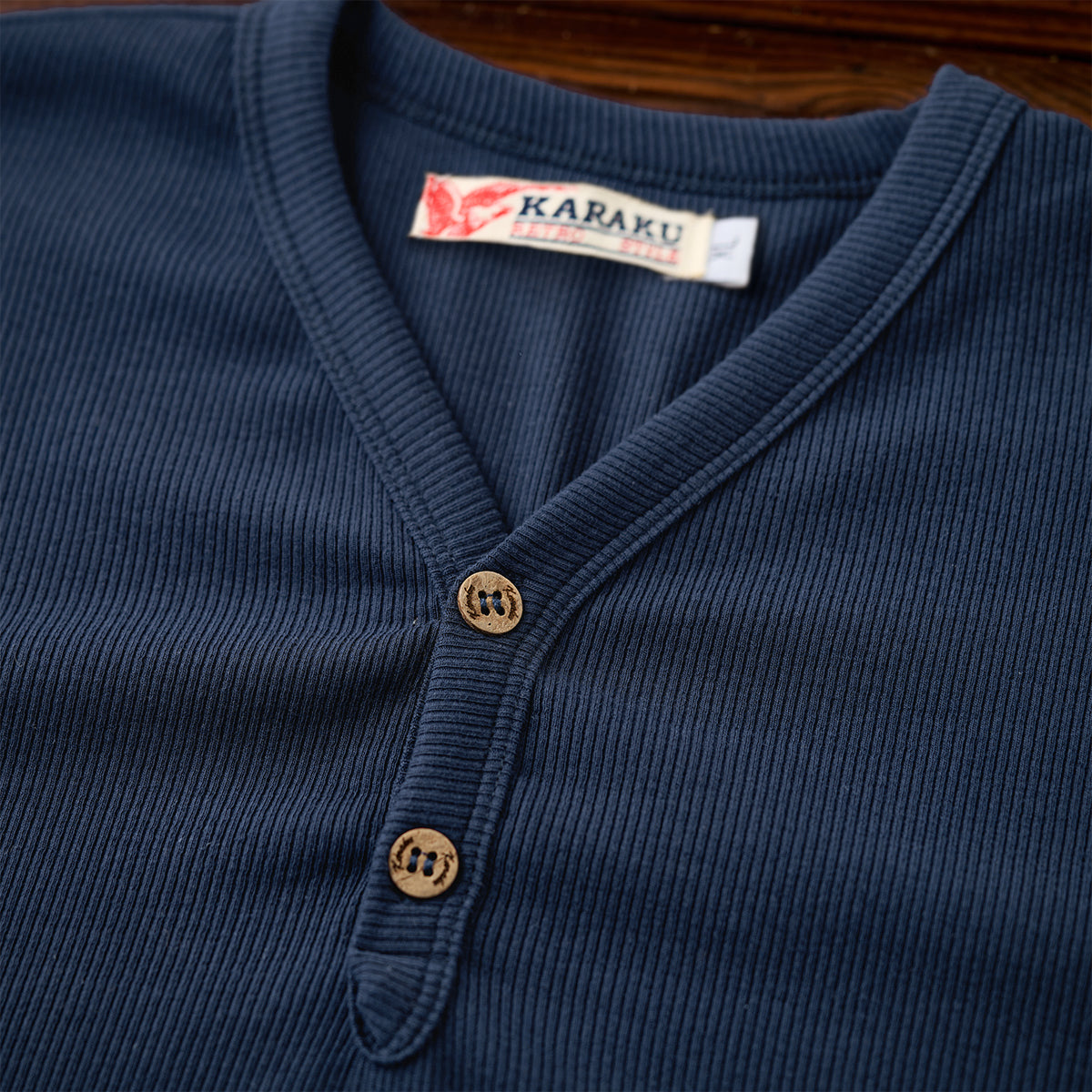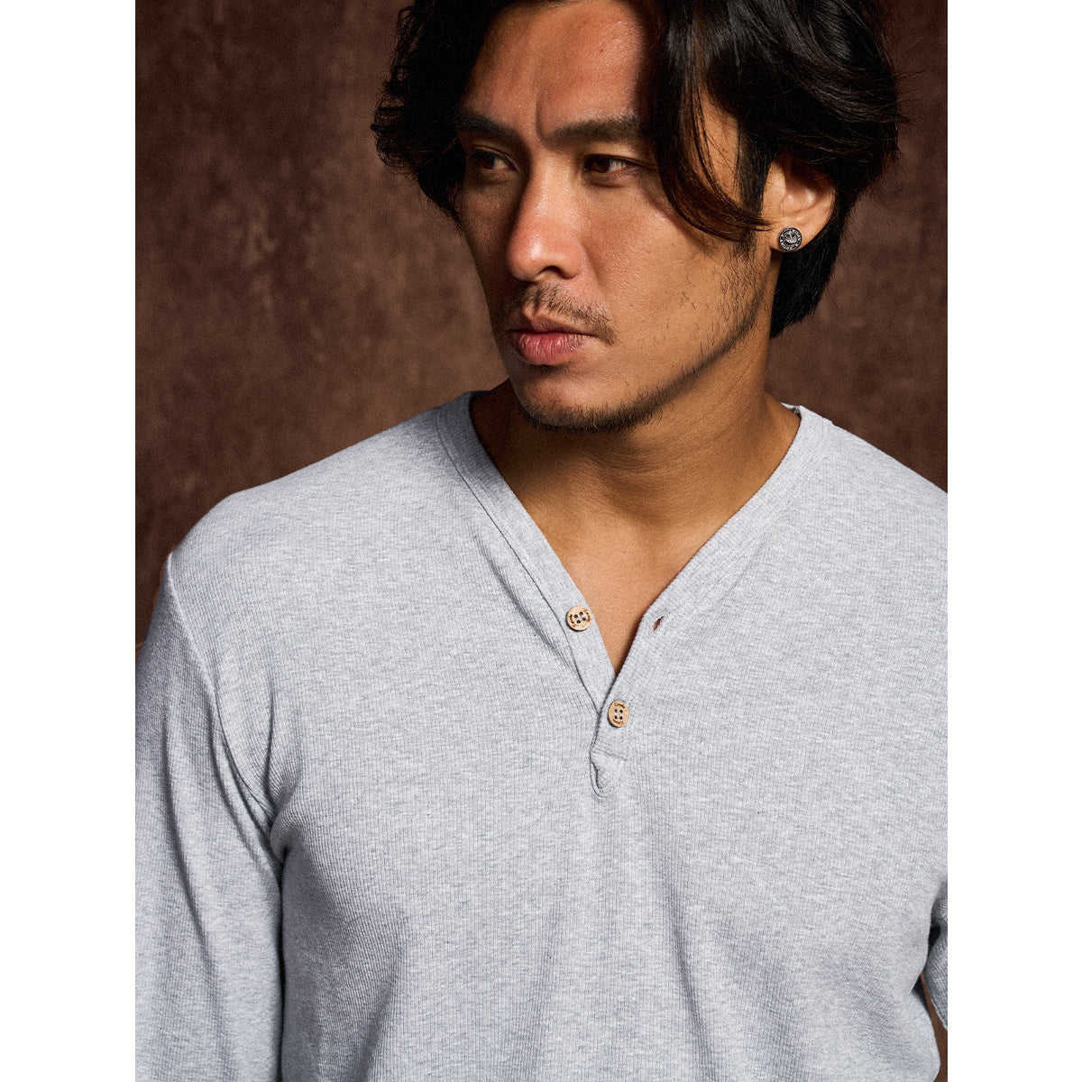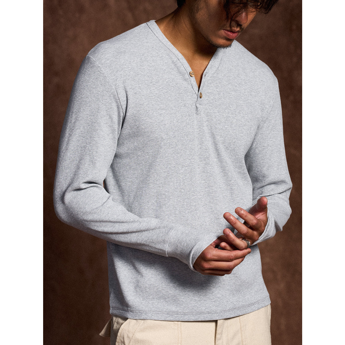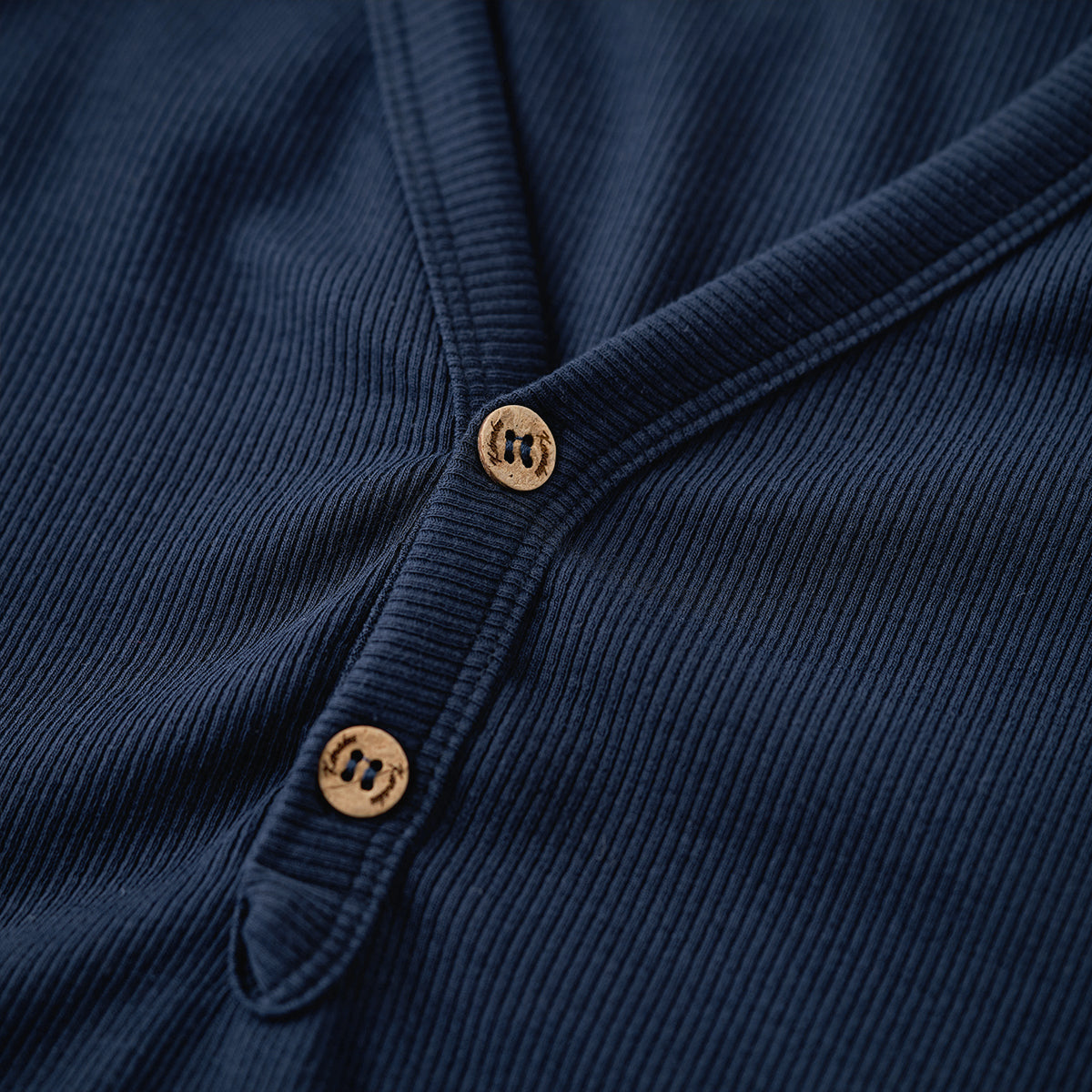 헨리넥과 단추 여밈 디테일이 모던하고 세련된 단색 티셔츠로, 심플하면서도 고급스러운 느낌을 줍니다.