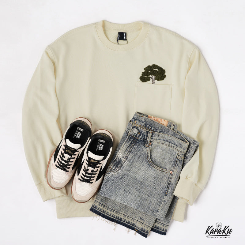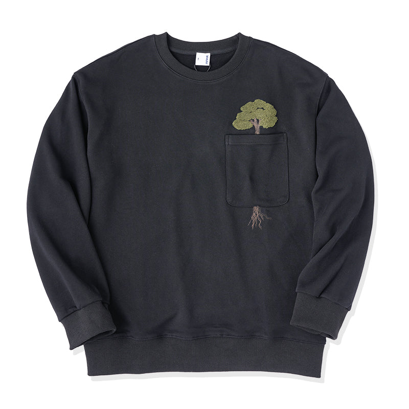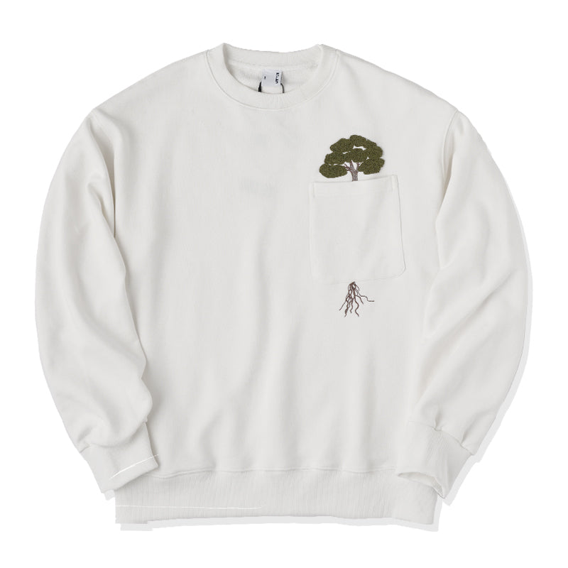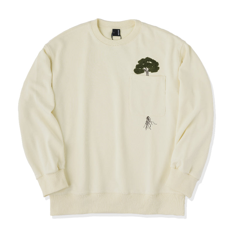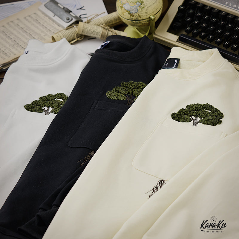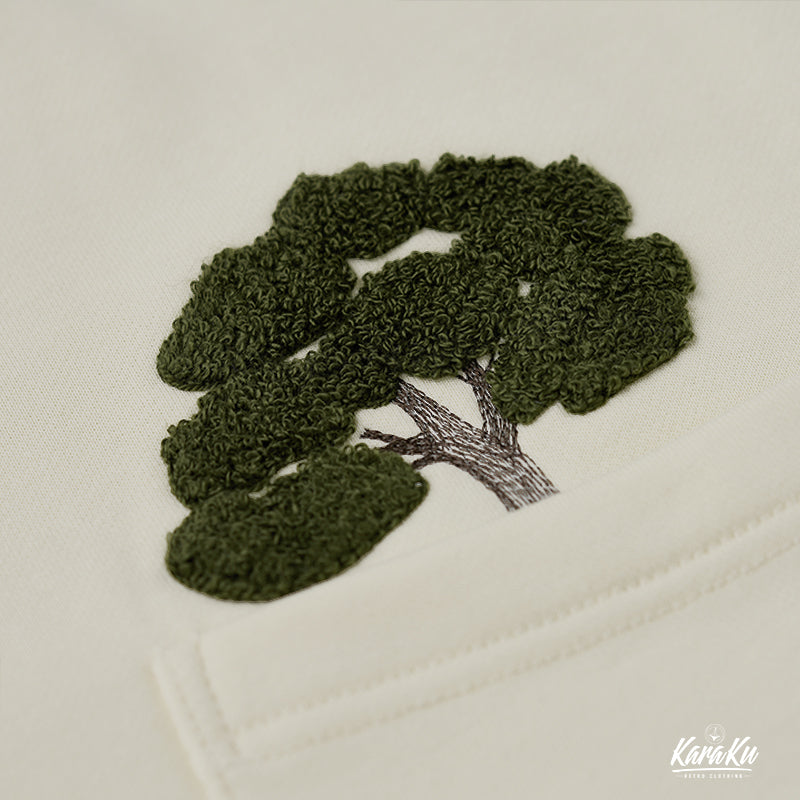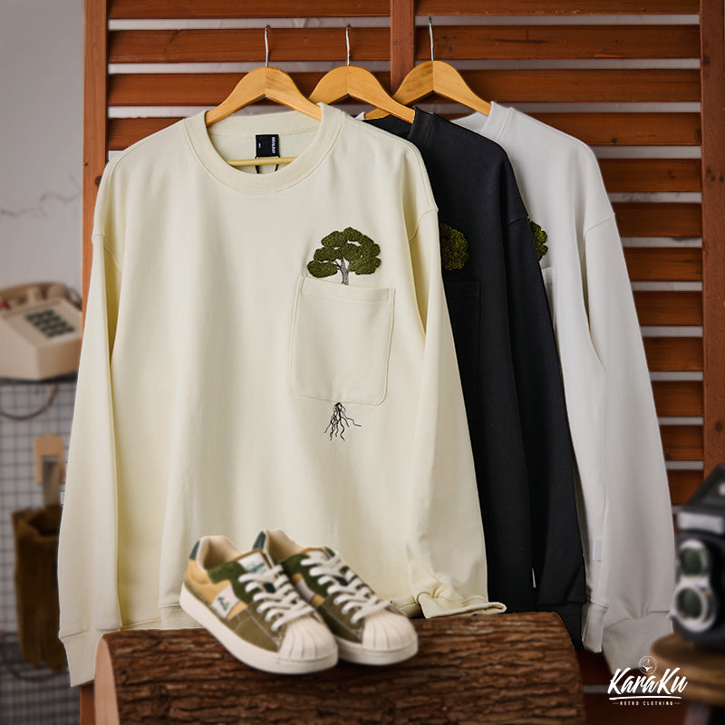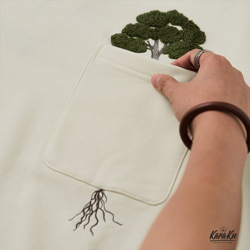 Karaku의 인기 코튼 반팔 티셔츠를 롱슬리브로 업그레이드한 제품입니다. 왼쪽 가슴 포켓에 정교한 자수로 표현된 잎사귀와 나무 디테일이 특징입니다.