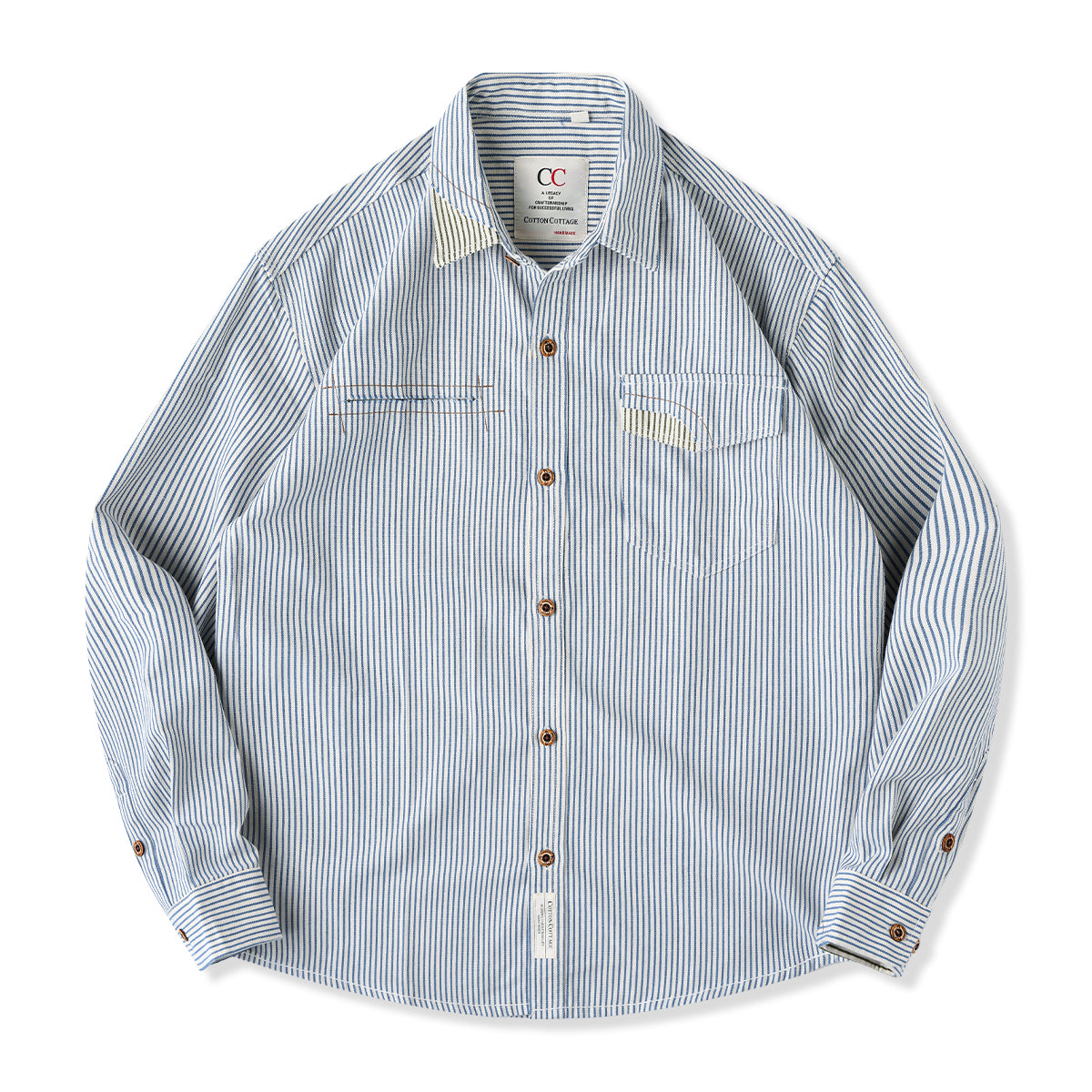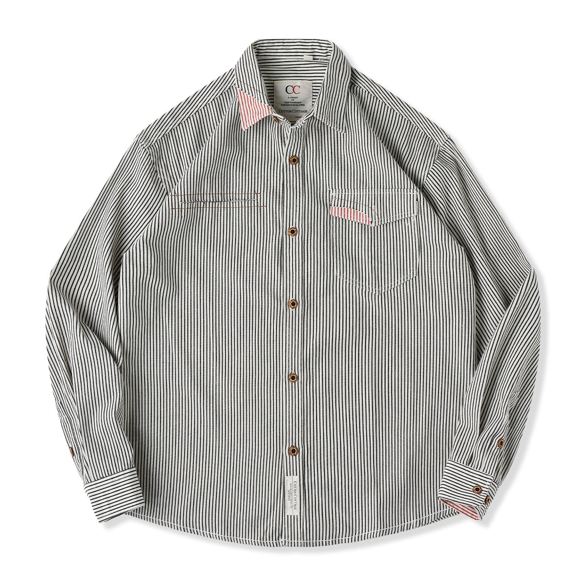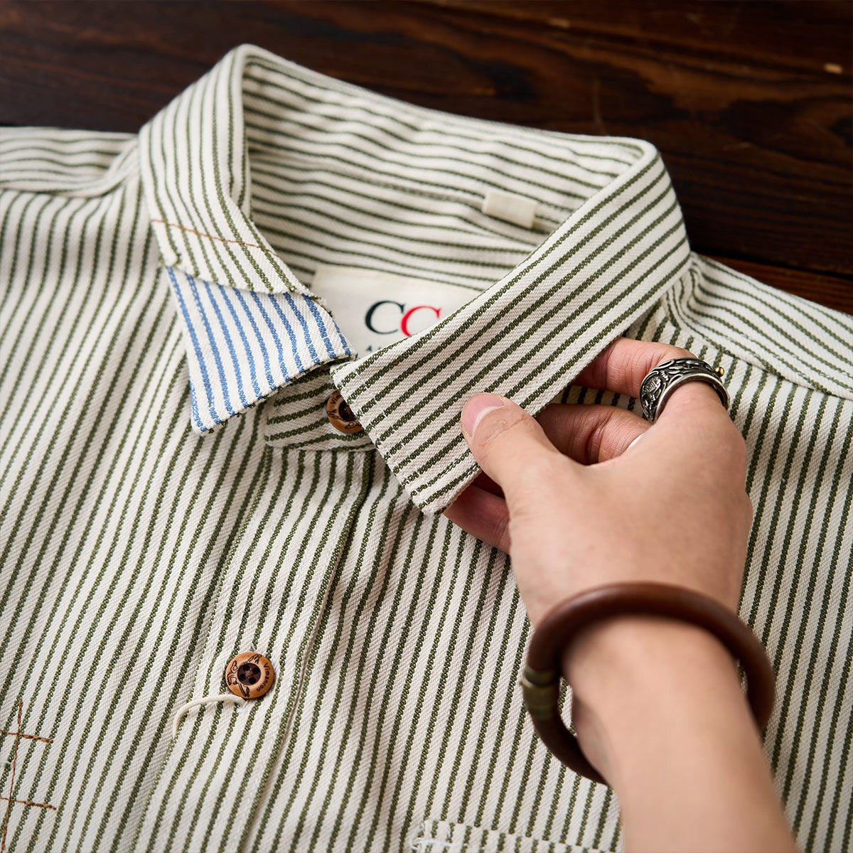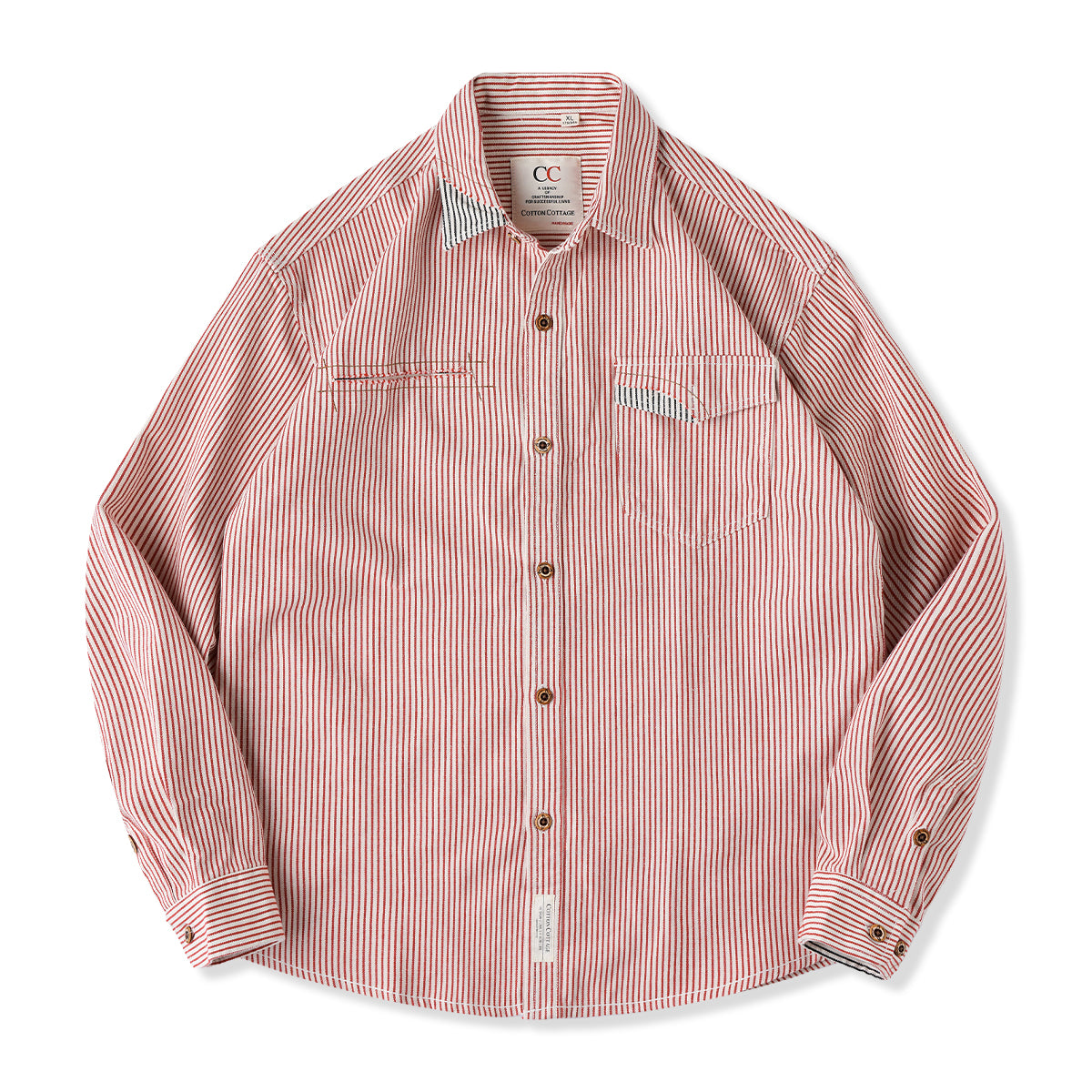 클래식 히코리 스트라이프를 기반으로 칼라, 포켓, 소맷단을 배색으로 재구성한 워크 셔츠로, 빈티지 무드를 표현한 현대적인 디자인이 특징입니다.