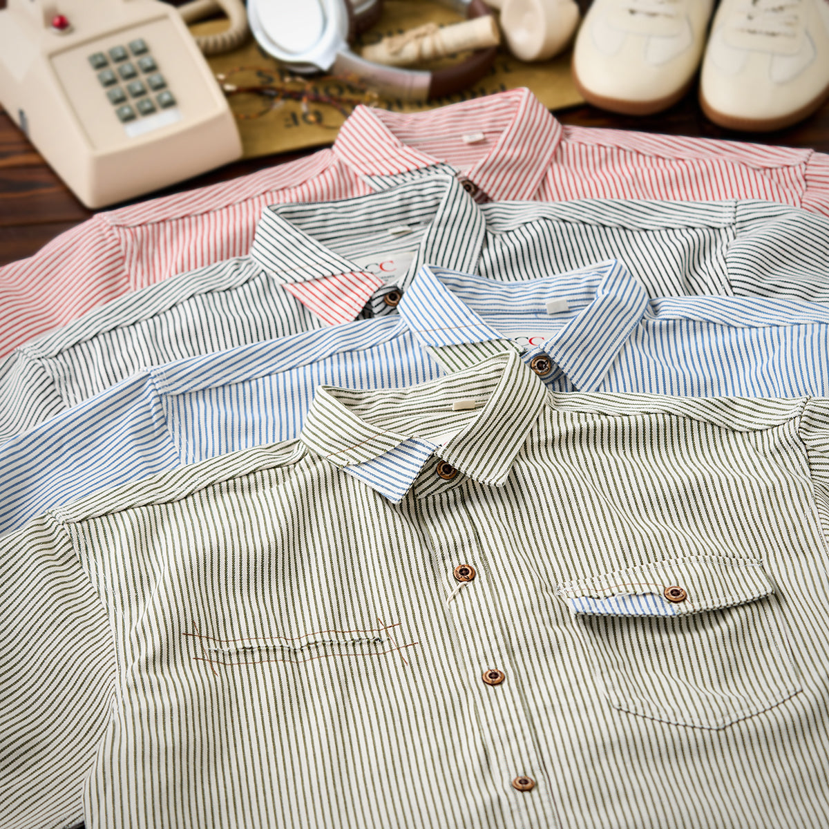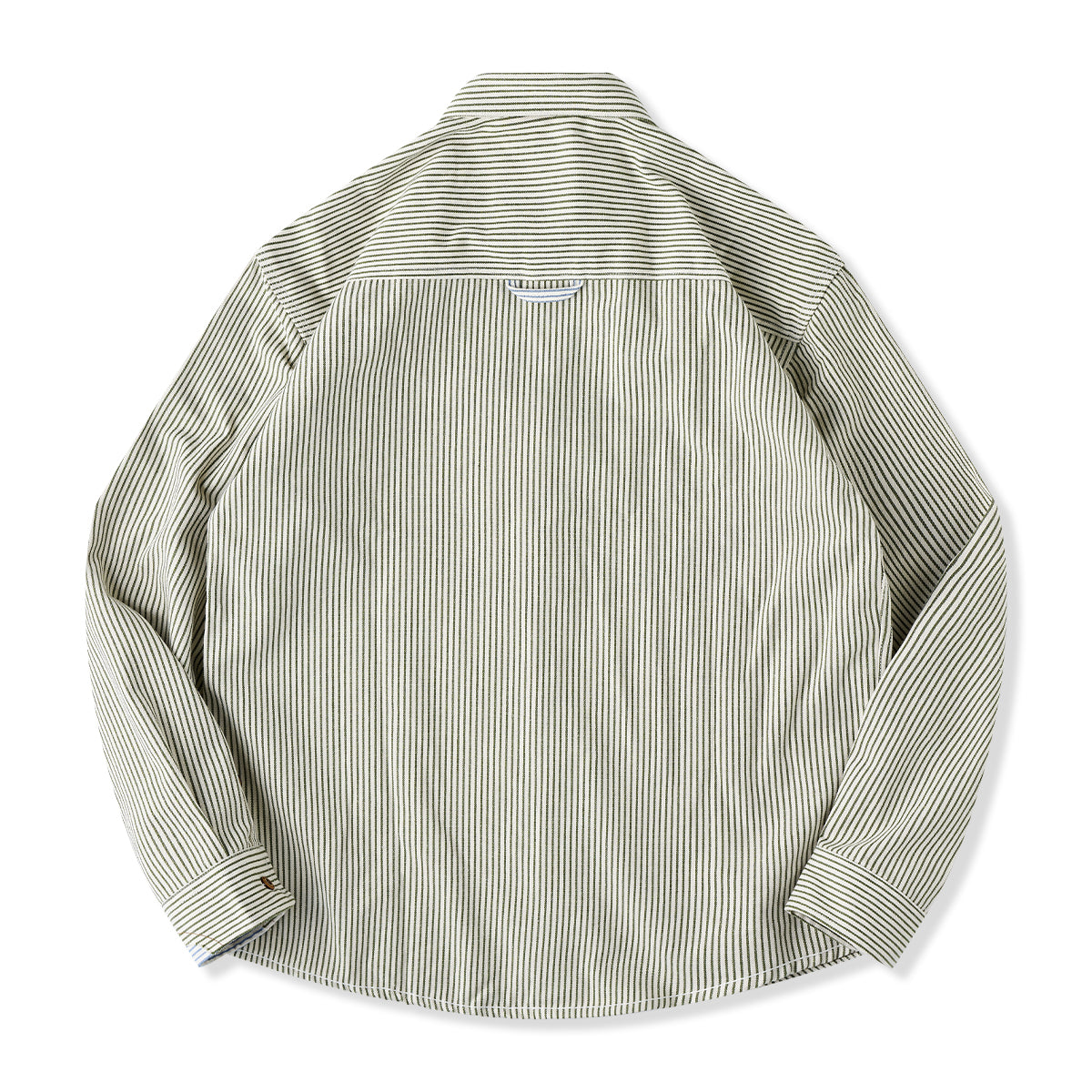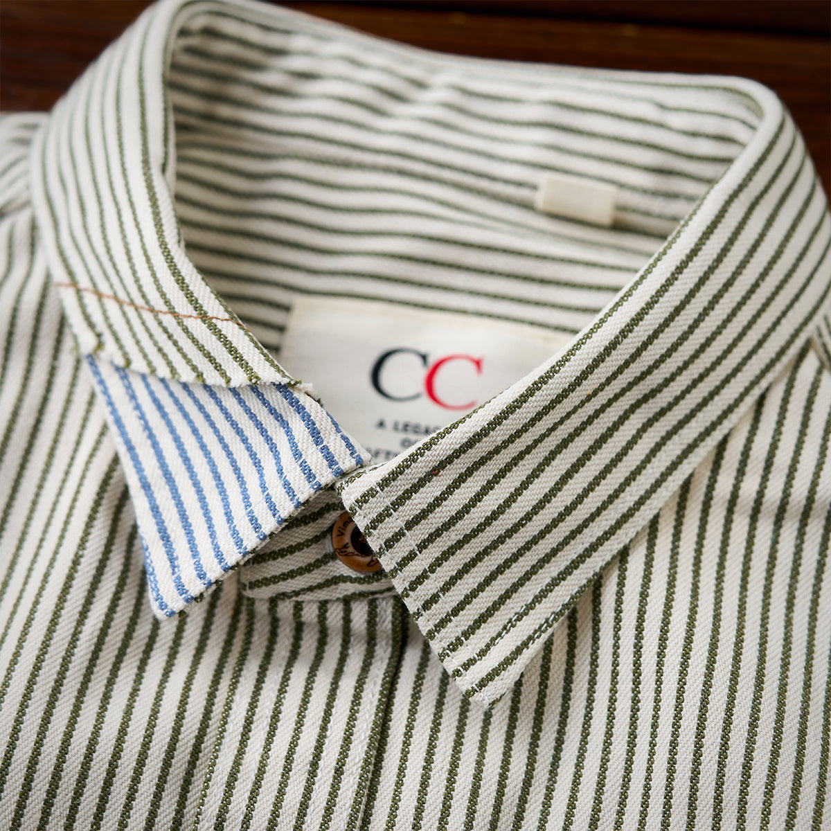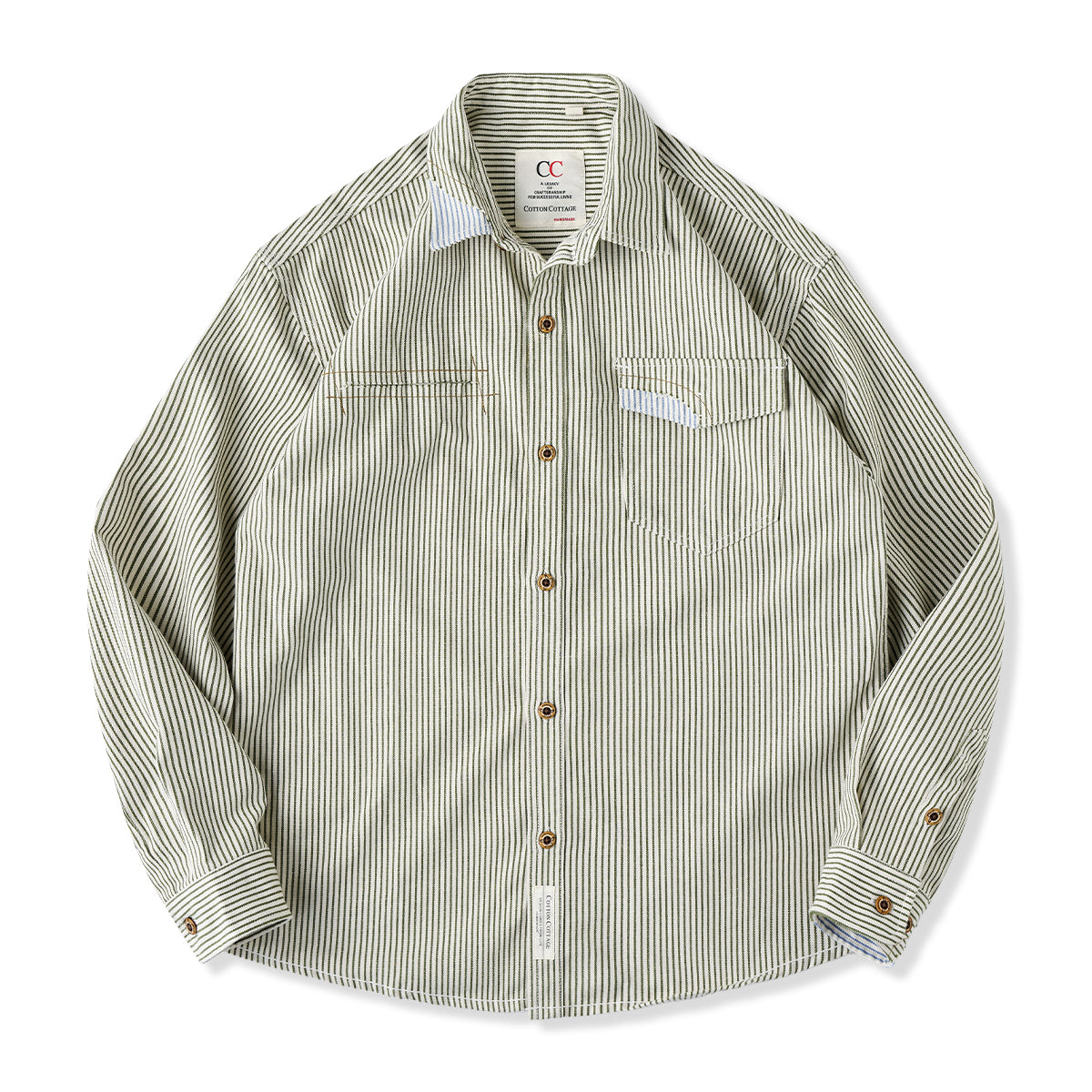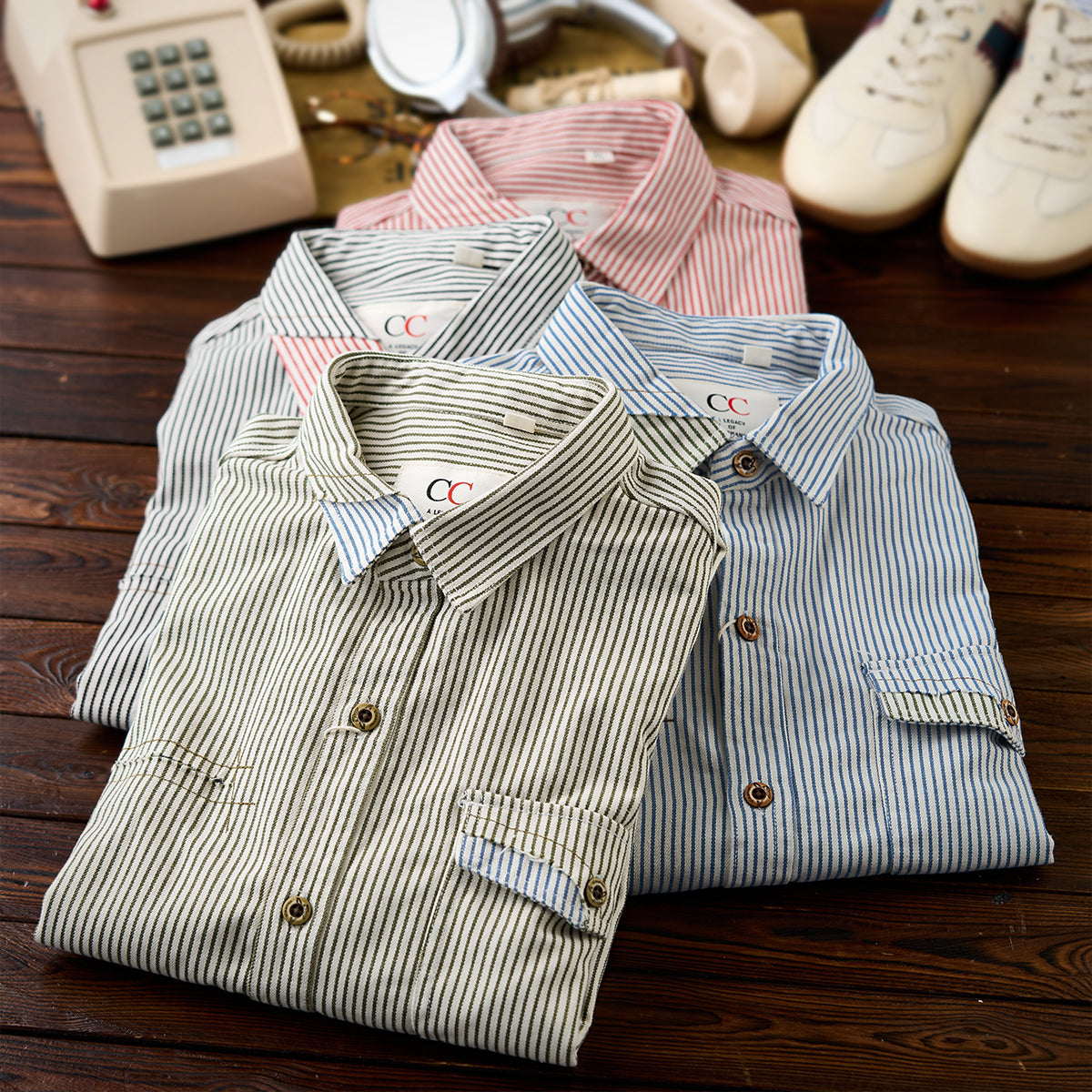 클래식 히코리 스트라이프를 기반으로 칼라, 포켓, 소맷단을 배색으로 재구성한 워크 셔츠로, 빈티지 무드를 표현한 현대적인 디자인이 특징입니다.