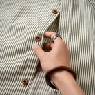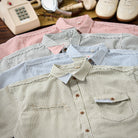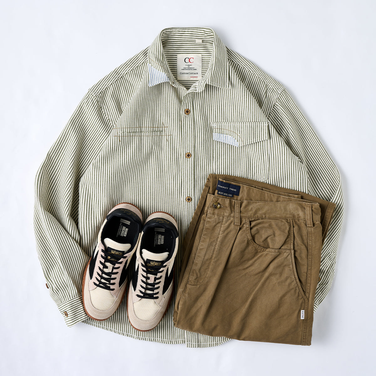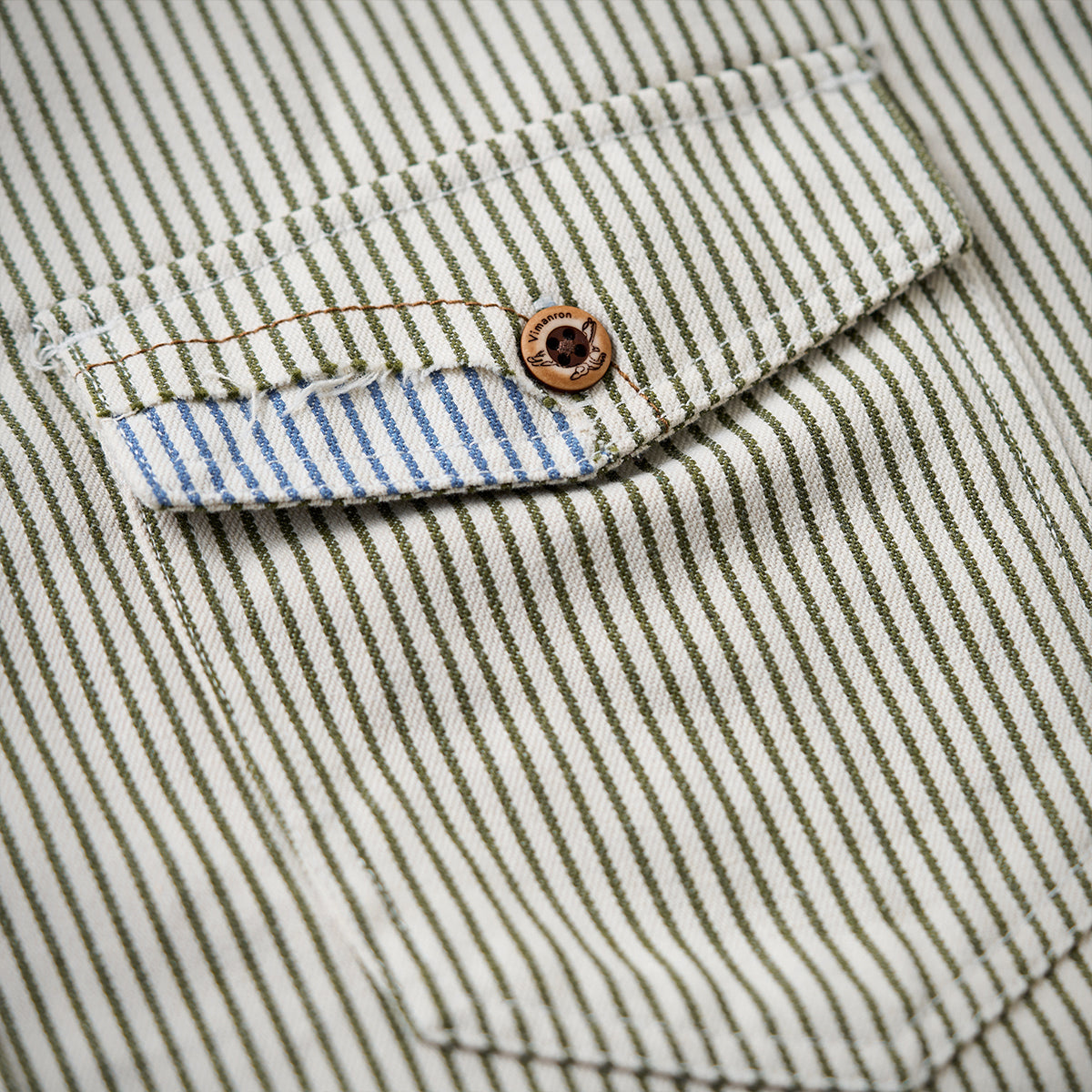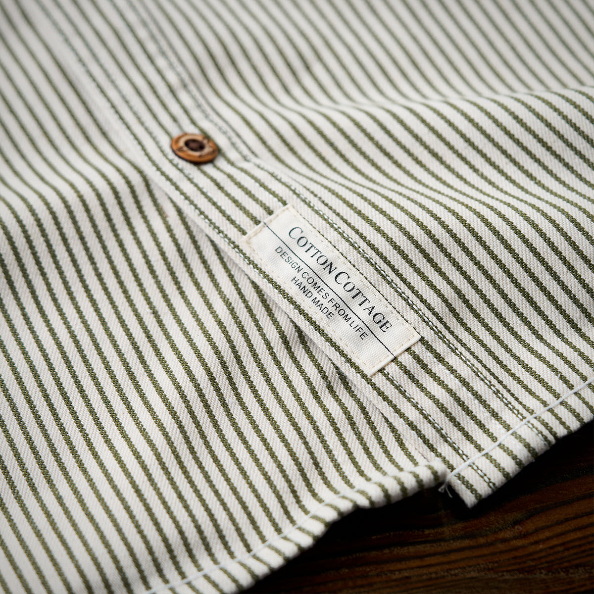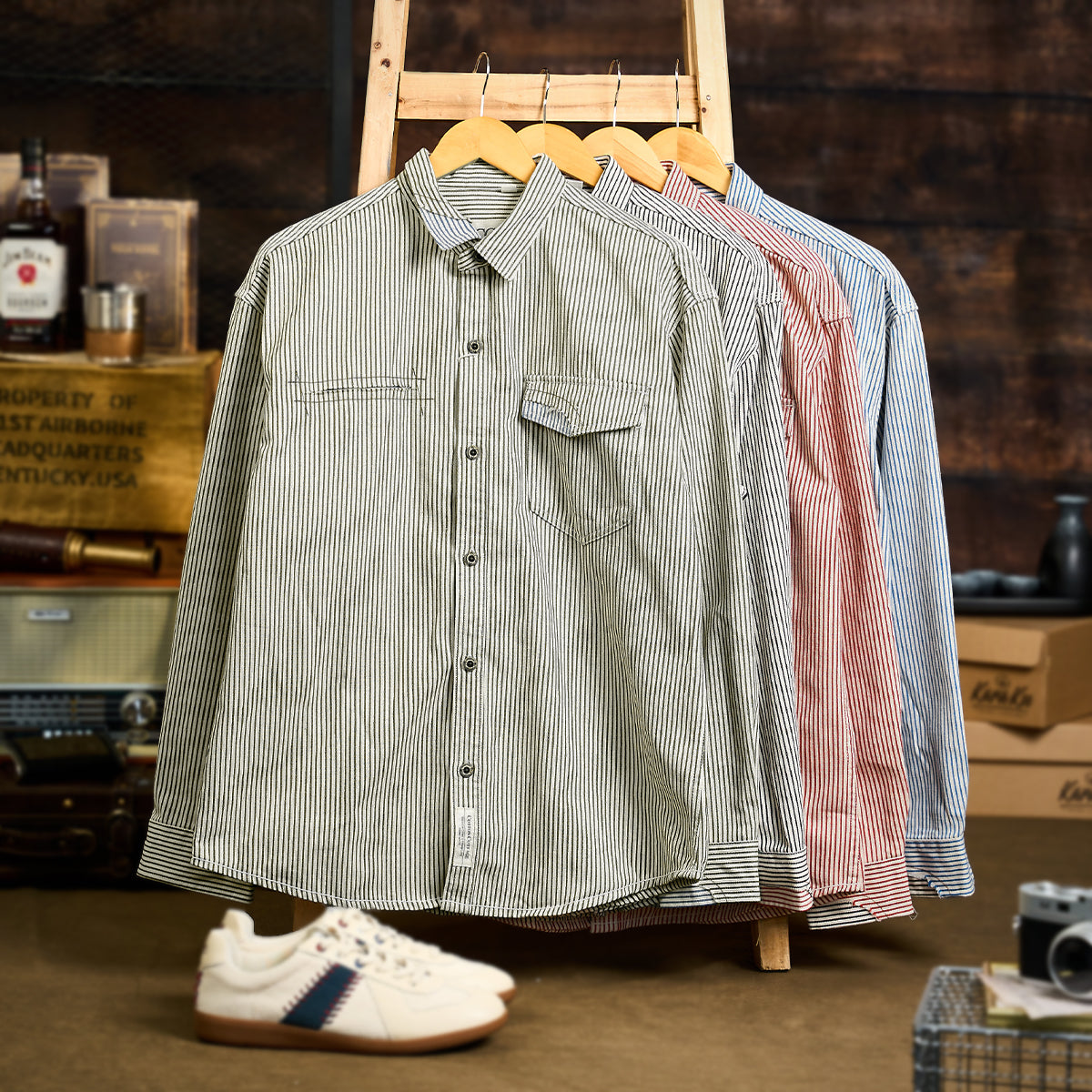 클래식 히코리 스트라이프를 기반으로 칼라, 포켓, 소맷단을 배색으로 재구성한 워크 셔츠로, 빈티지 무드를 표현한 현대적인 디자인이 특징입니다.