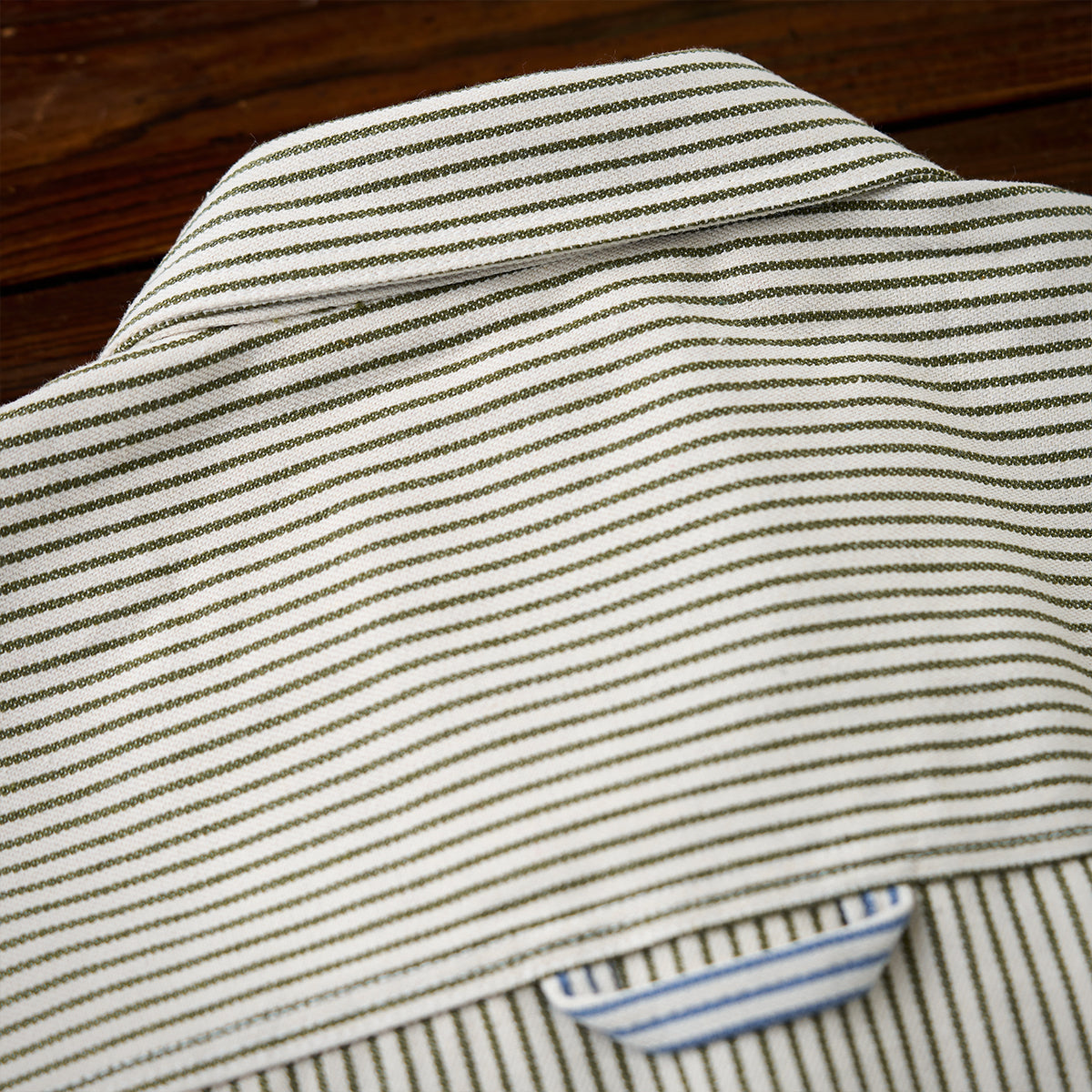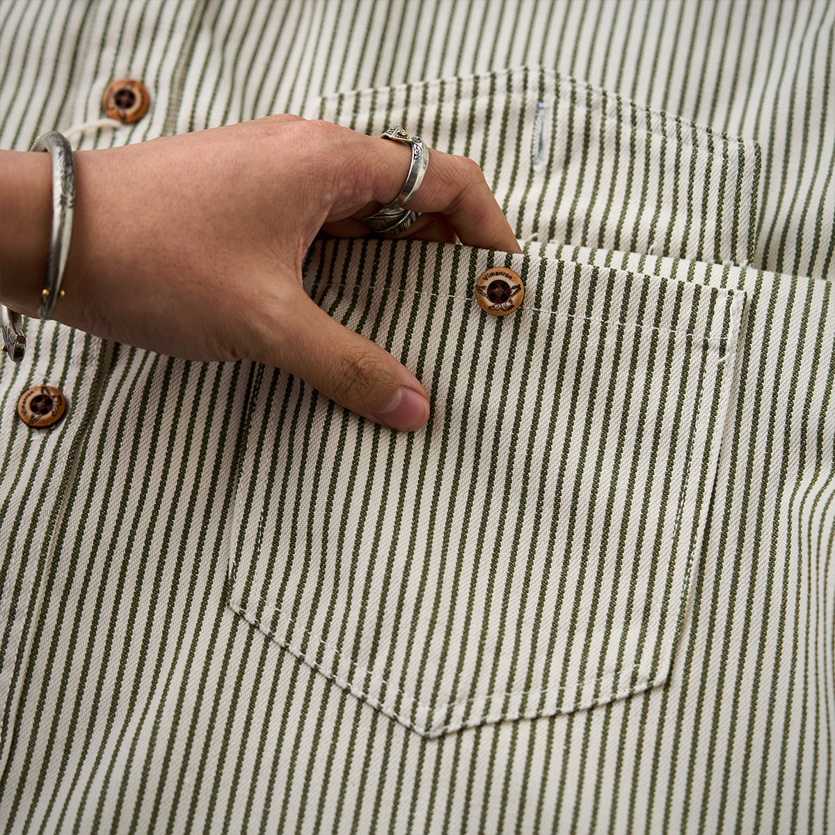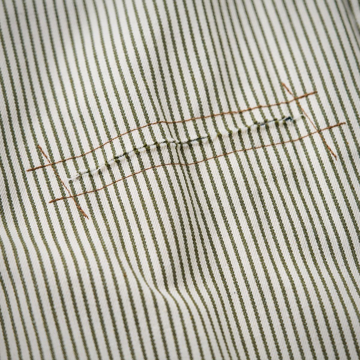 리워크 칼라·포켓·소매 배색 히코리 스트라이프 워크 셔츠
