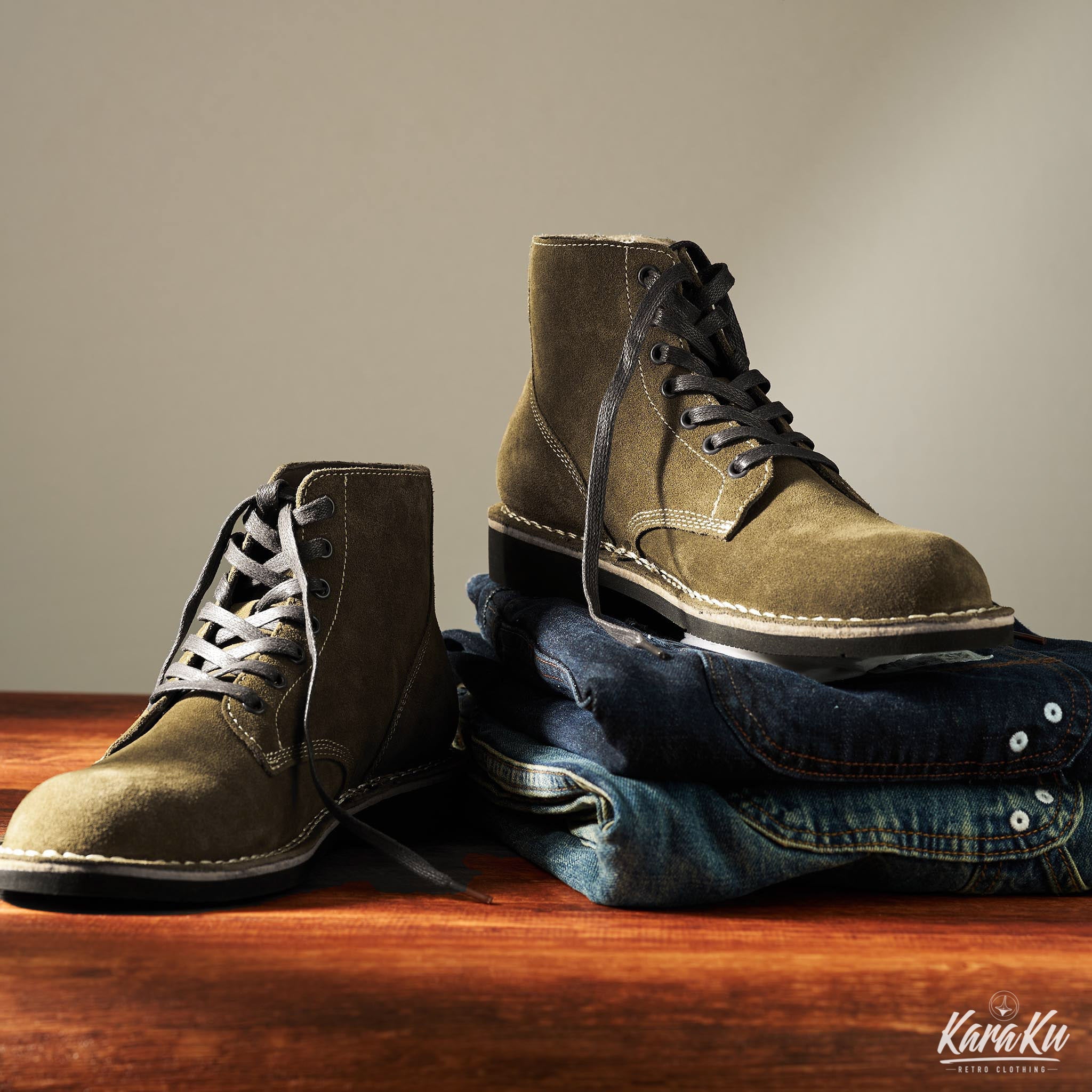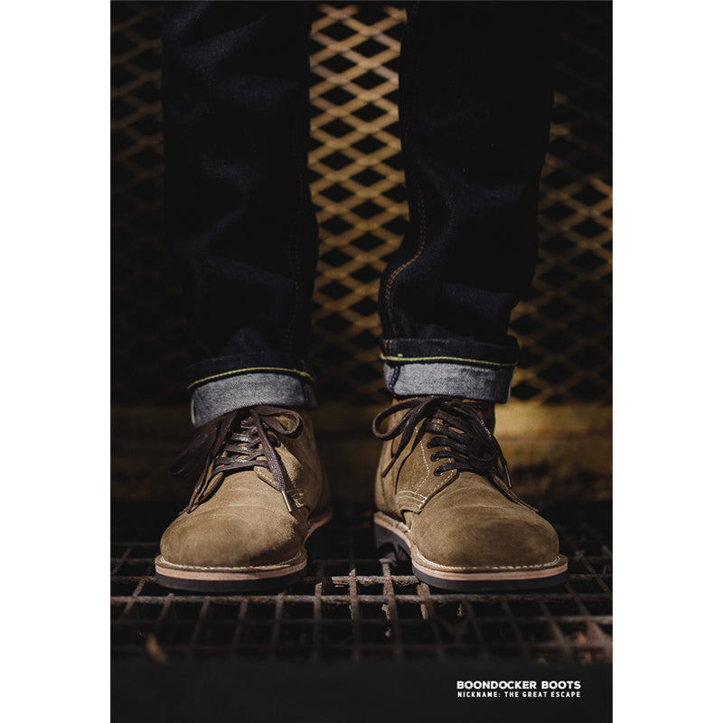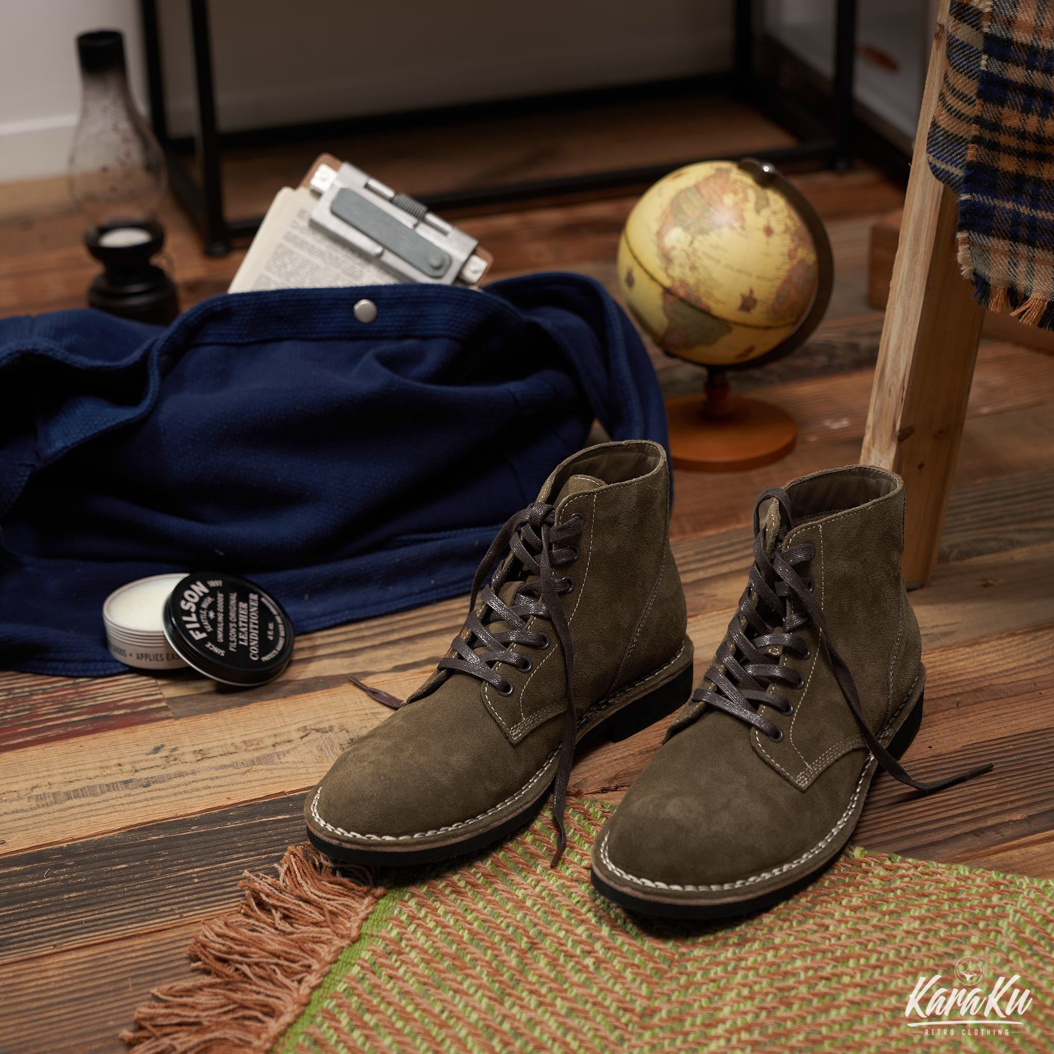 이 M-43 'TYPE III' 서비스화는 두꺼운 소가죽을 뒷면으로 사용하여 제작되었으며, 가죽 표면을 균일하게 만들기 위해 사포로 가공한 후, 고형 파라핀을 녹여 침투시켜 방수 효과를 부여한 제품입니다. 또한, 코튼 평끈을 왁스로 코팅하여 특별히 조합한 끈은 묶으면 꽉 조여 풀리기 어려워, 야전용으로 매우 적합한 특징을 지니고 있습니다.