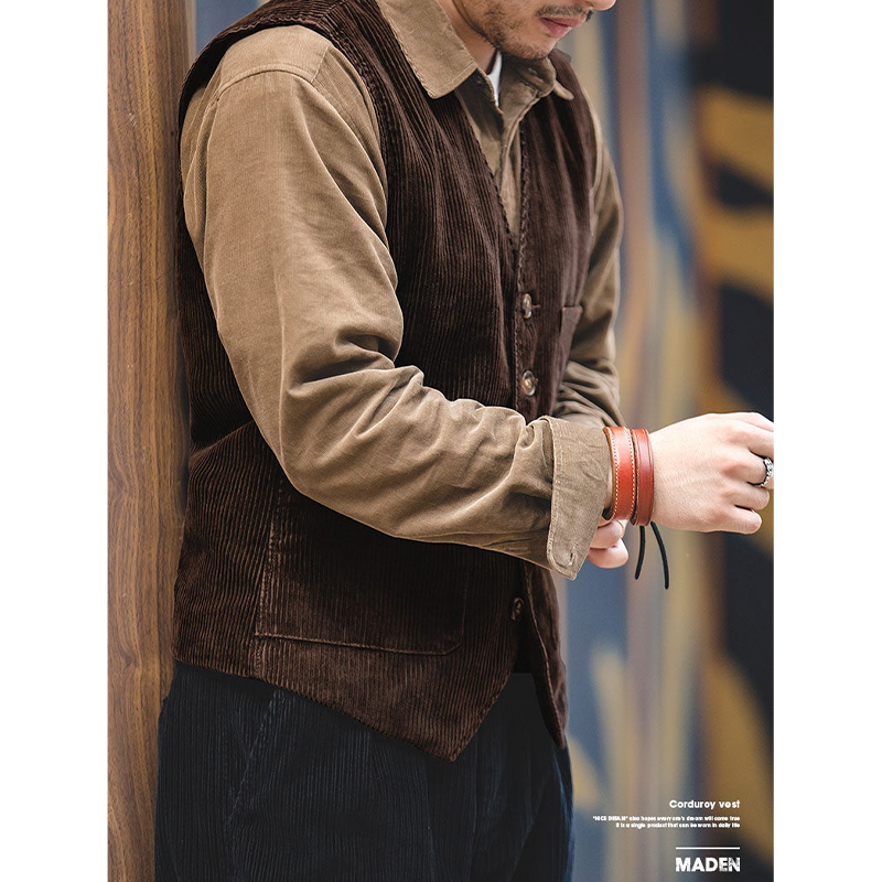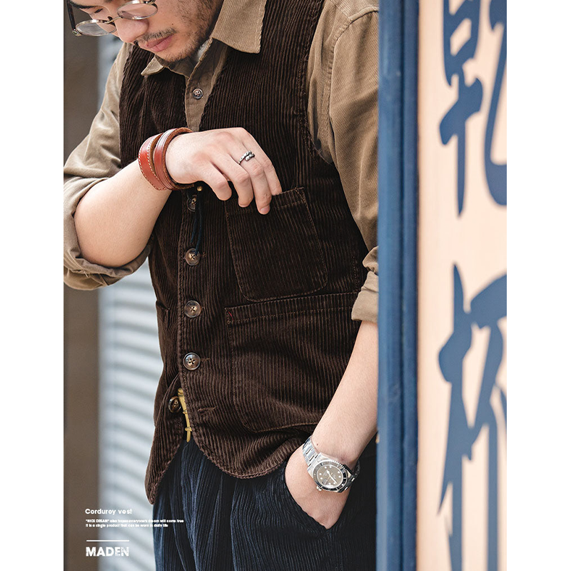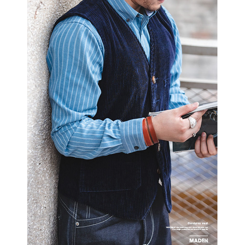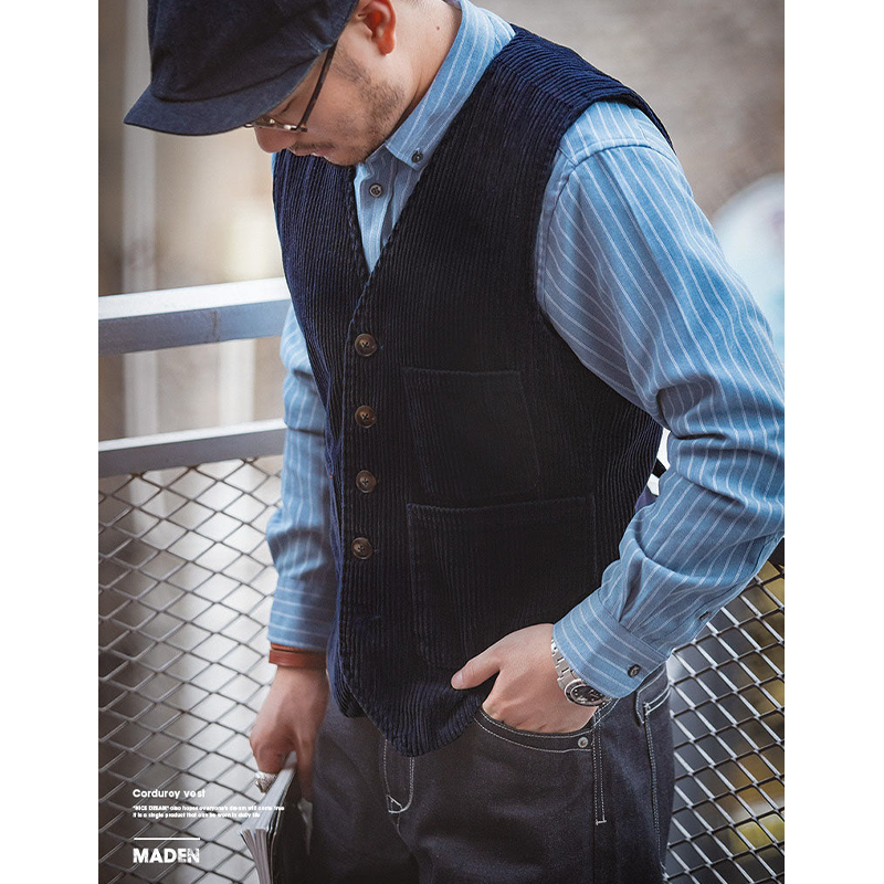 코듀로이 소재로 제작된 브이넥 워크 베스트는 소재 특유의 포근한 분위기를 자아내며, 시간이 지나면서 물빠짐과 보풀이 생기는 자연스러운 경년변화를 즐길 수 있는 아이템입니다. 웜감이 느껴지는 원단으로 가을과 겨울철에 입기 좋습니다.