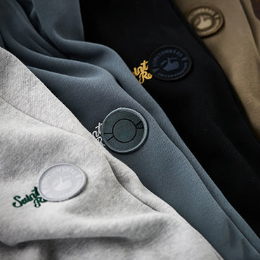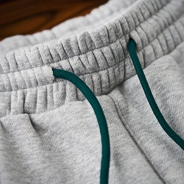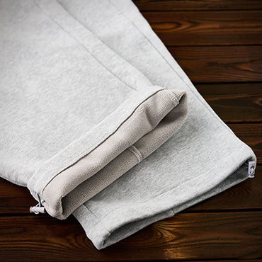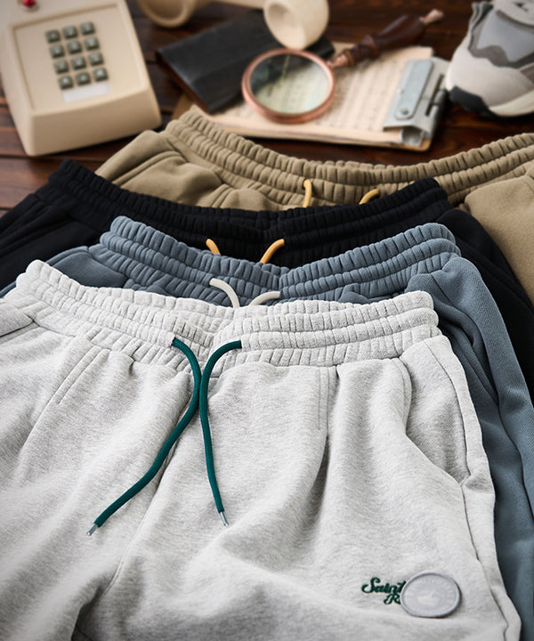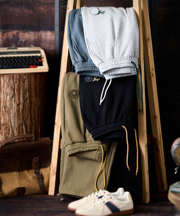 여유로운 실루엣의 스웨트 팬츠로, 오른쪽 허벅지에 영자수와 원형 패치로 브랜드 아이덴티티를 강조하며 드로우 코드와 실용적인 사이드 포켓이 특징입니다.