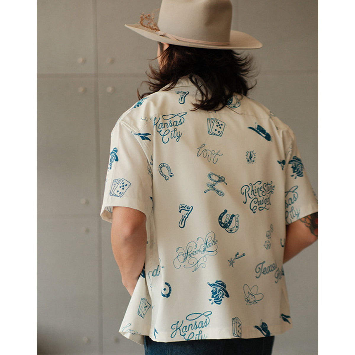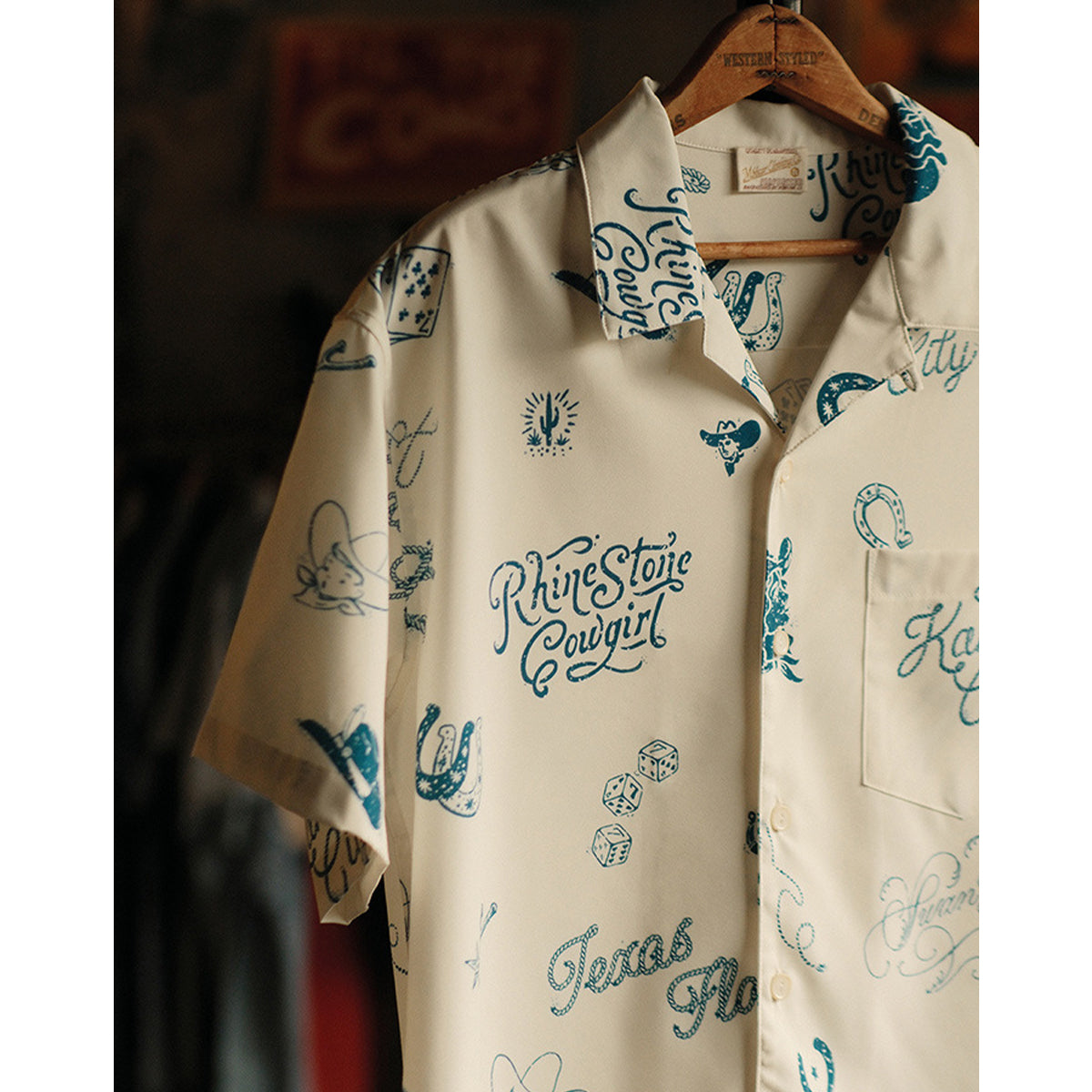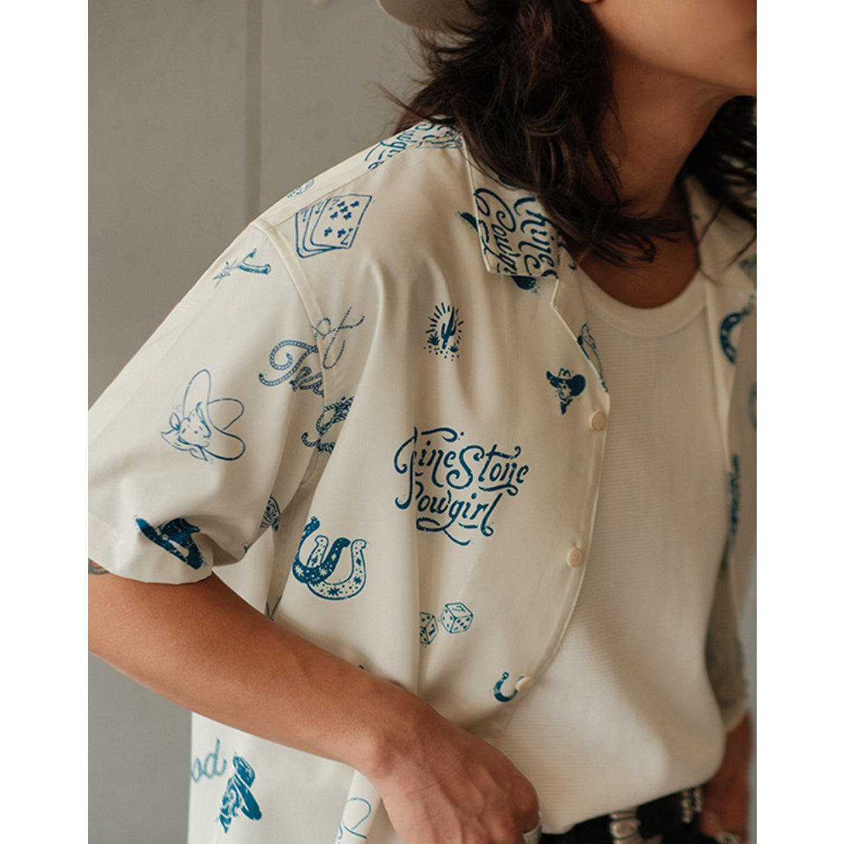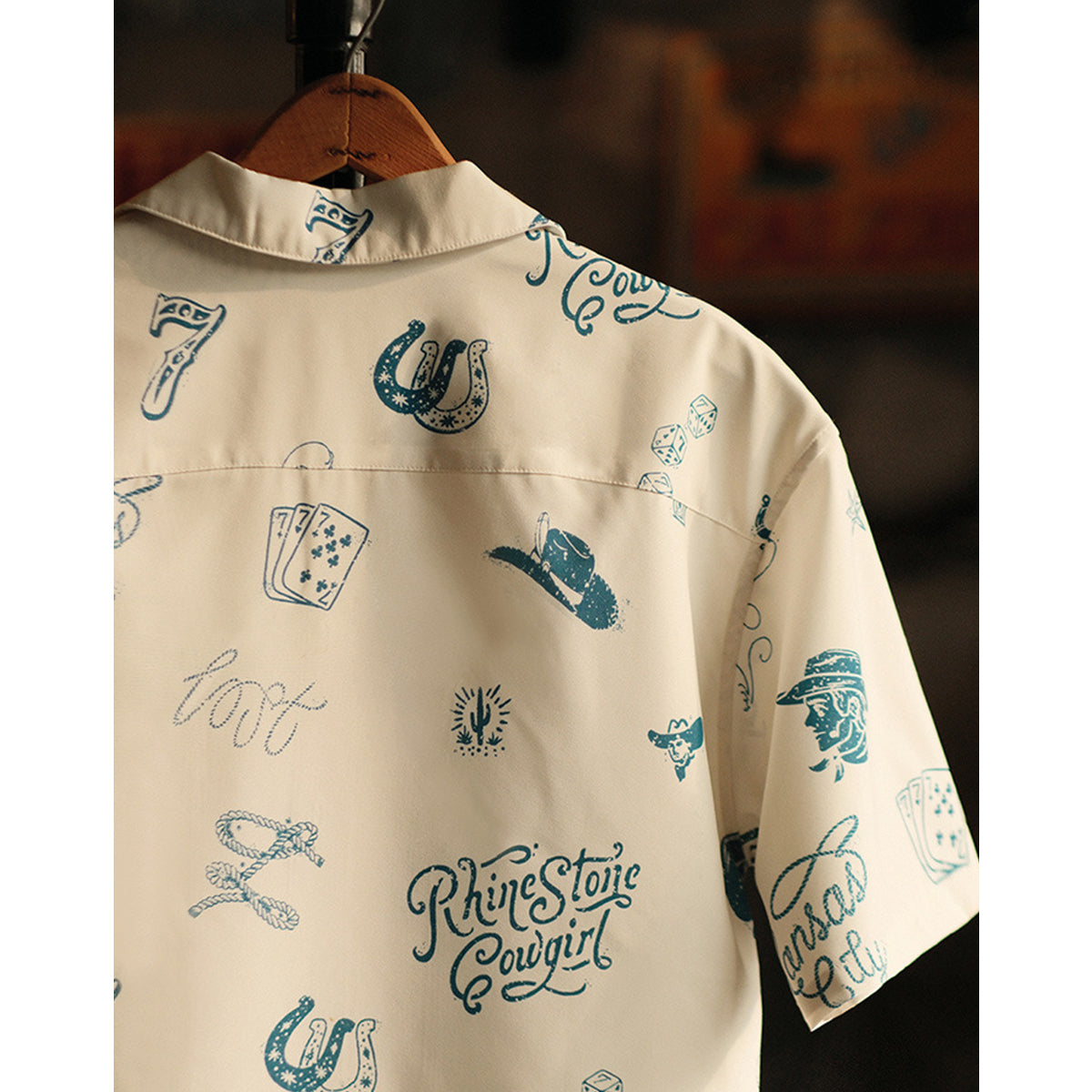 카우보이, 주사위, 포커 카드 등 웨스턴 모티브를 활용한 전체 프린트로, 독특하고 자유로운 분위기를 연출합니다.