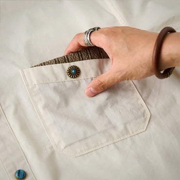 디테일한 아이콘 프린트와 터키석 느낌의 버튼이 돋보이는 면 소재 셔츠입니다. 캐주얼부터 미니멀, 웨스턴룩까지 다양하게 연출할 수 있습니다.
