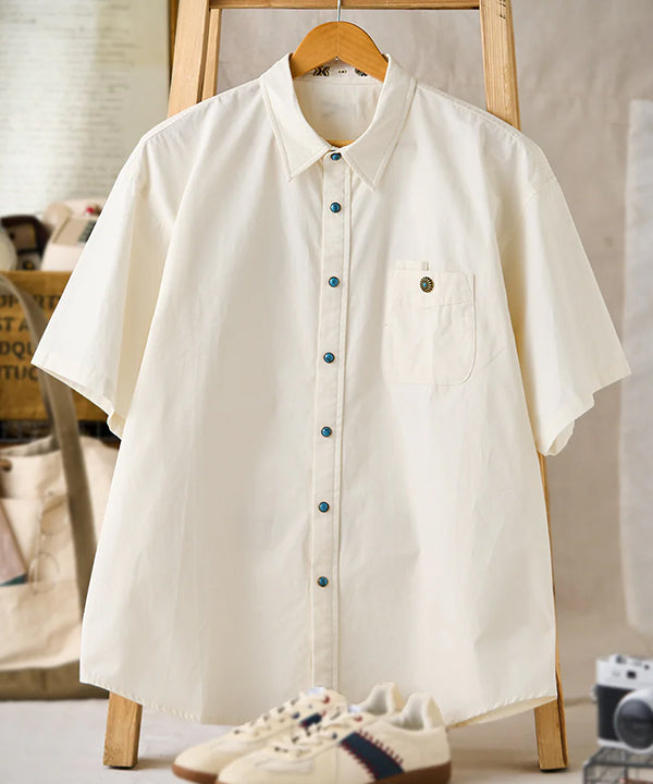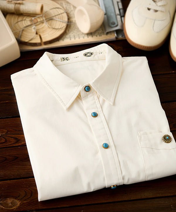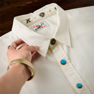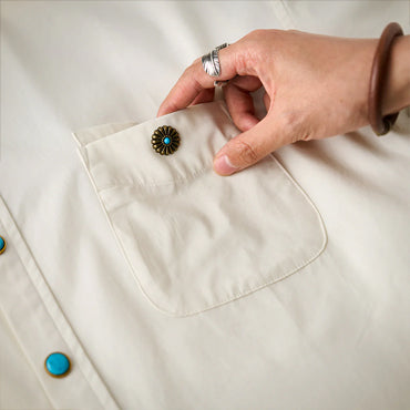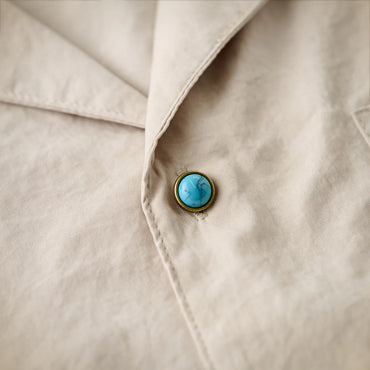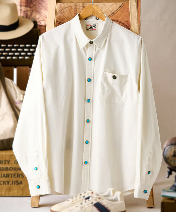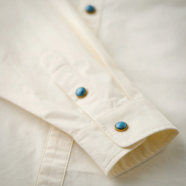 터키석 느낌의 버튼이 돋보이는 혼방 소재 셔츠입니다. 캐주얼부터 미니멀, 웨스턴룩까지 다양하게 연출할 수 있습니다.
