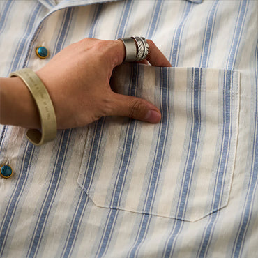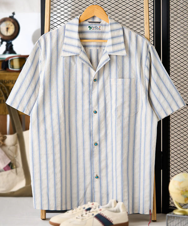 선염 기술로 제작된 자가드직물의 스트라이프 셔츠는 청량한 색감과 유니크한 디자인으로 여름에 적합하며, 부드럽고 쾌적한 착용감을 제공합니다.