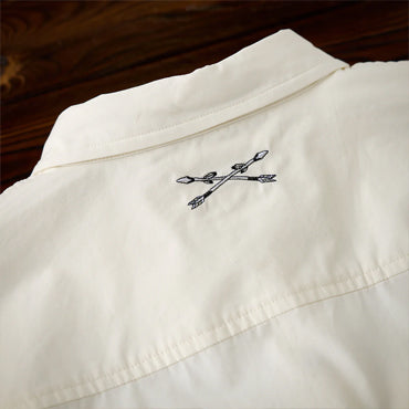 카라 안쪽의 아이콘 프린트와 터키석 느낌의 메탈 버튼, 등판의 교차 화살 자수가 어우러져 섬세하고 고급스러운 포인트를 더한 디자인입니다.