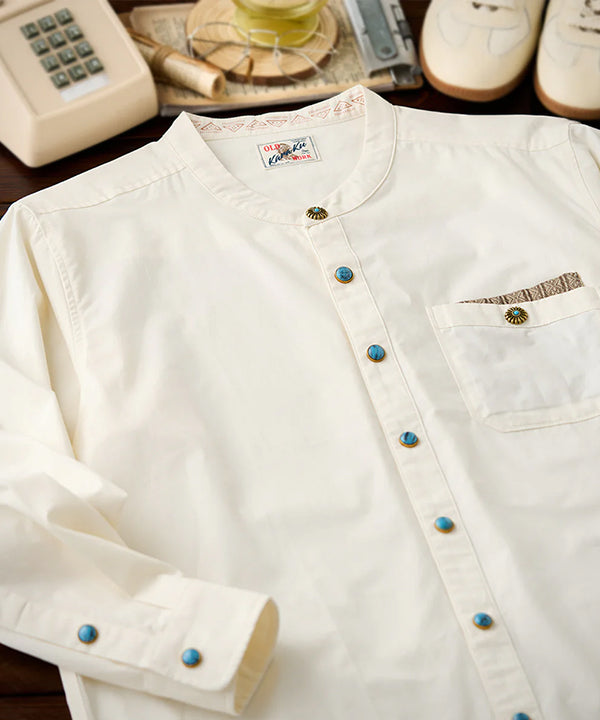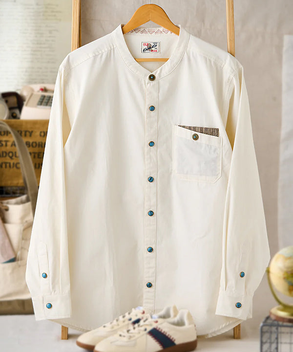 에스닉 프린트와 터키석 버튼 장식의 면 셔츠이며 데님/치노팬츠 캐주얼부터 미니멀 코디까지 유연한 스타일링 가능합니다.