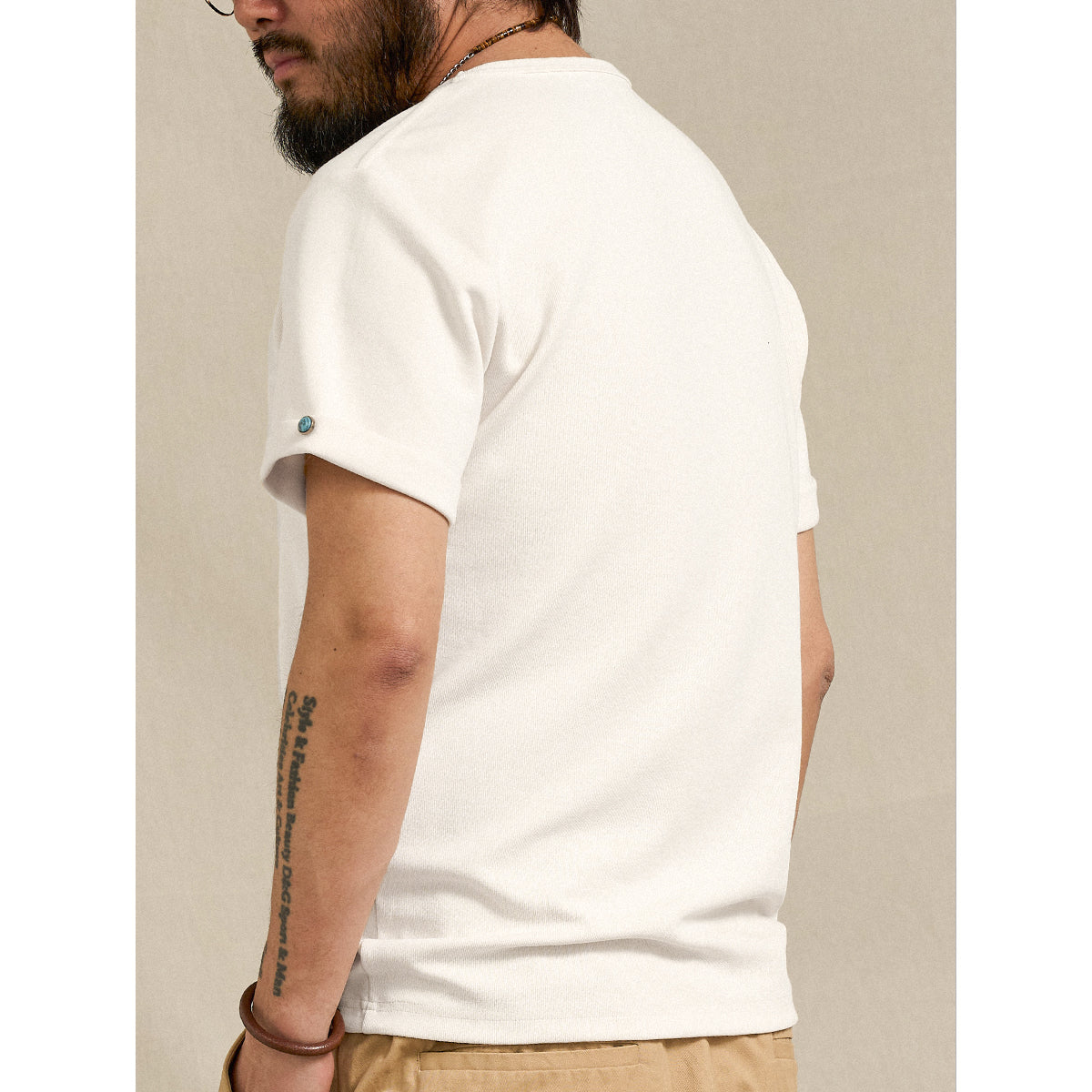 가볍고 산뜻한 텍스처와 입체감 있는 디자인이 매력적인 에어 레이어드 포켓 티셔츠입니다. 소매 끝에는 터키석 느낌의 장식 버튼을 더해줍니다.