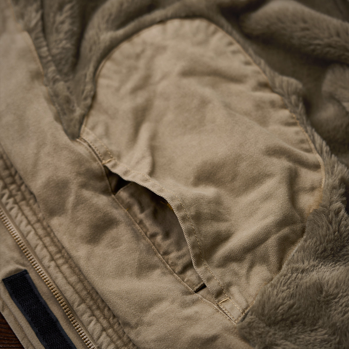 스탠드 칼라와 지퍼·벨크로 이중 구조로 보온성과 방풍성을 강화했으며, 실용적인 포켓 구성으로 수납력까지 갖춘 자켓입니다. 여유 있는 박스형 실루엣과 페이크 퍼 안감으로 편안한 착용감과 뛰어난 보온성을 제공합니다.