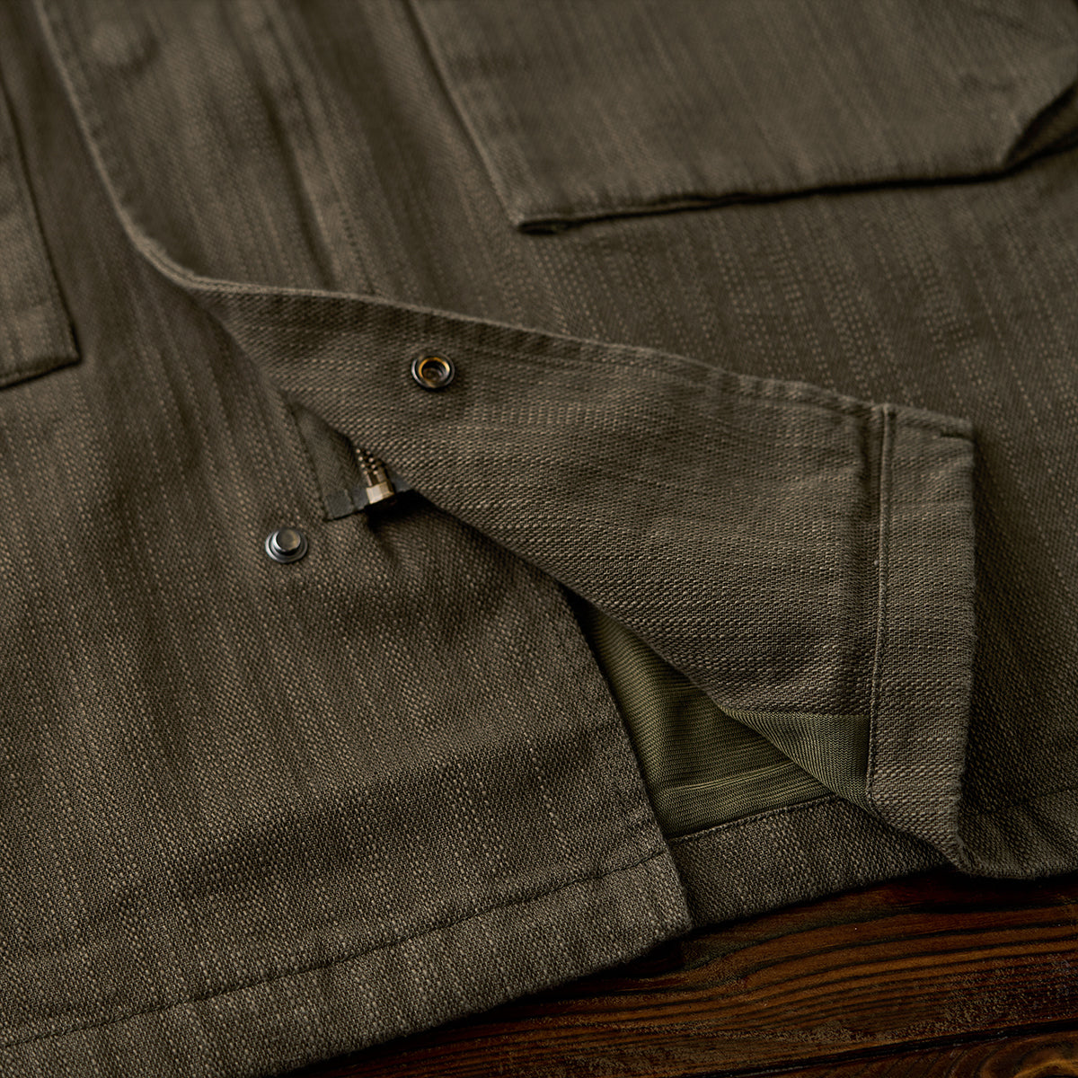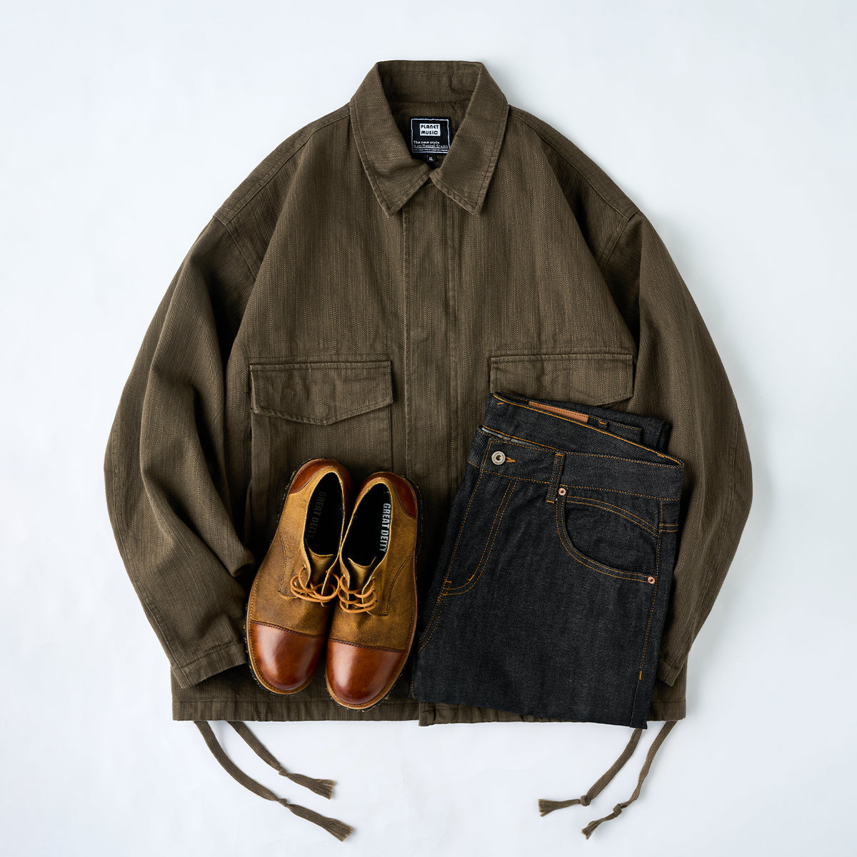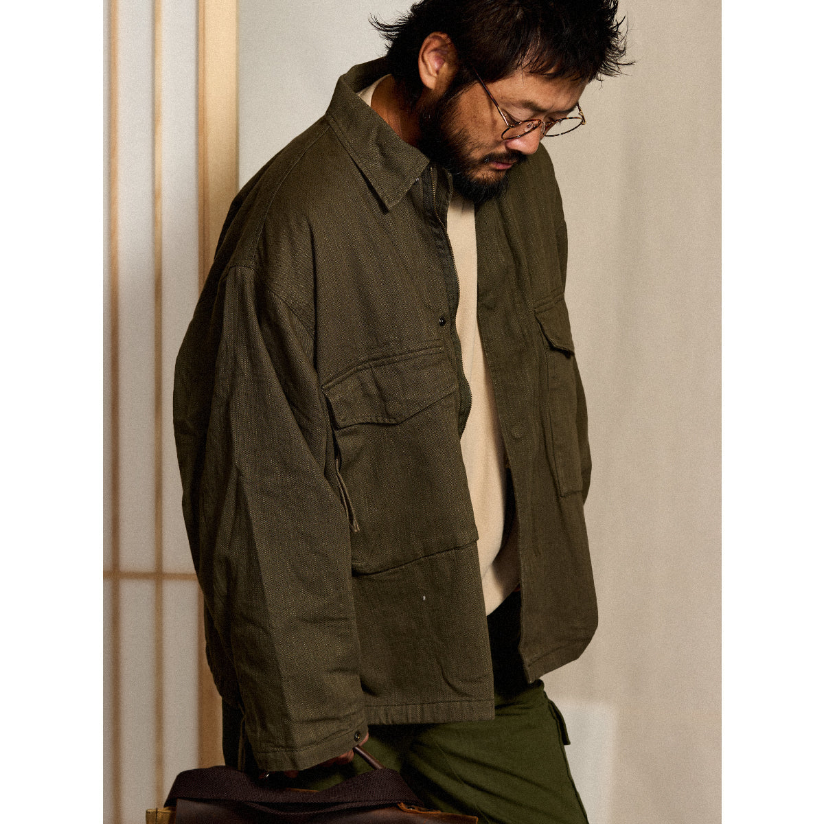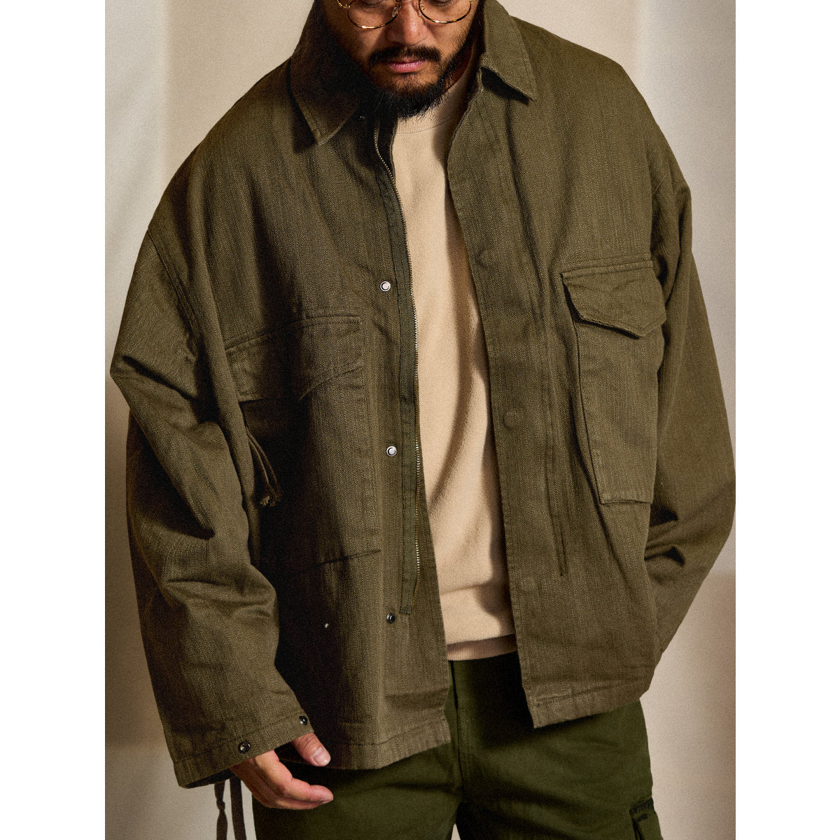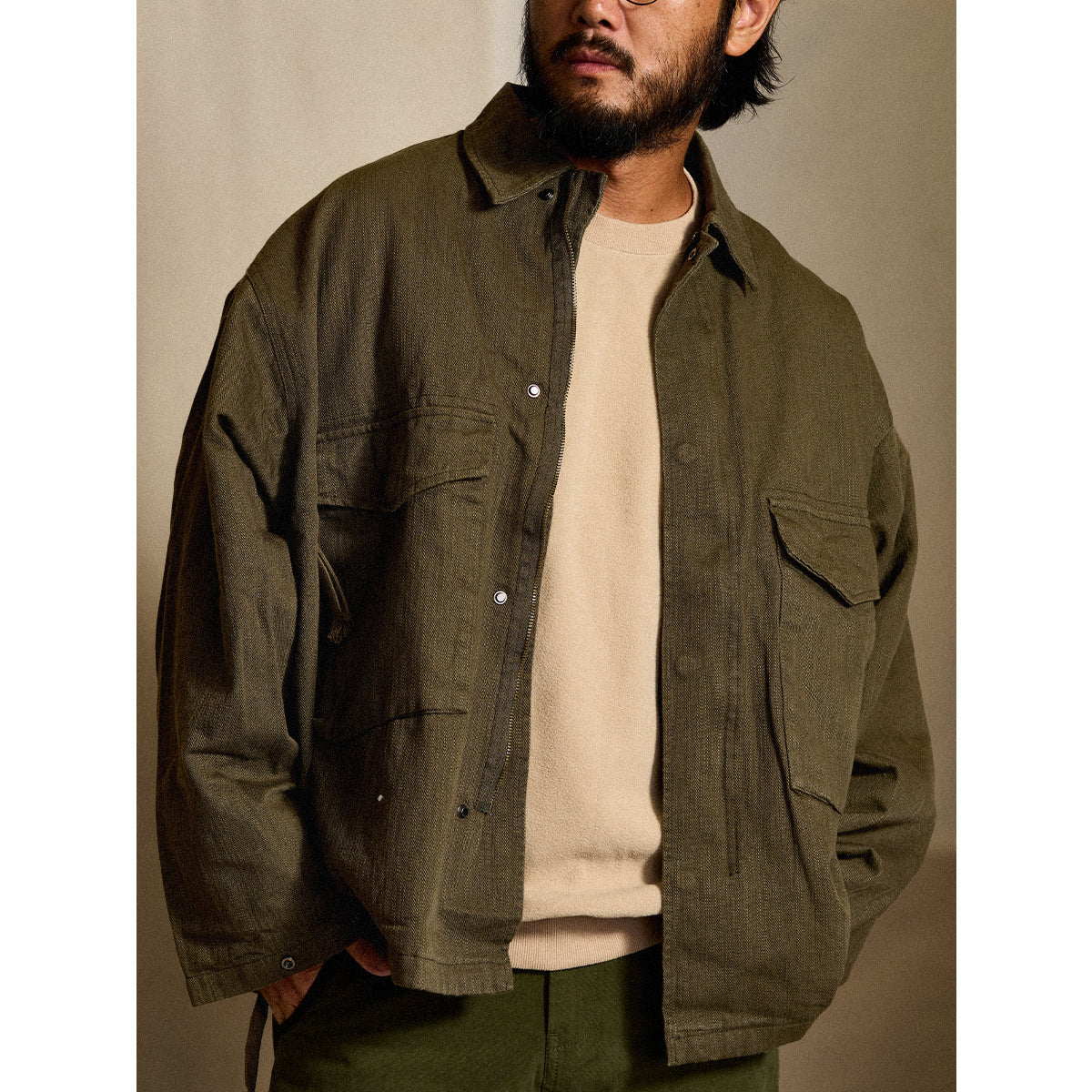 큰 플랩 포켓과 숨겨진 지퍼 포켓 수납공간이 돋보이는 워크 자켓으로, 밑단 드로우코드로 스트레이트핏이나 컴팩트한 스타일을 연출할 수 있습니다.