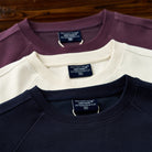 래글런 슬리브와 리브 처리로 편안하고 트렌디한 핏, 네이비·오프화이트·퍼플 3색 구성의 활용도 높은 스웨트셔츠.