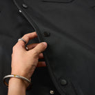 왼쪽 소매의 지퍼 포켓이 시선을 사로잡는 포인트로, 흰색 라인이 블랙 바탕과의 대비를 이루며 심플한 실루엣에 생동감을 더합니다.