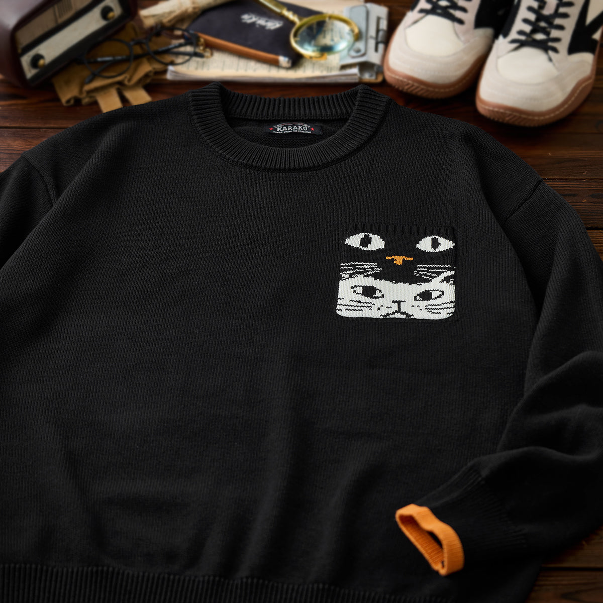 【사전예약】소매 오렌지 배색 자카드 짜임 고양이 얼굴 포켓 니트 스웨터