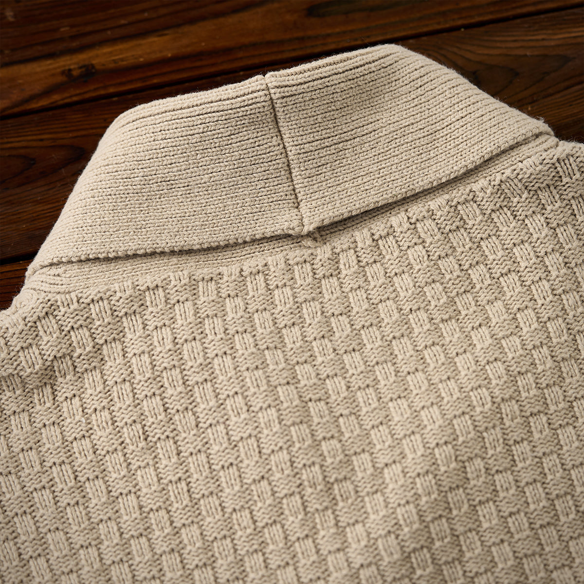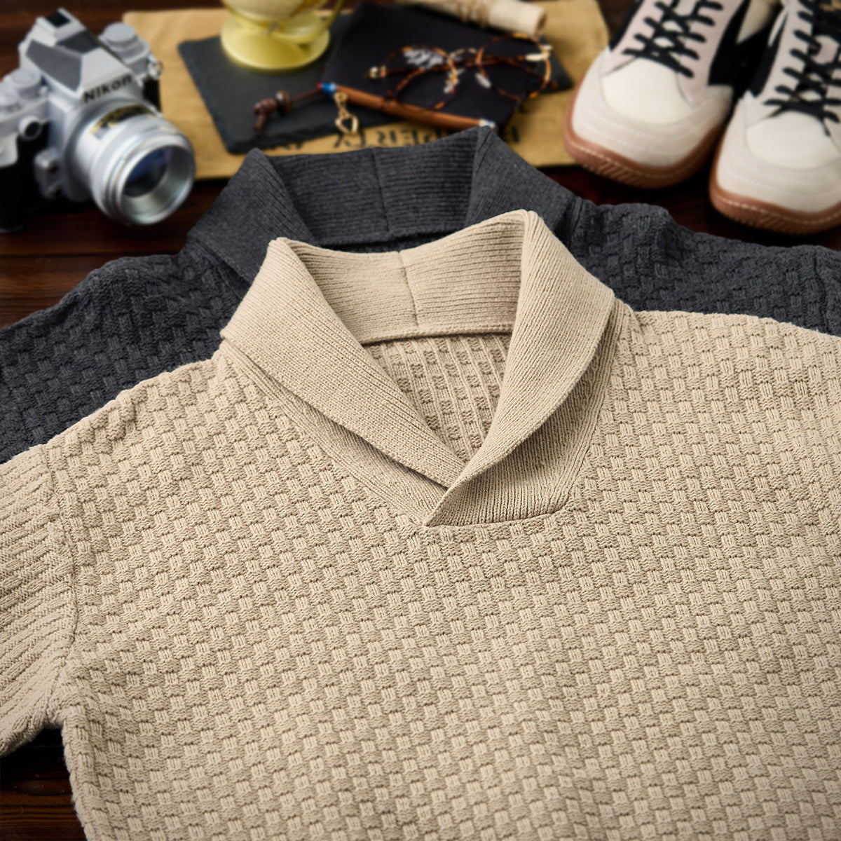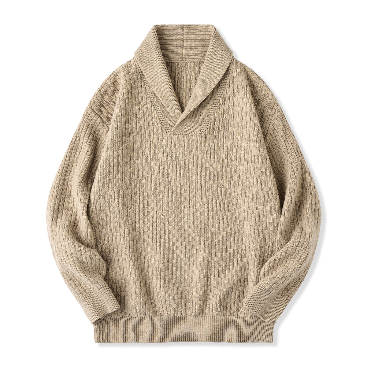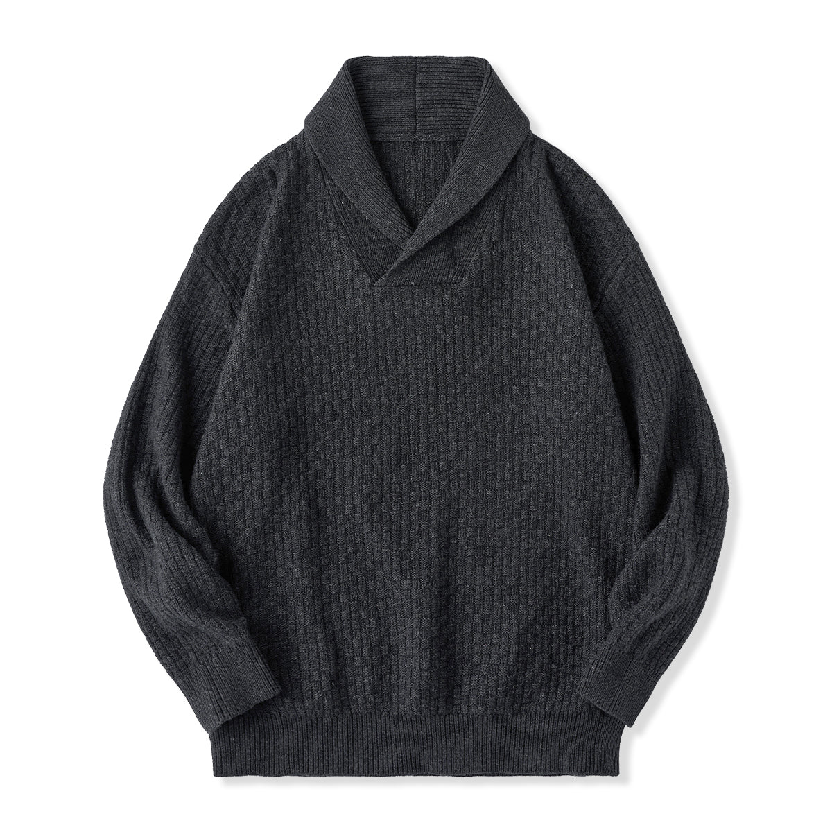 울 혼방 체크 자카드 짜임 숄칼라 니트 스웨터