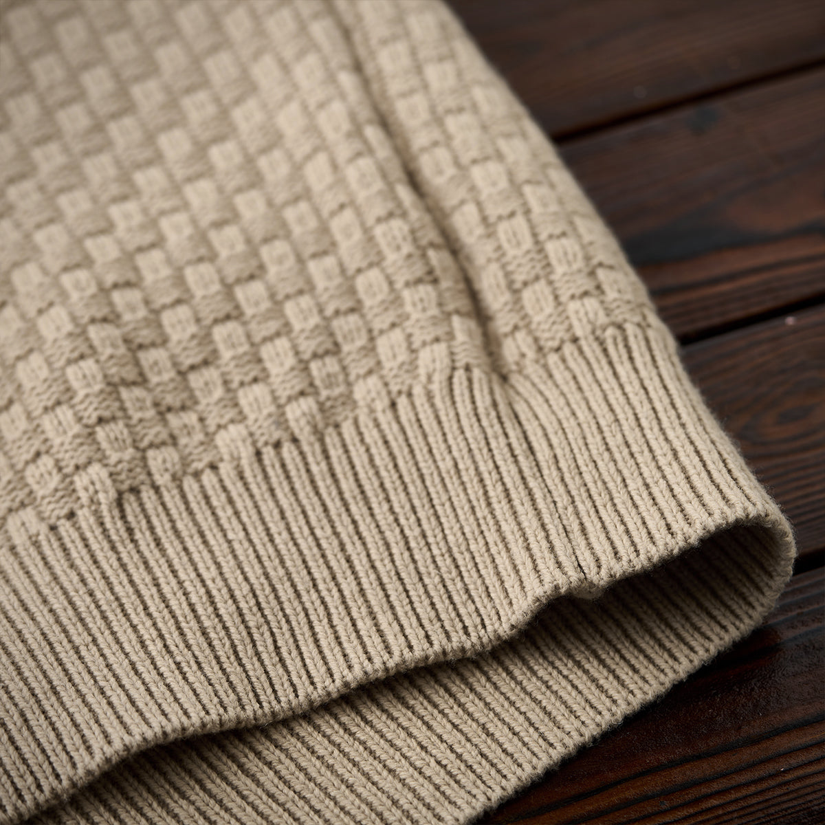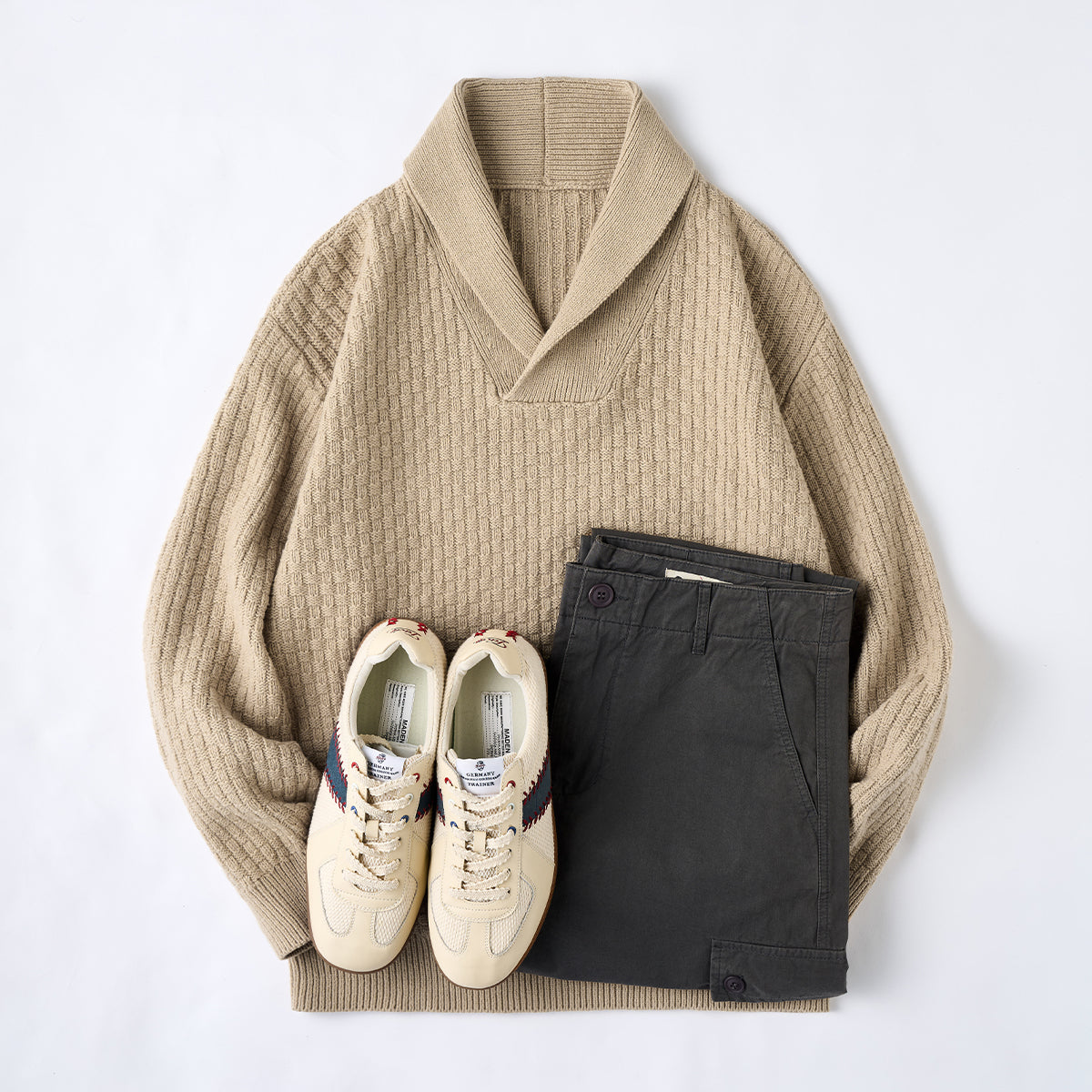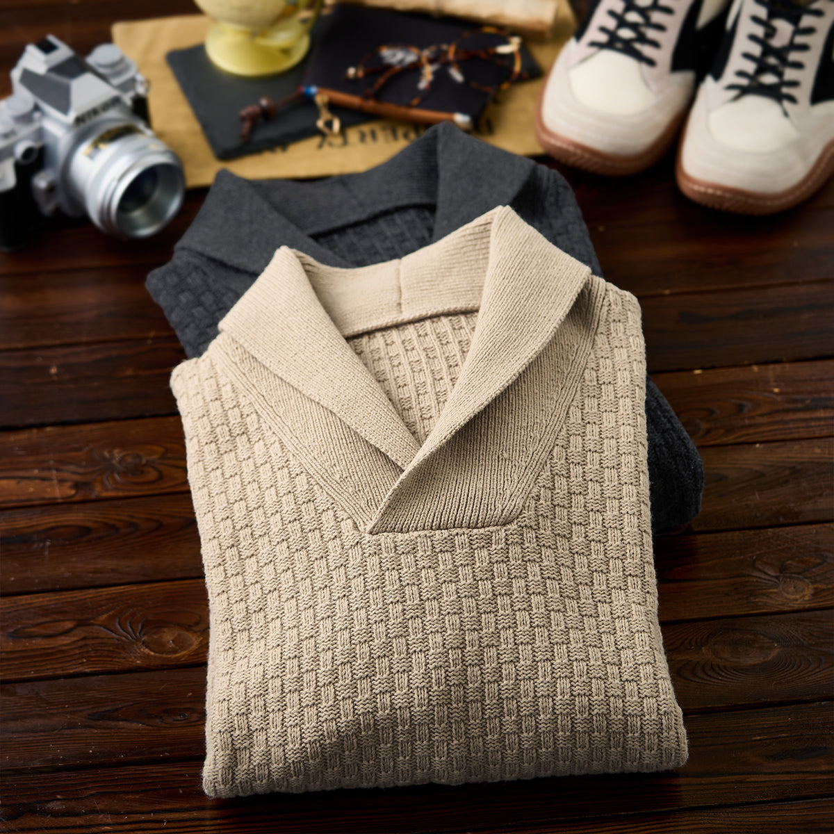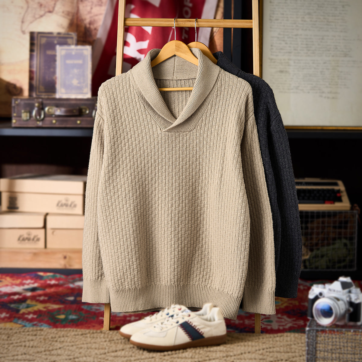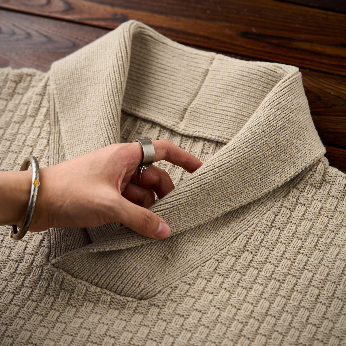 울 혼방 체크 자카드 짜임 숄칼라 니트 스웨터