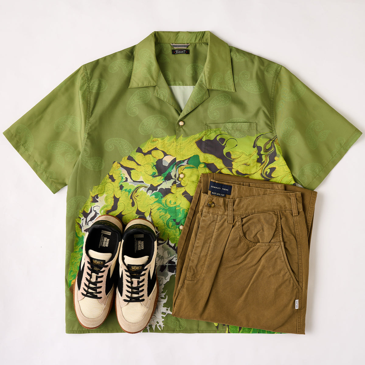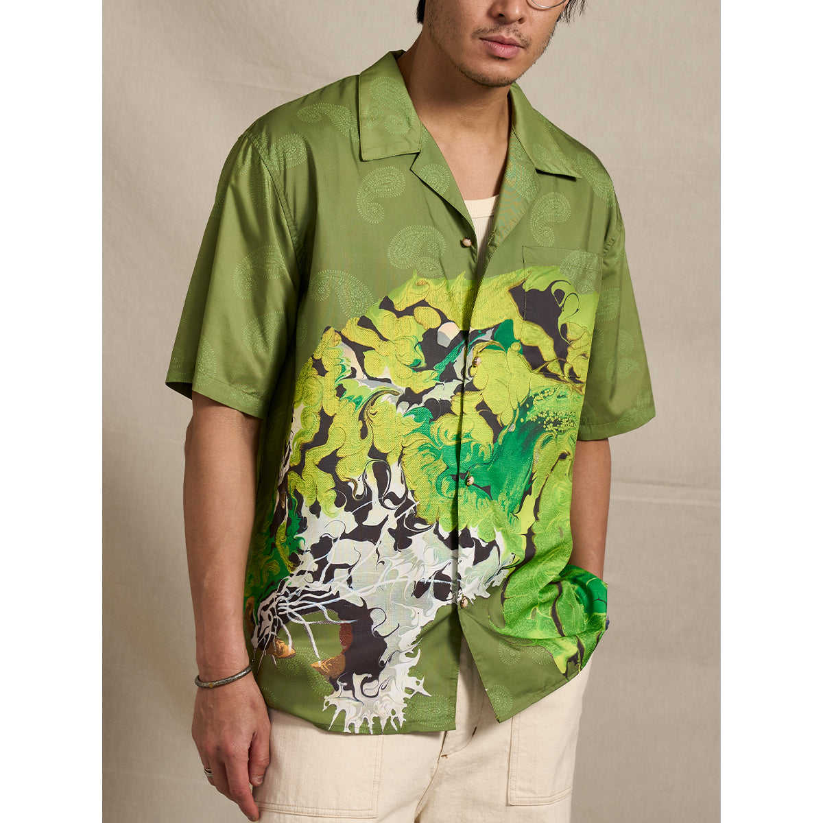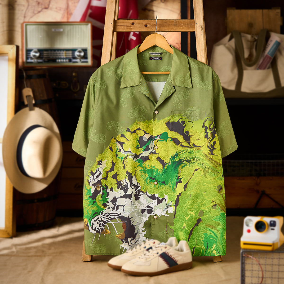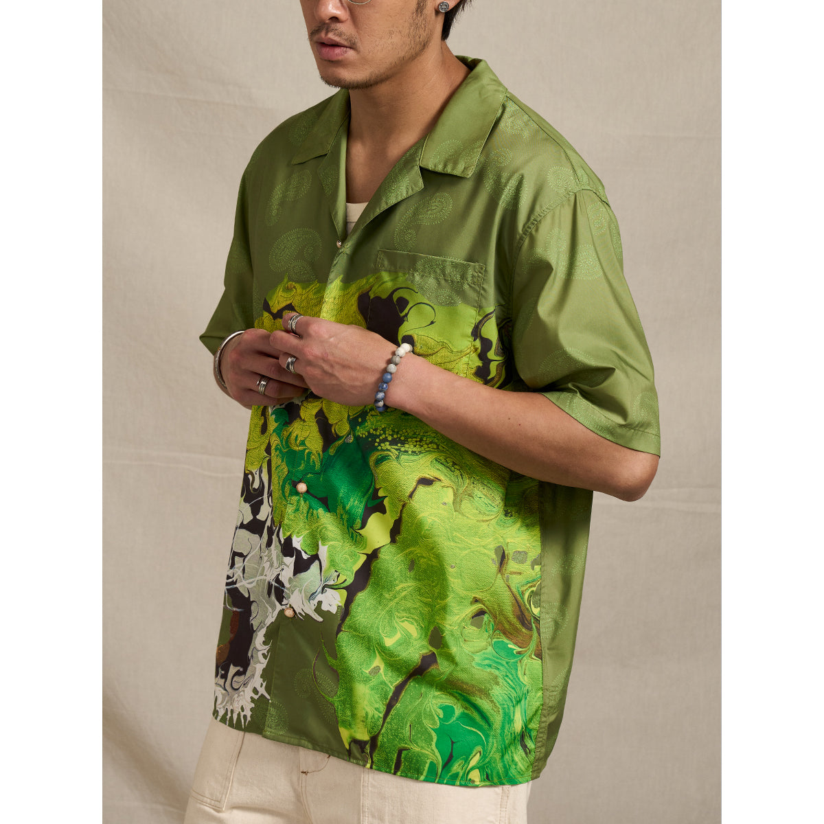 KARAKU×田中ラオウ「Green drift」화이트 아게이트풍 단추 알로하 셔츠