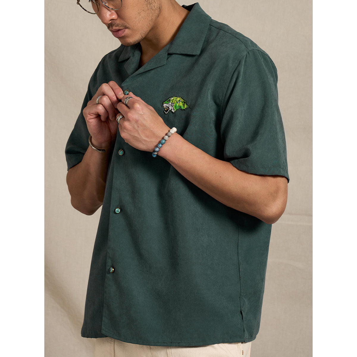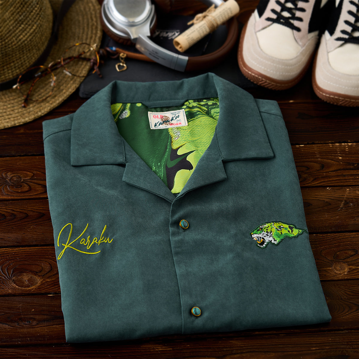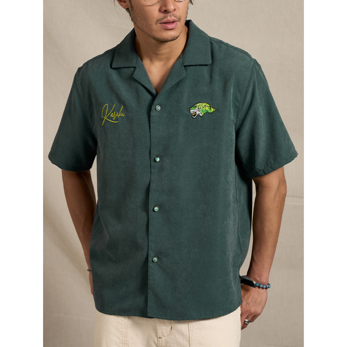 KARAKU×田中ラオウ「Green drift」호랑이 자수 피치 스킨 쿠바 카라 셔츠