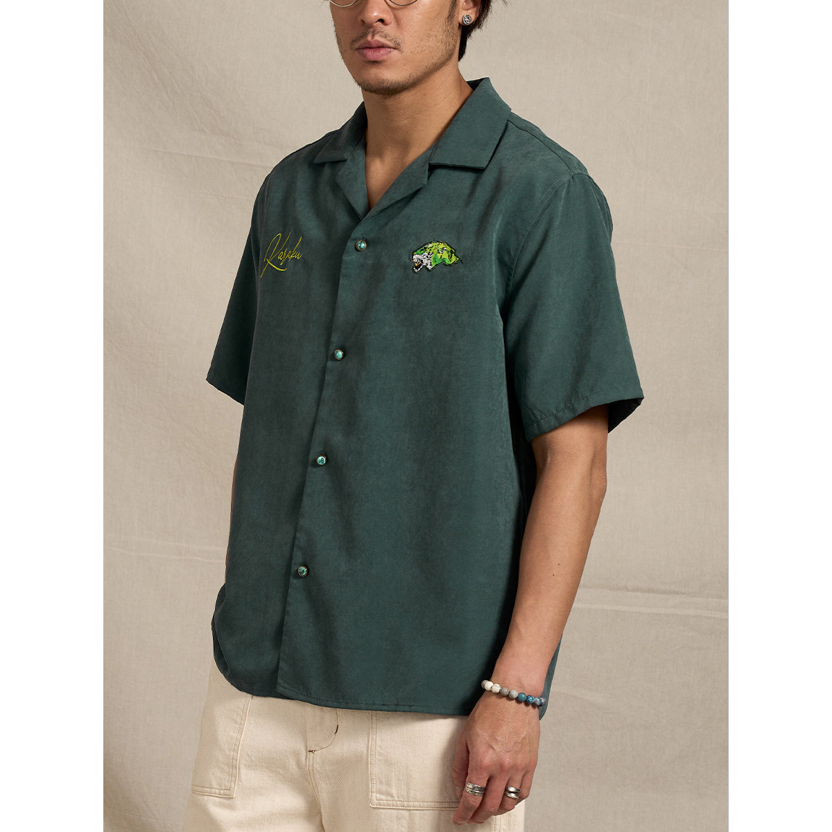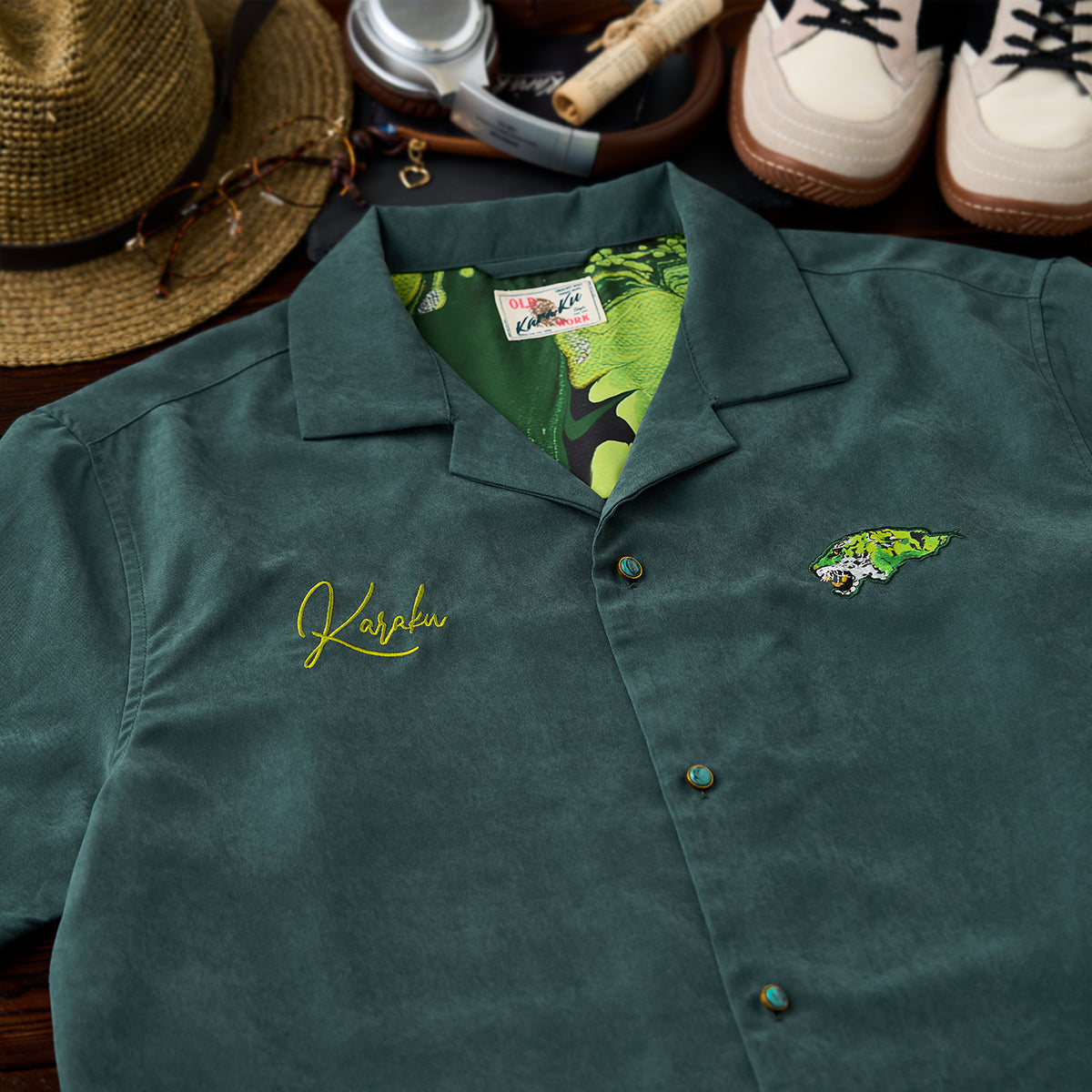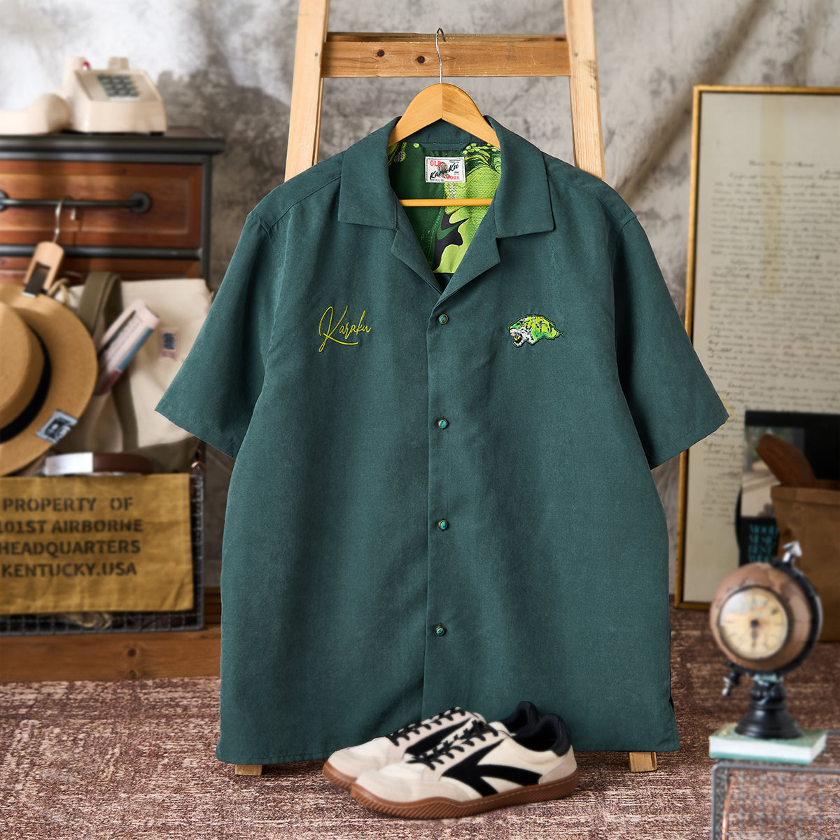 KARAKU×田中ラオウ「Green drift」호랑이 자수 피치 스킨 쿠바 카라 셔츠