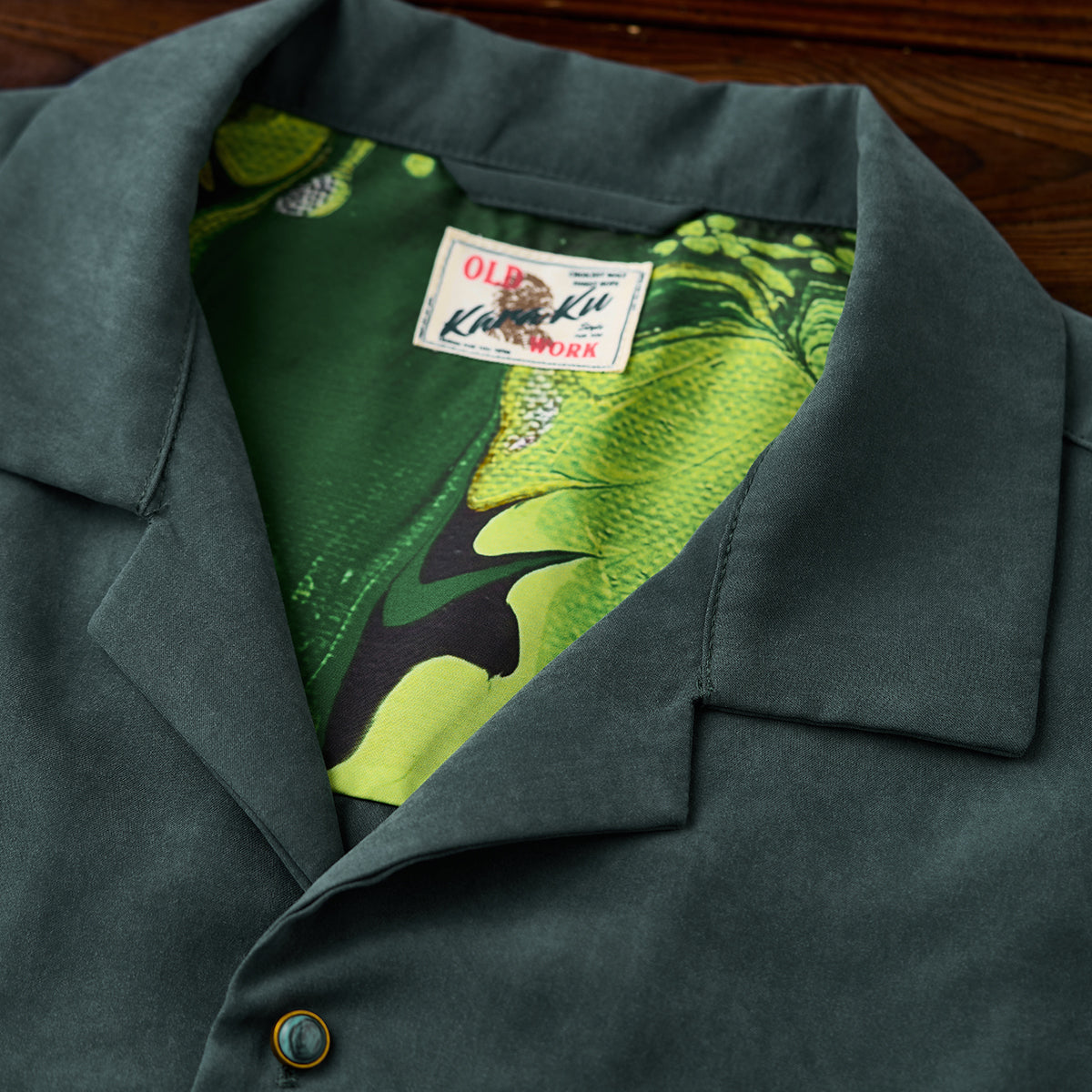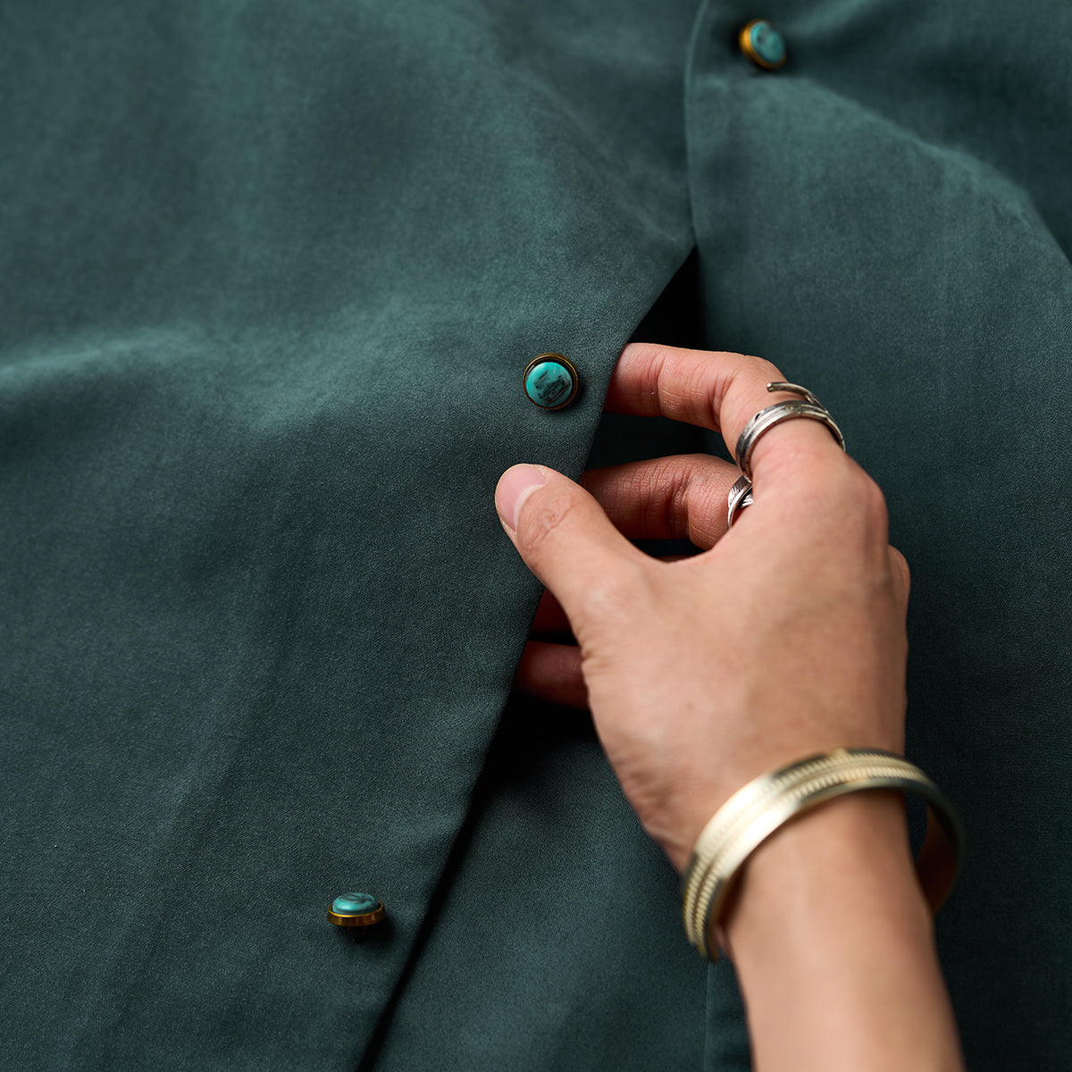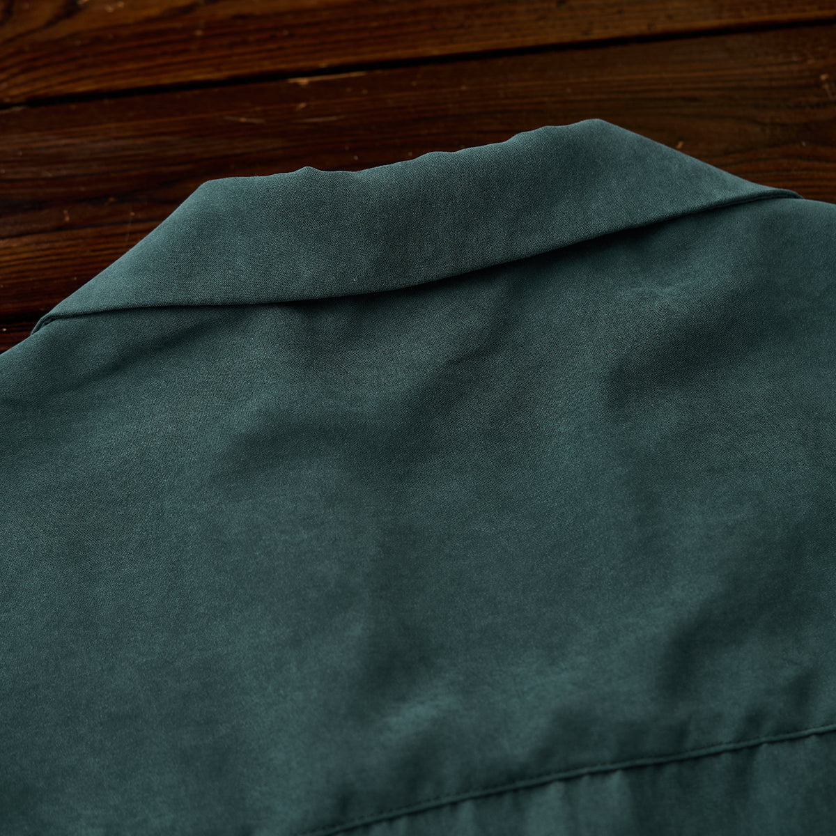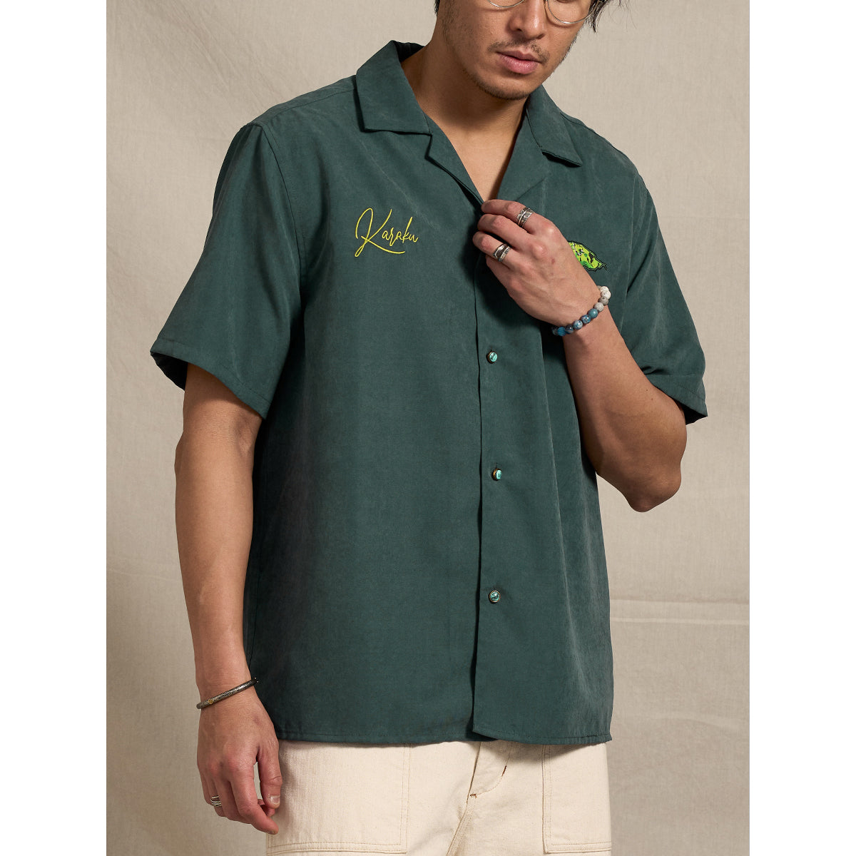 KARAKU×田中ラオウ 협업 쿠바 카라 셔츠로, 터콰이즈 버튼과「Green drift」디테일로 포인트를 더했습니다. 가슴 양쪽의 자수 디자인으로 균형감을 살렸습니다