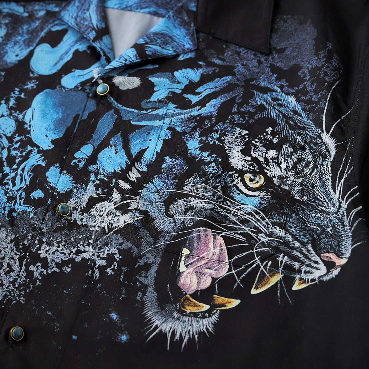 정교한 호랑이 그래픽과 프리미엄 텐셀 소재로 제작된 오픈 카라 셔츠로, 캐주얼부터 리조트까지 다양한 스타일링이 가능한 아이템입니다.