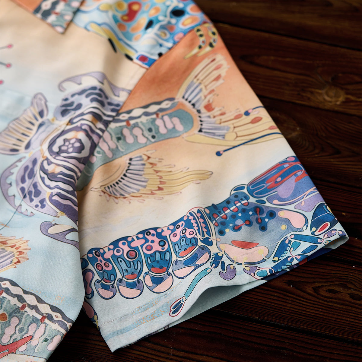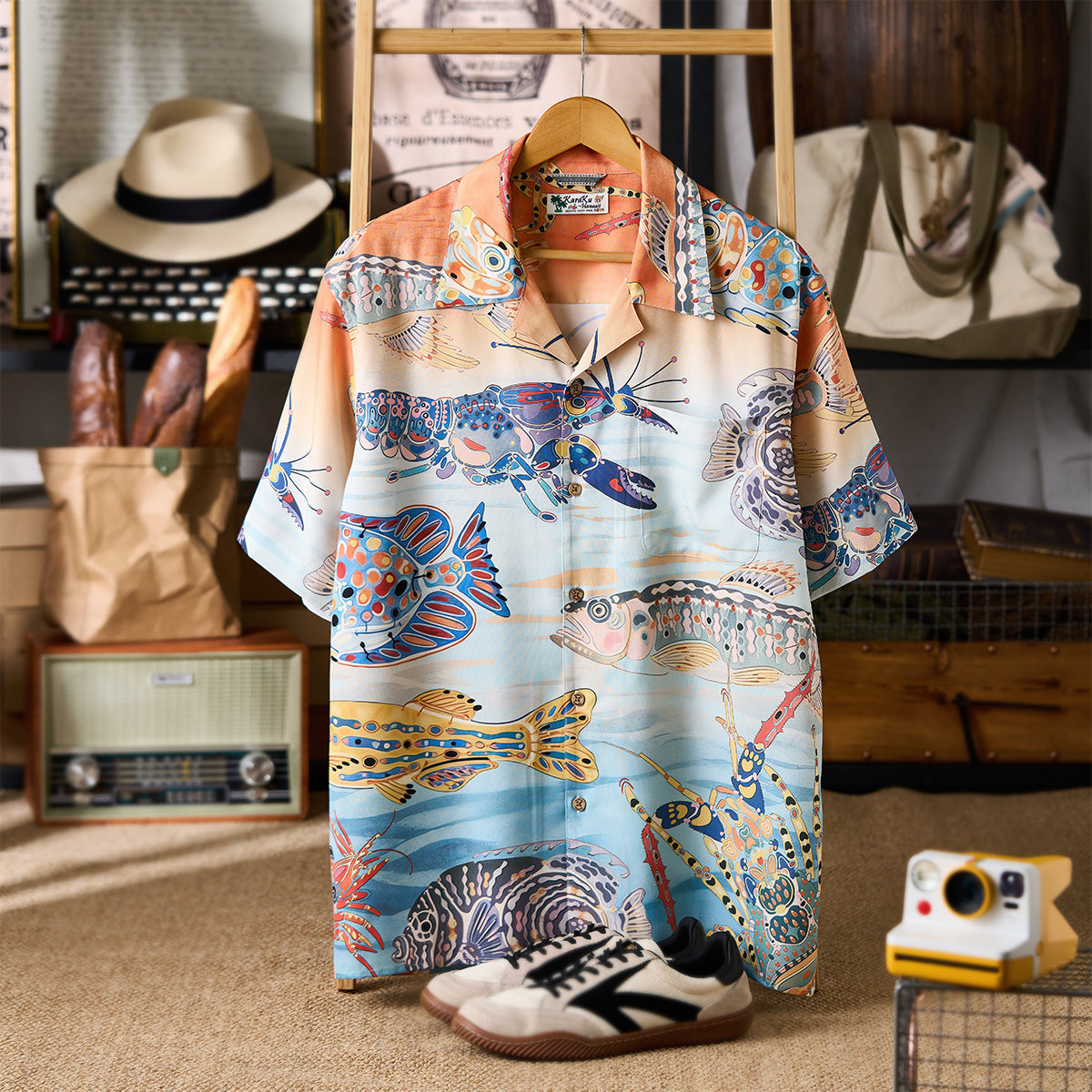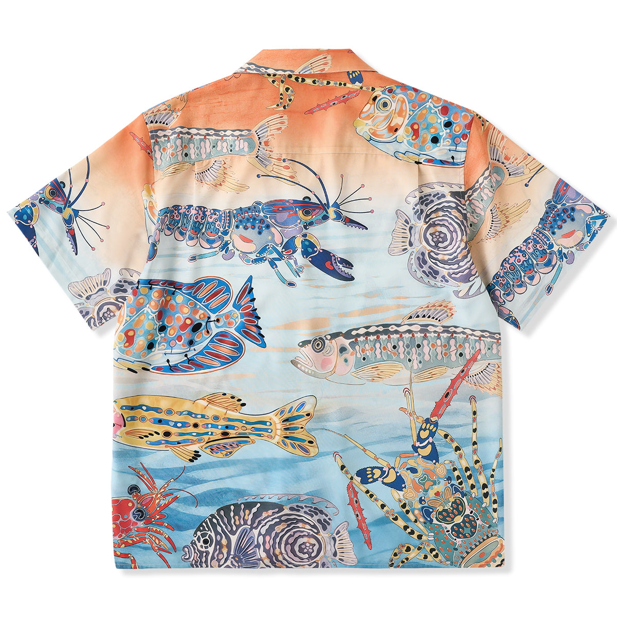물고기와 새우가 셔츠 전체를 가득 채워, 바다의 고요함과 석양의 따스함을 전합니다.