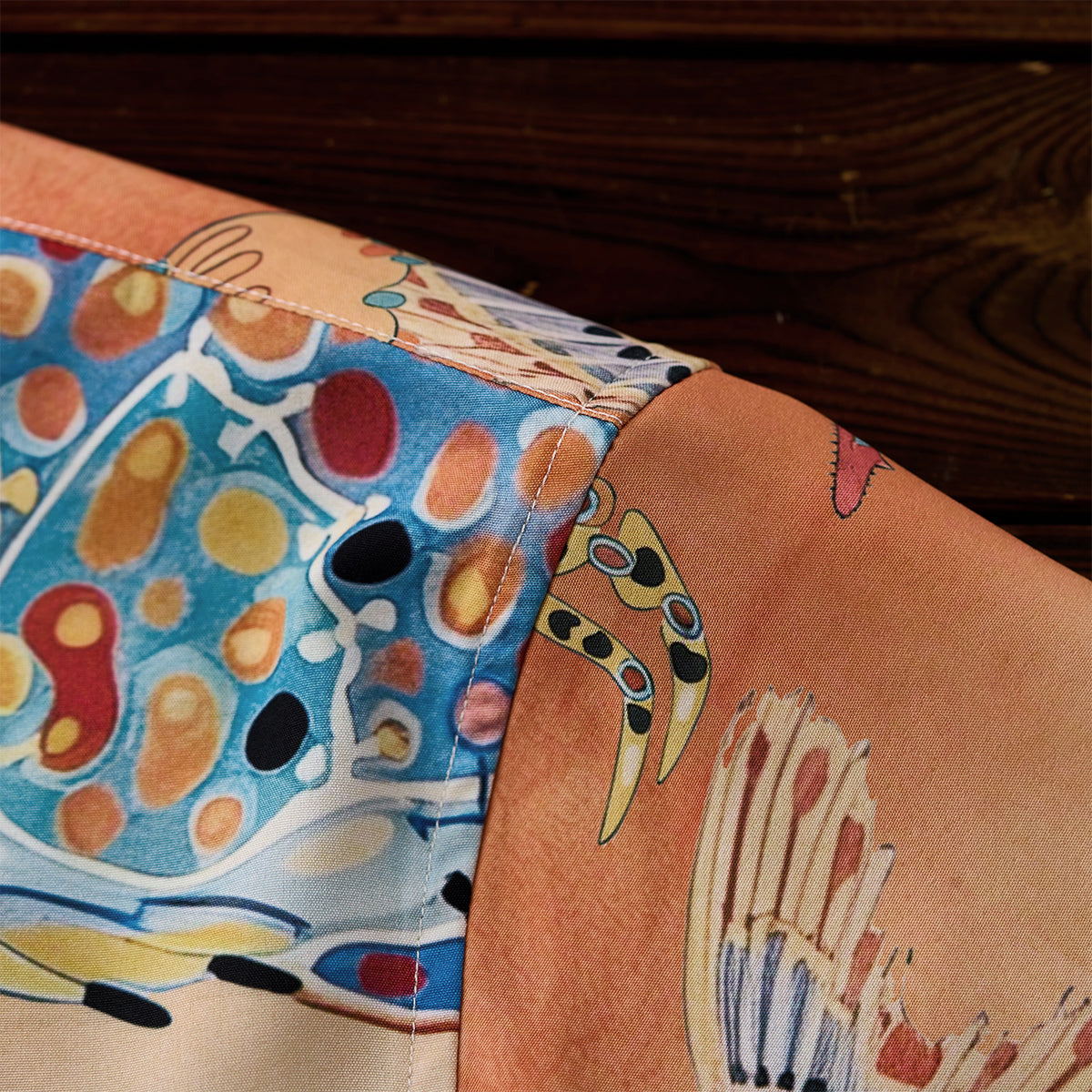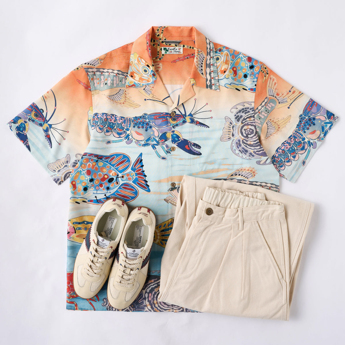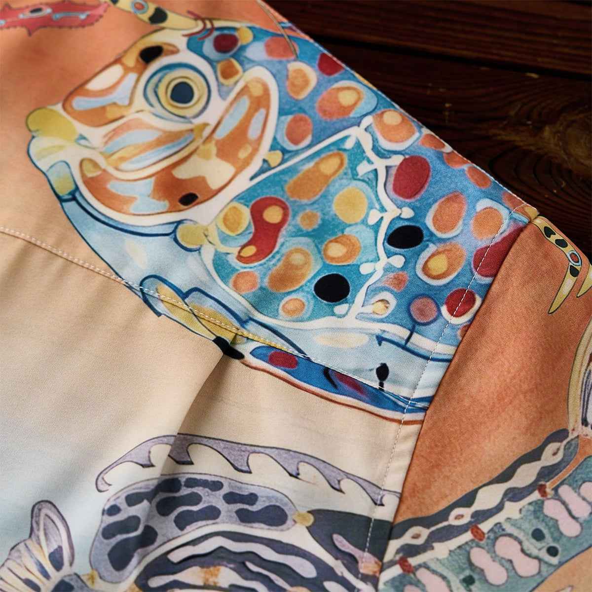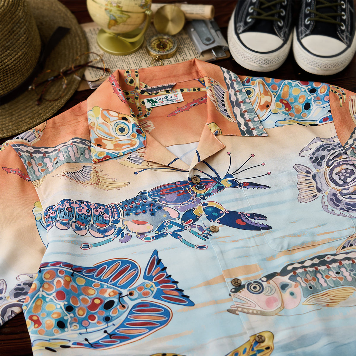물고기와 새우가 셔츠 전체를 가득 채워, 바다의 고요함과 석양의 따스함을 전합니다.