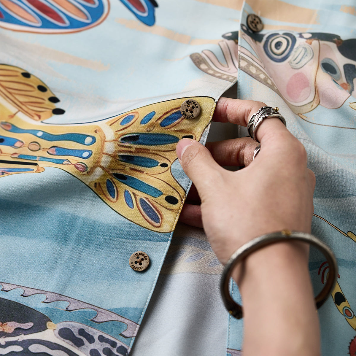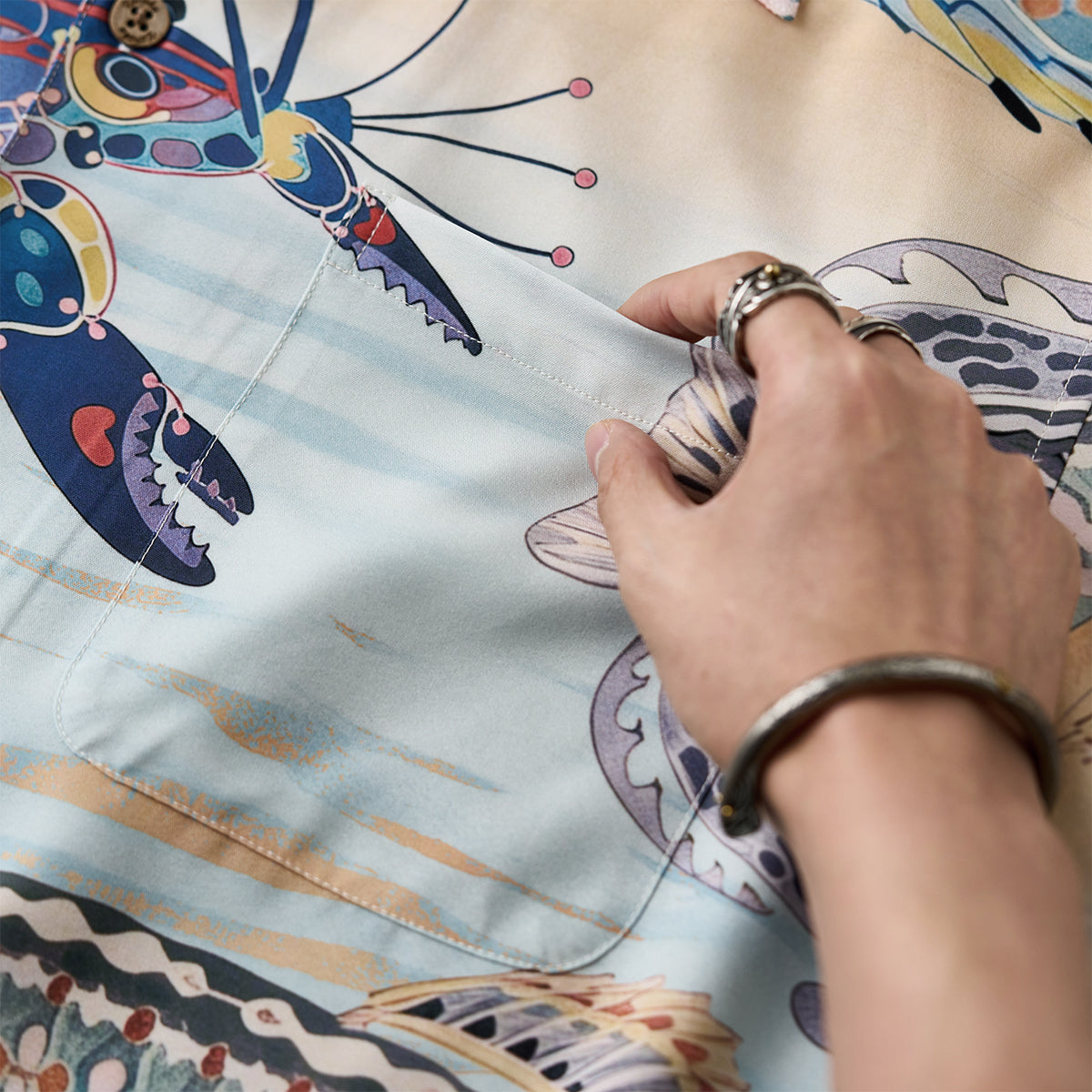 노을빛 바닷속 세계를 수채화 느낌으로 표현한 알로하 셔츠입니다. 가벼운 착용감의 릴랙스 핏과 오픈칼라 디자인으로, 데님이나 반바지와 매치하기 좋은 여름 아이템입니다.