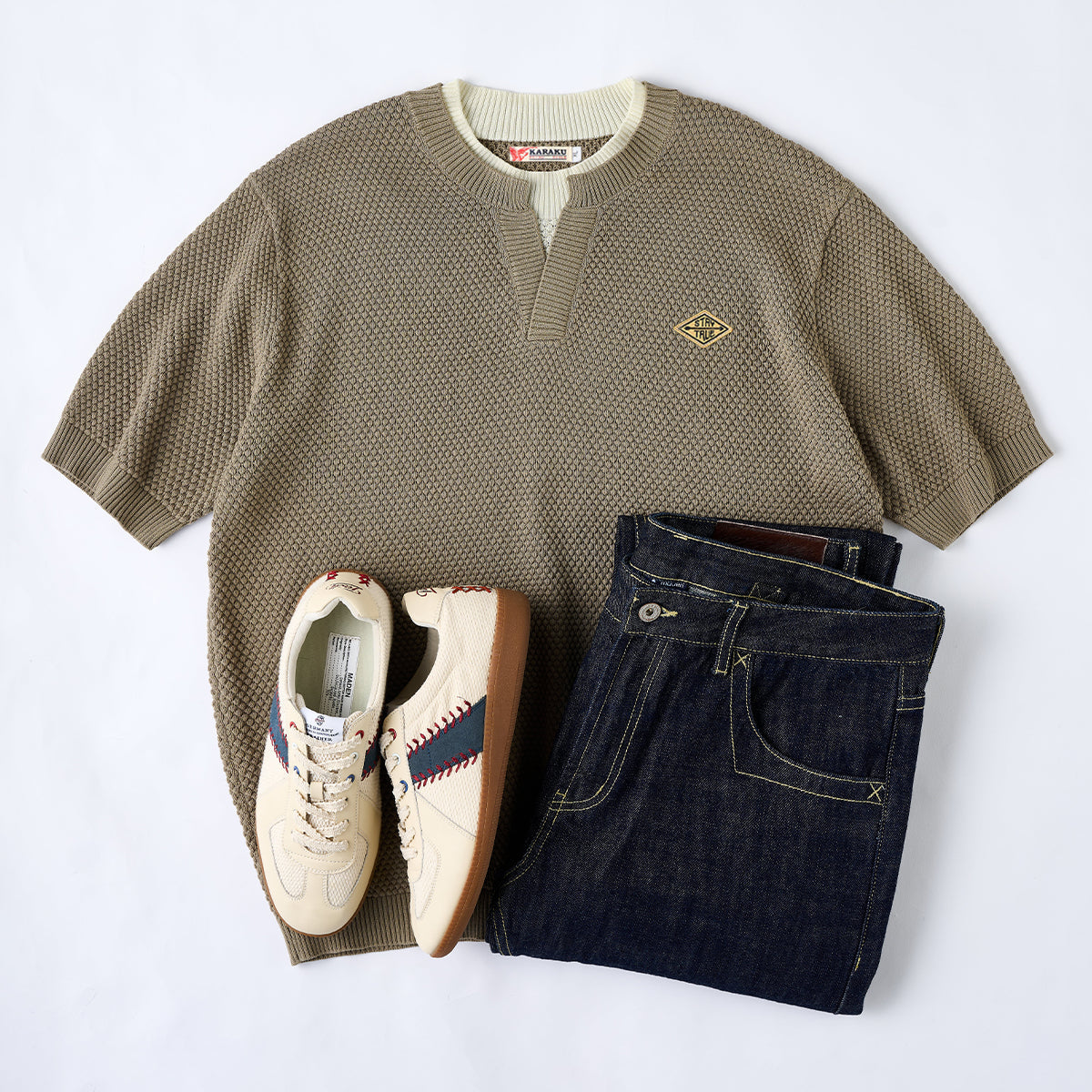 【사전예약】「STAY TRUE」자수 와펜 페이크 레이어드 파인애플 파일 니트 티셔츠