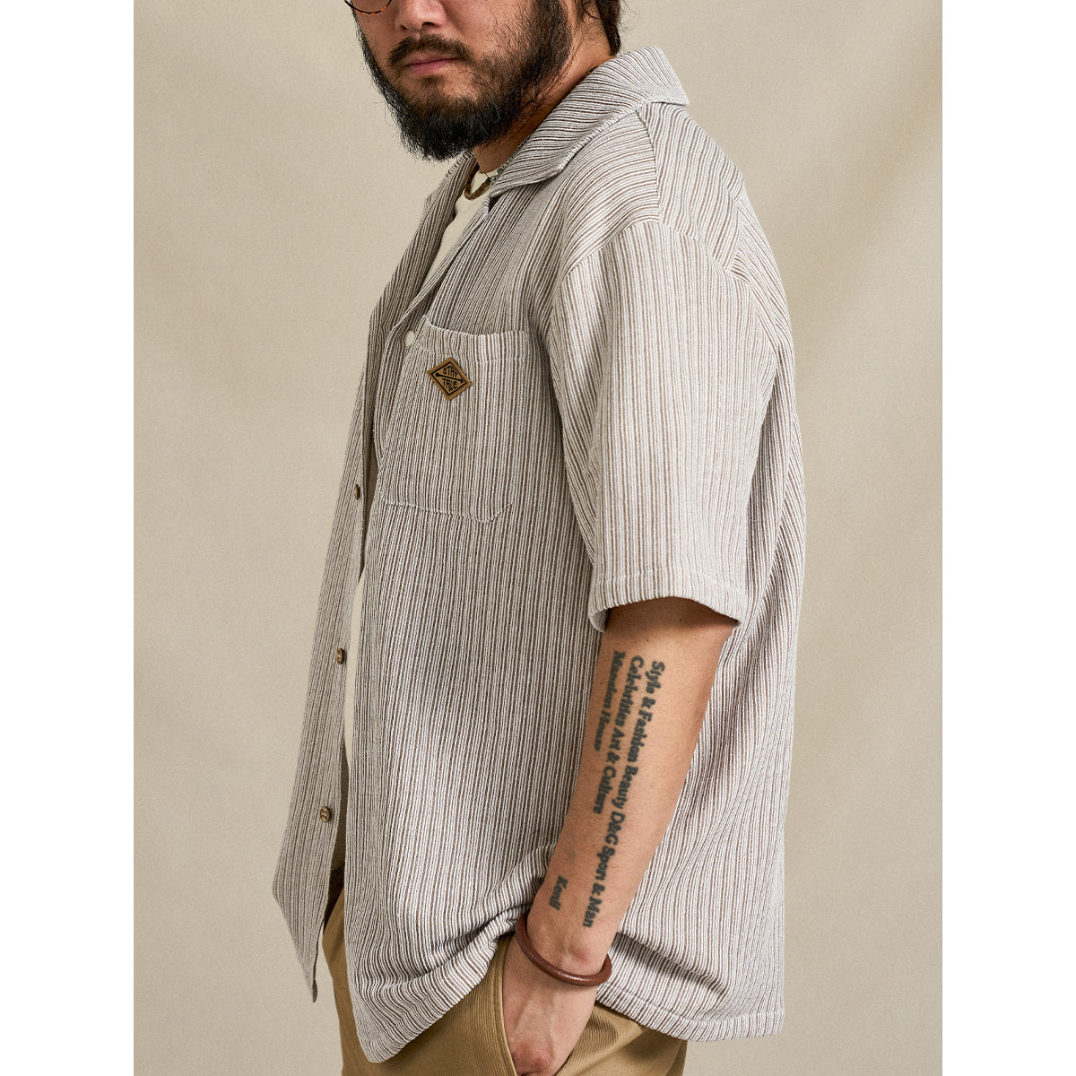 【사전예약】「STAY TRUE」자수 와펜 스트라이프 니트 질감 쿠바 셔츠