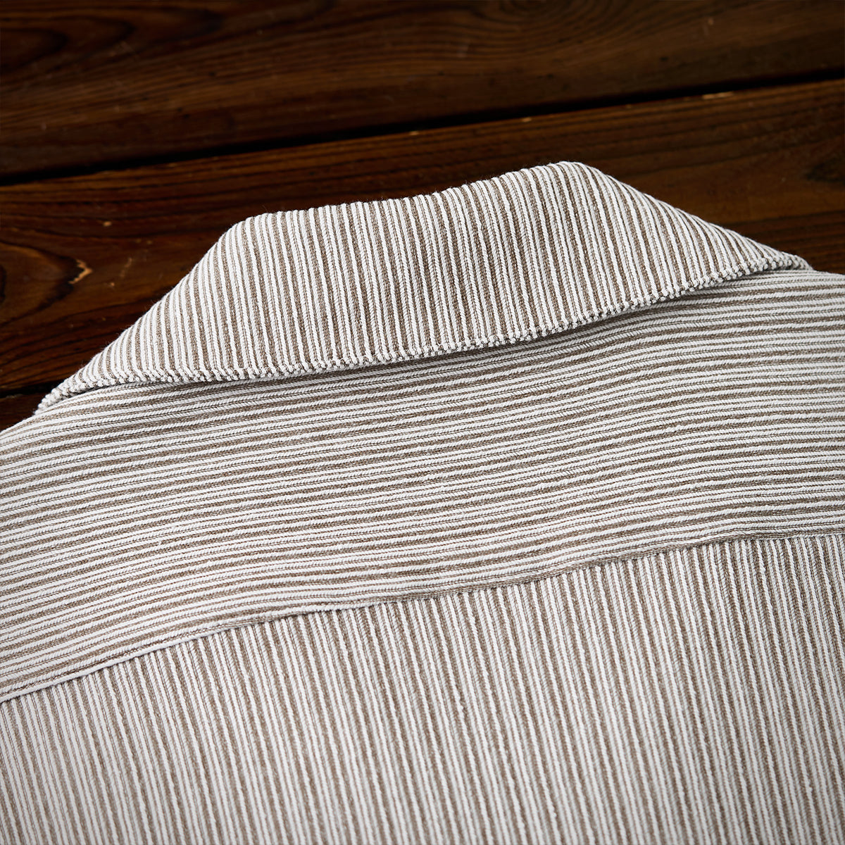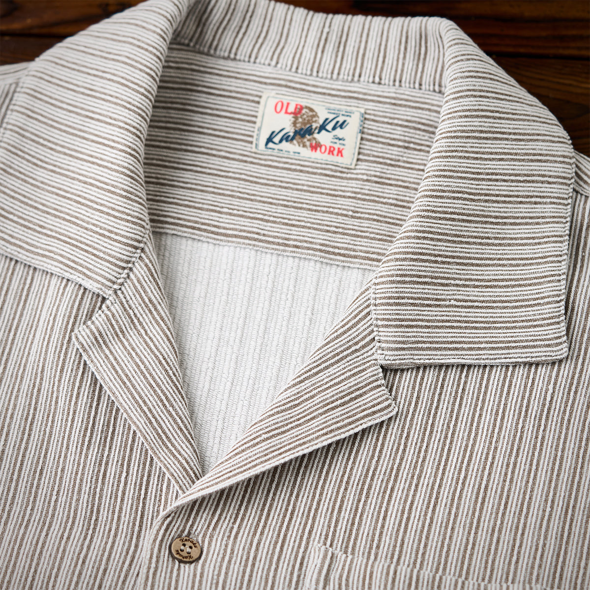 여유로운 오픈 카라와 왼쪽 가슴 자수 와펜, 우드톤 버튼으로 포인트를 더한 스트라이프 쿠바 셔츠. 카키·화이트 배색으로 클래식과 트렌디함을 동시에 연출합니다.