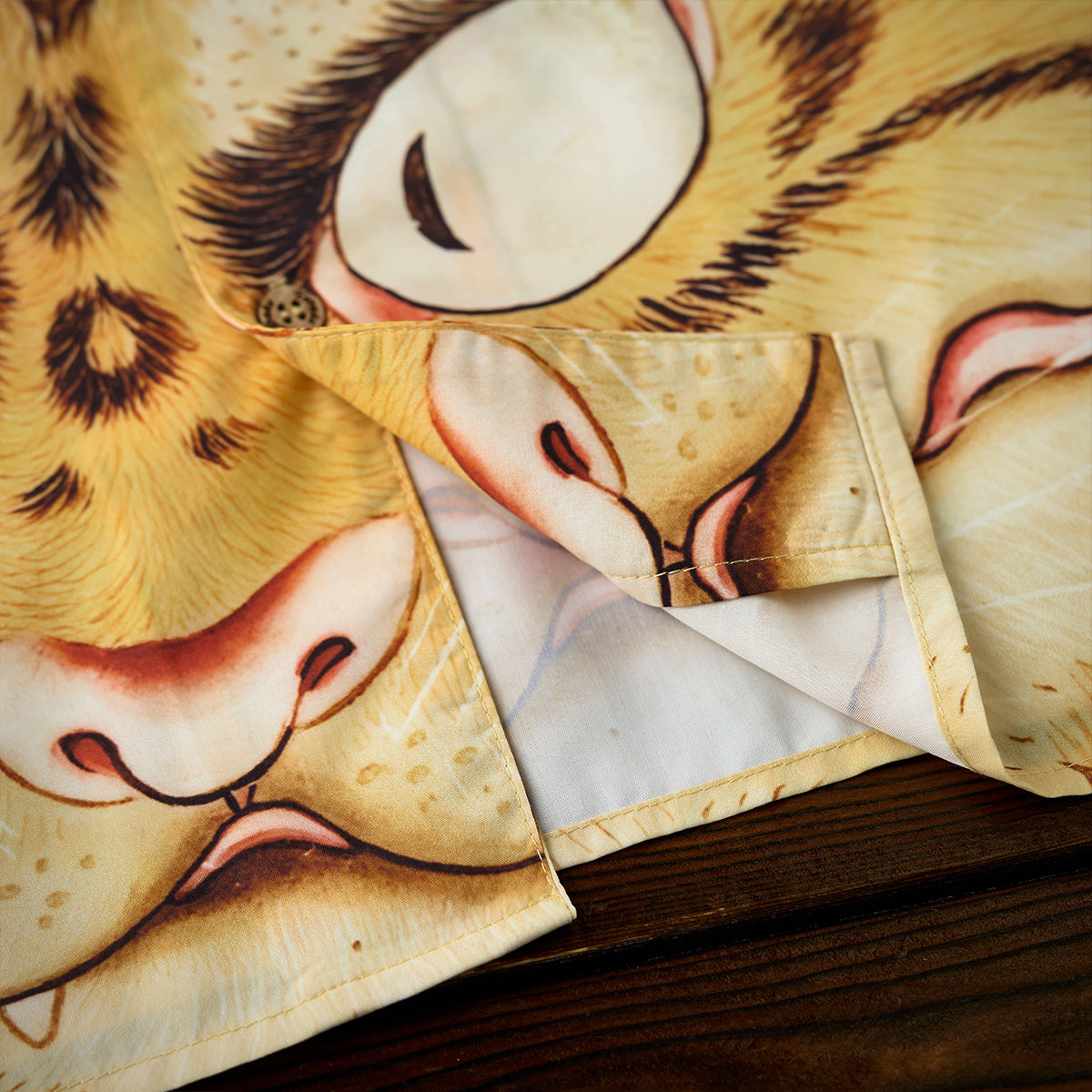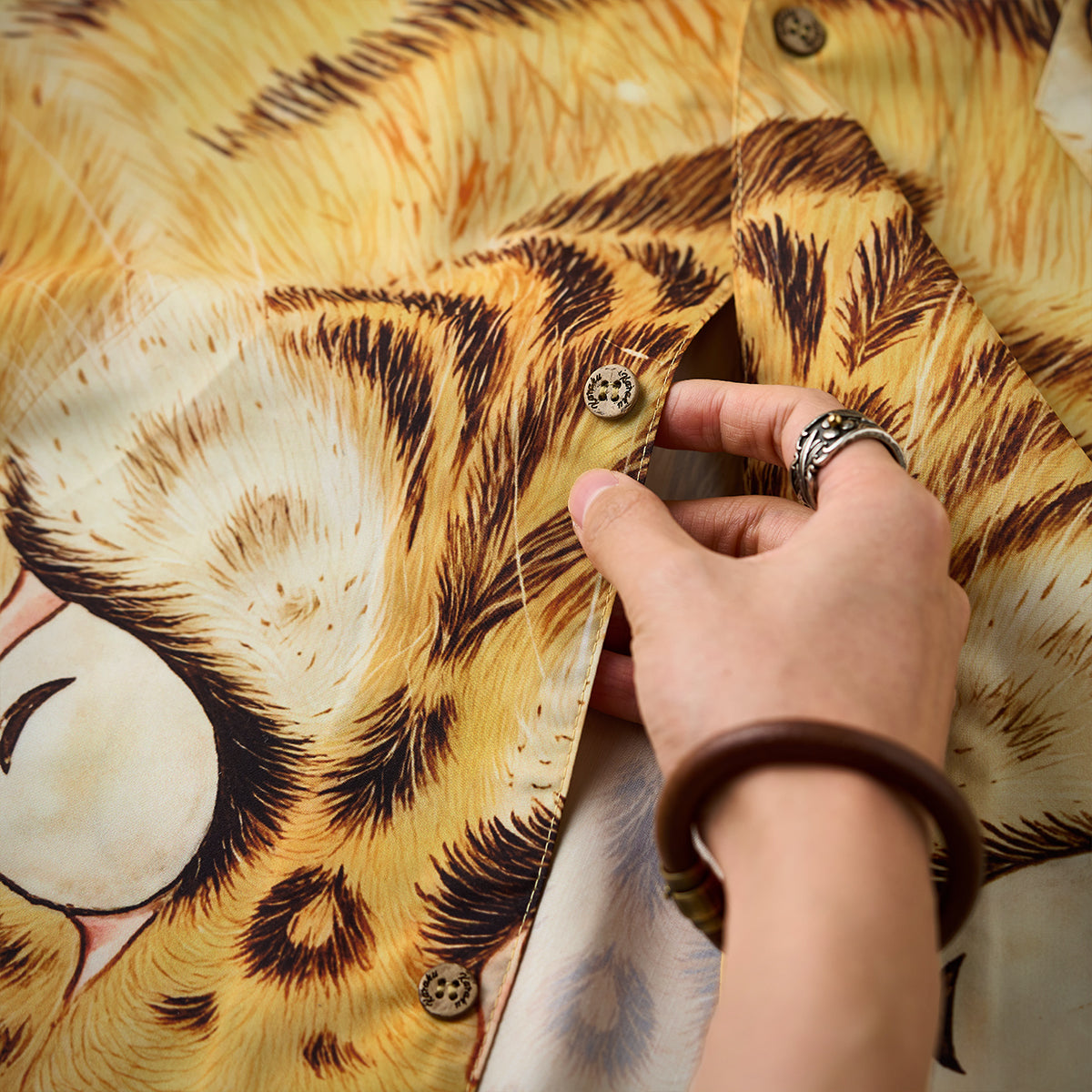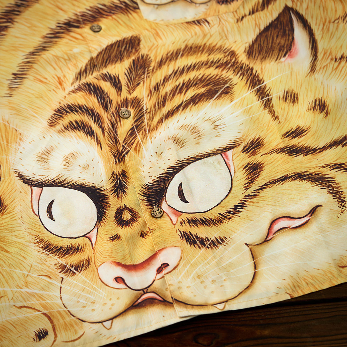 일본 에도 시대(江戸時代) 나가사키파(長崎派) 회화(繪畵)에서 영감을 받아 ‘虎図(호랑이 그림)’을 프린트한 알로하 셔츠로, 역동적인 패턴과 섬세한 선묘가 돋보이는 존재감 있는 디자인입니다.