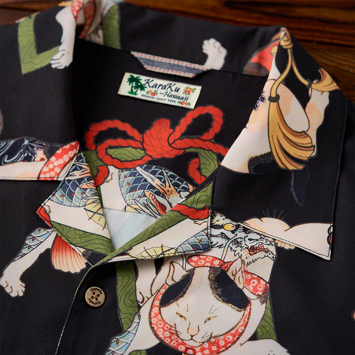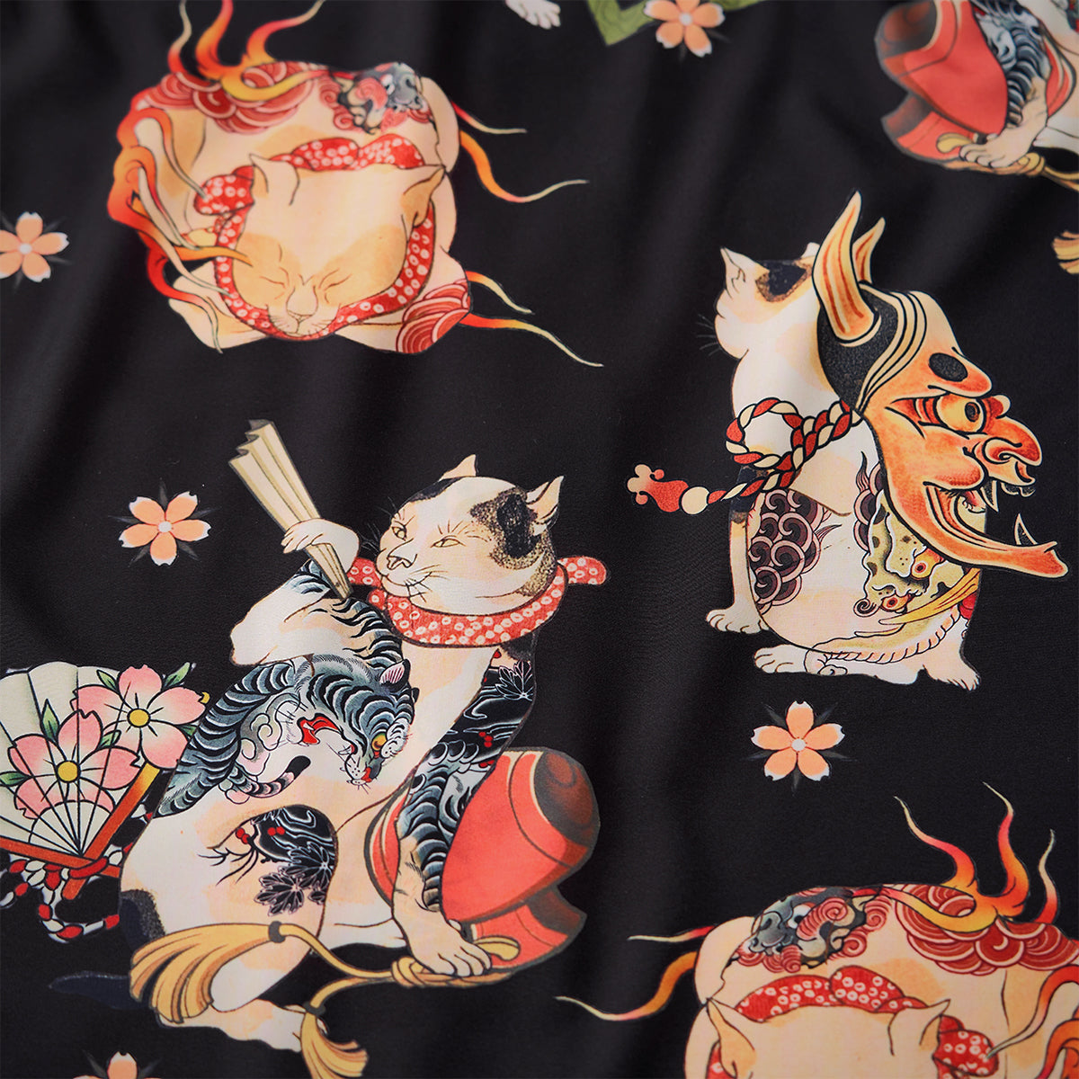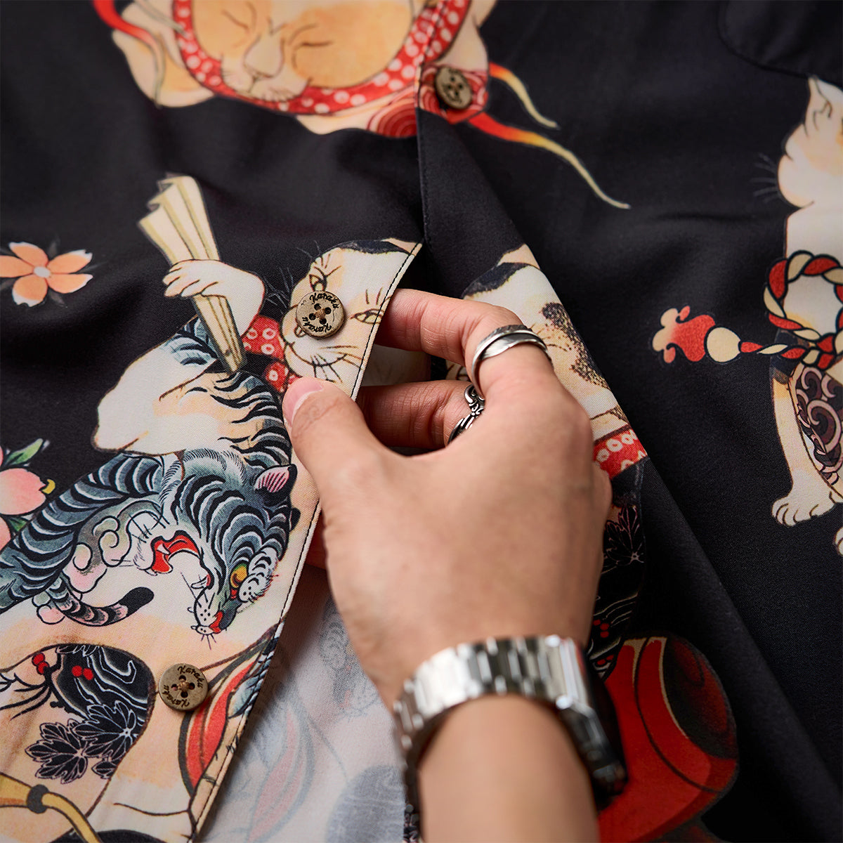 접는 부채, 노(能) 가면, 벚꽃 등 일본 전통 모티브를 담은 다양한 고양이가 셔츠 전체에 펼쳐져 ‘백 가지 모습’을 떠올리게 하는 활기찬 분위기를 연출합니다.