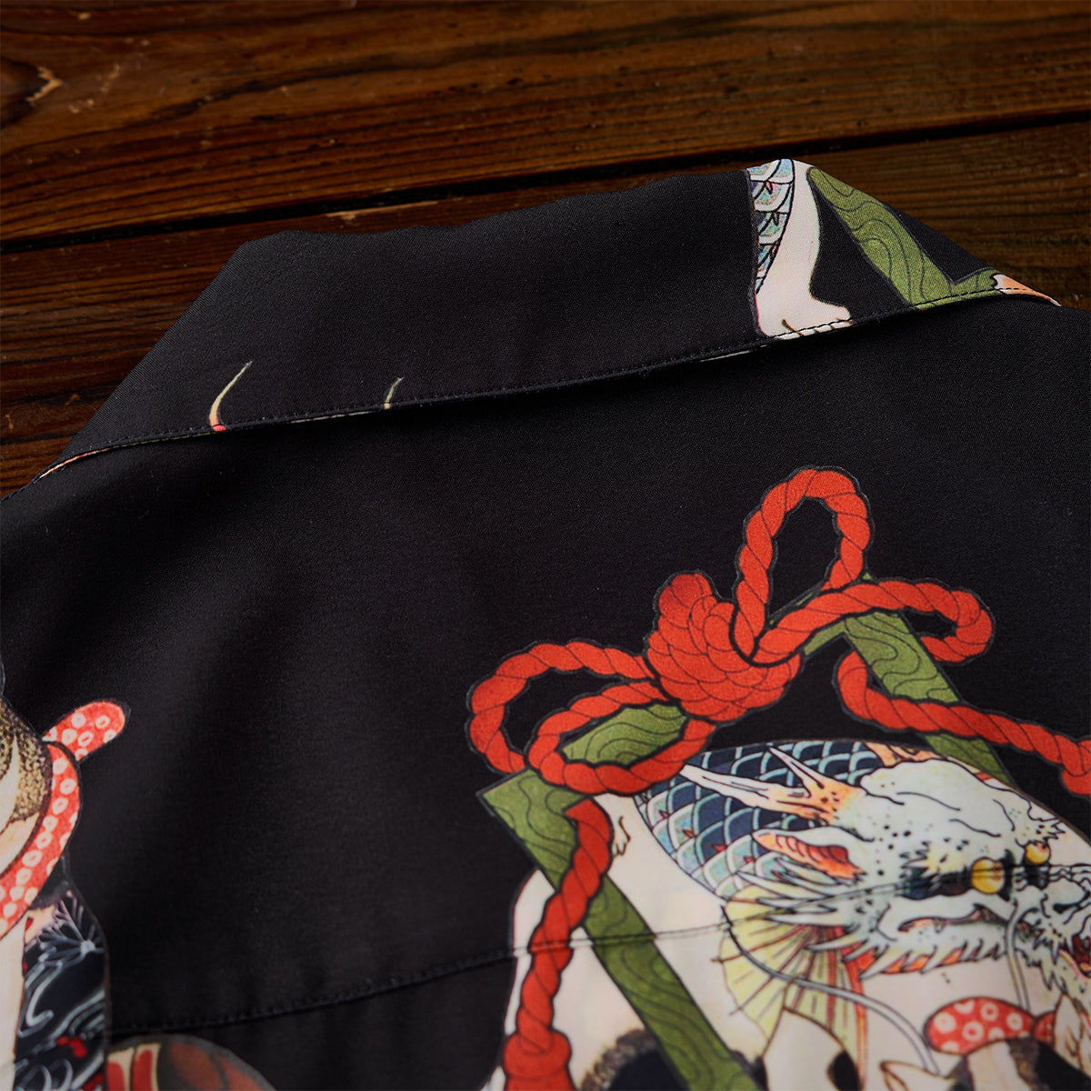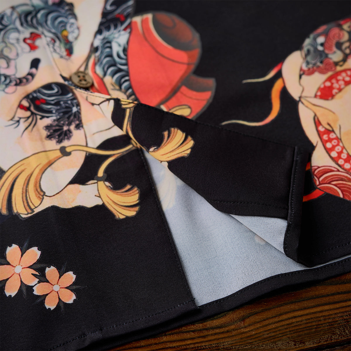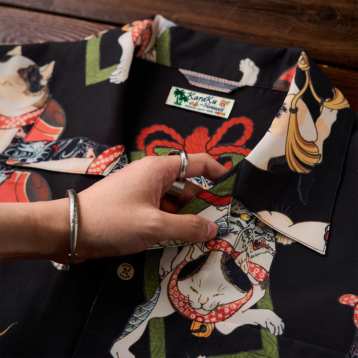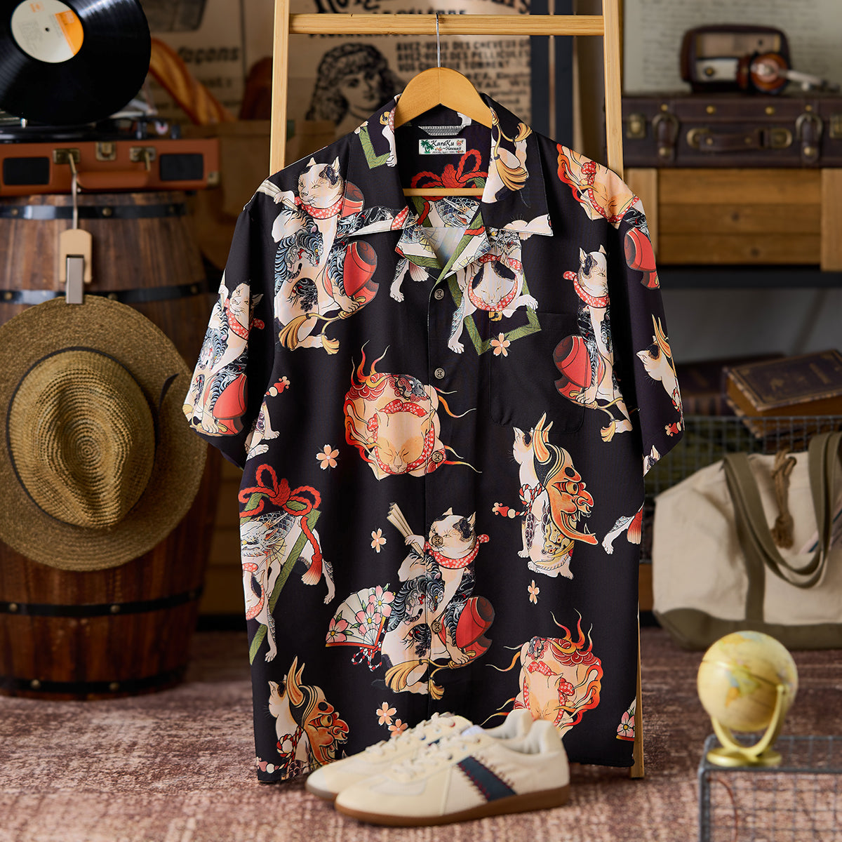 접는 부채, 노(能) 가면, 벚꽃 등 일본 전통 모티브를 담은 다양한 고양이가 셔츠 전체에 펼쳐져 ‘백 가지 모습’을 떠올리게 하는 활기찬 분위기를 연출합니다.