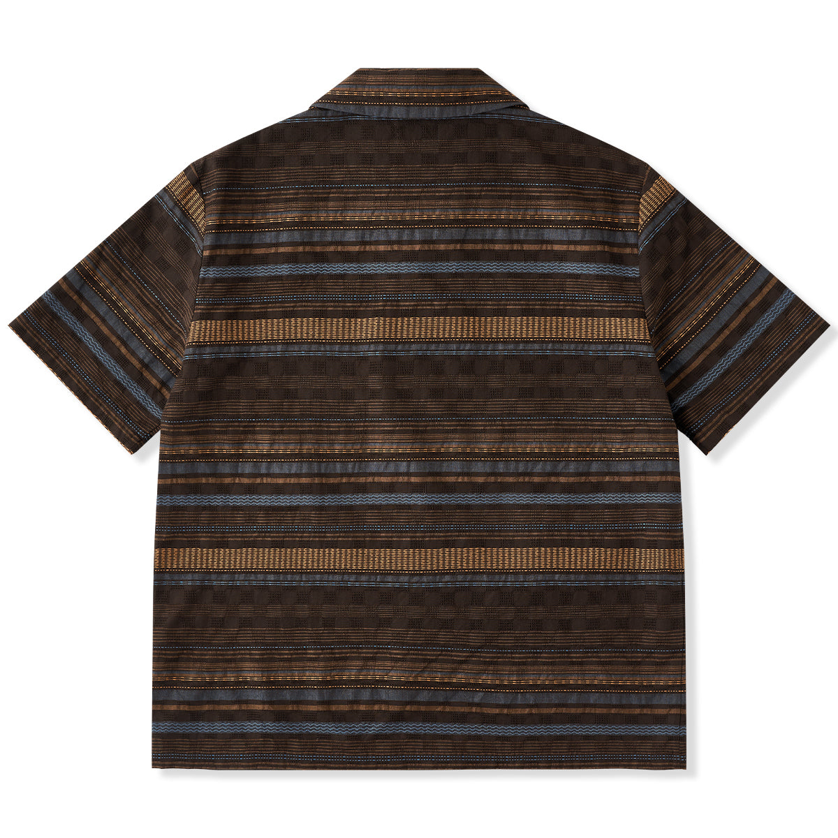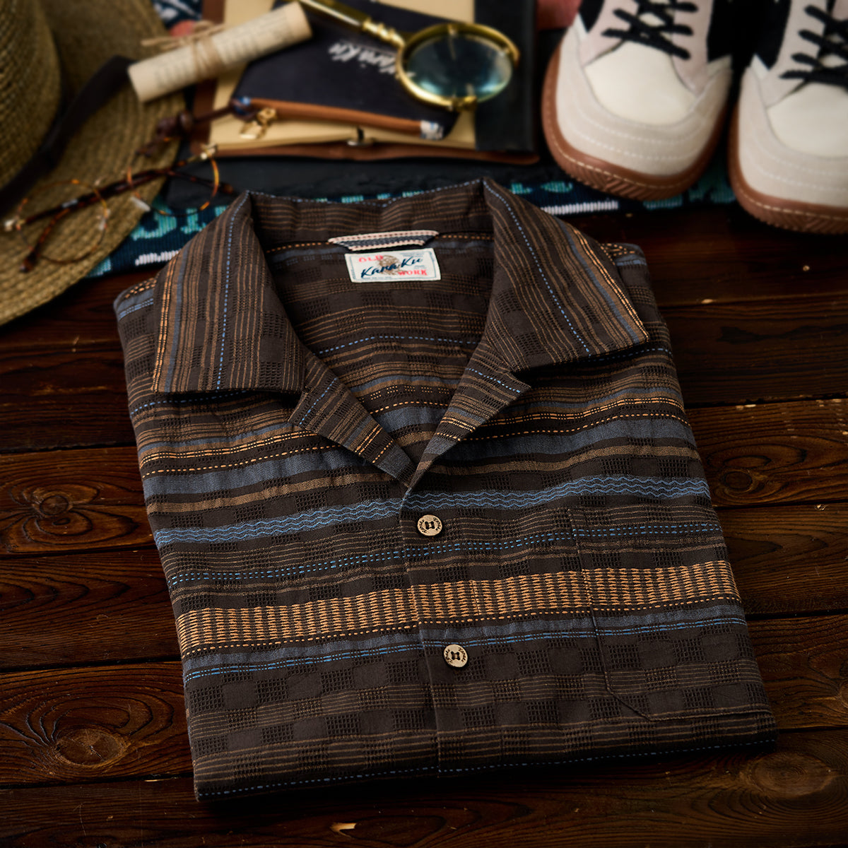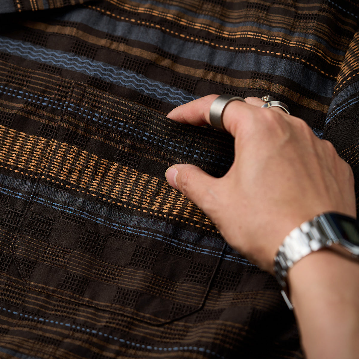스트라이프와 기하학 패턴이 돋보이는 오픈카라 셔츠로, 스퀘어 포켓과 우드톤 버튼이 여유로운 캐주얼 무드를 완성합니다.